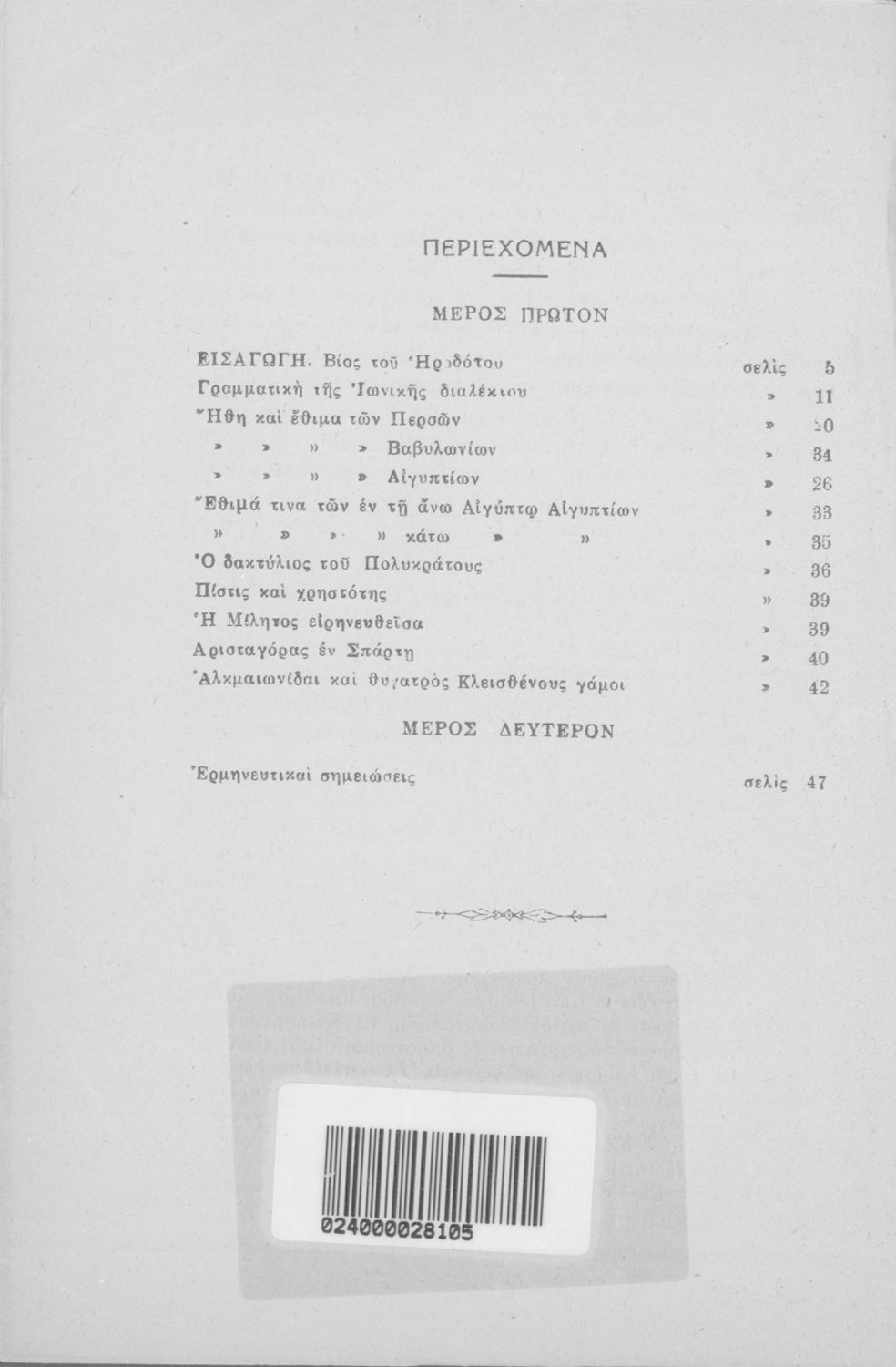 Τίτλος: Ηροδότου Εκλογαί με τα ερμηνευτικών σημειώσεων προς χρήσιν των μαθητών της Γ΄ τάξεως των Γυμνασίων παλαιού τύπου και των αντιστοίχων σχολείων της μ. εκπαιδεύσεως