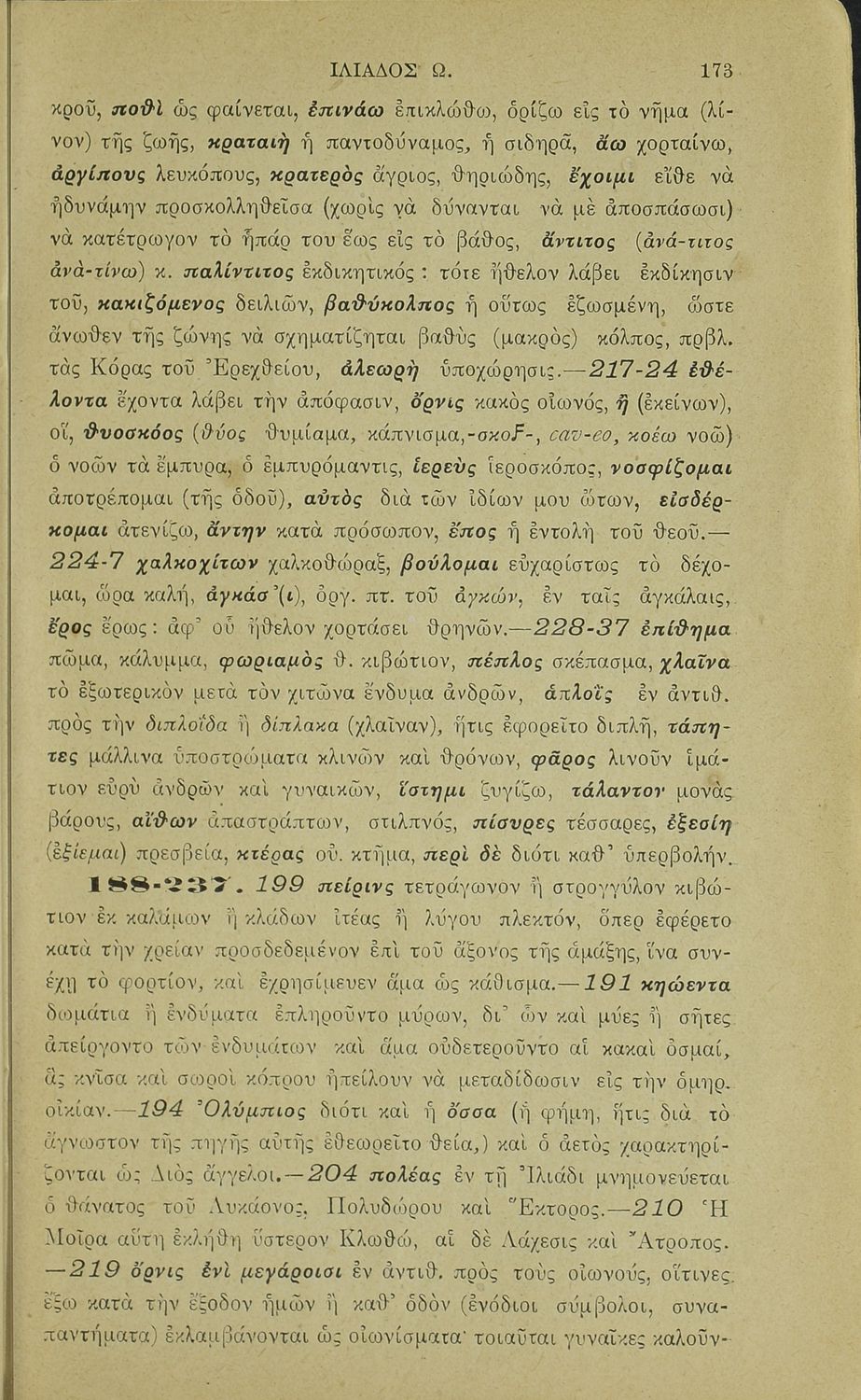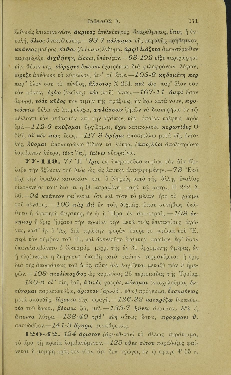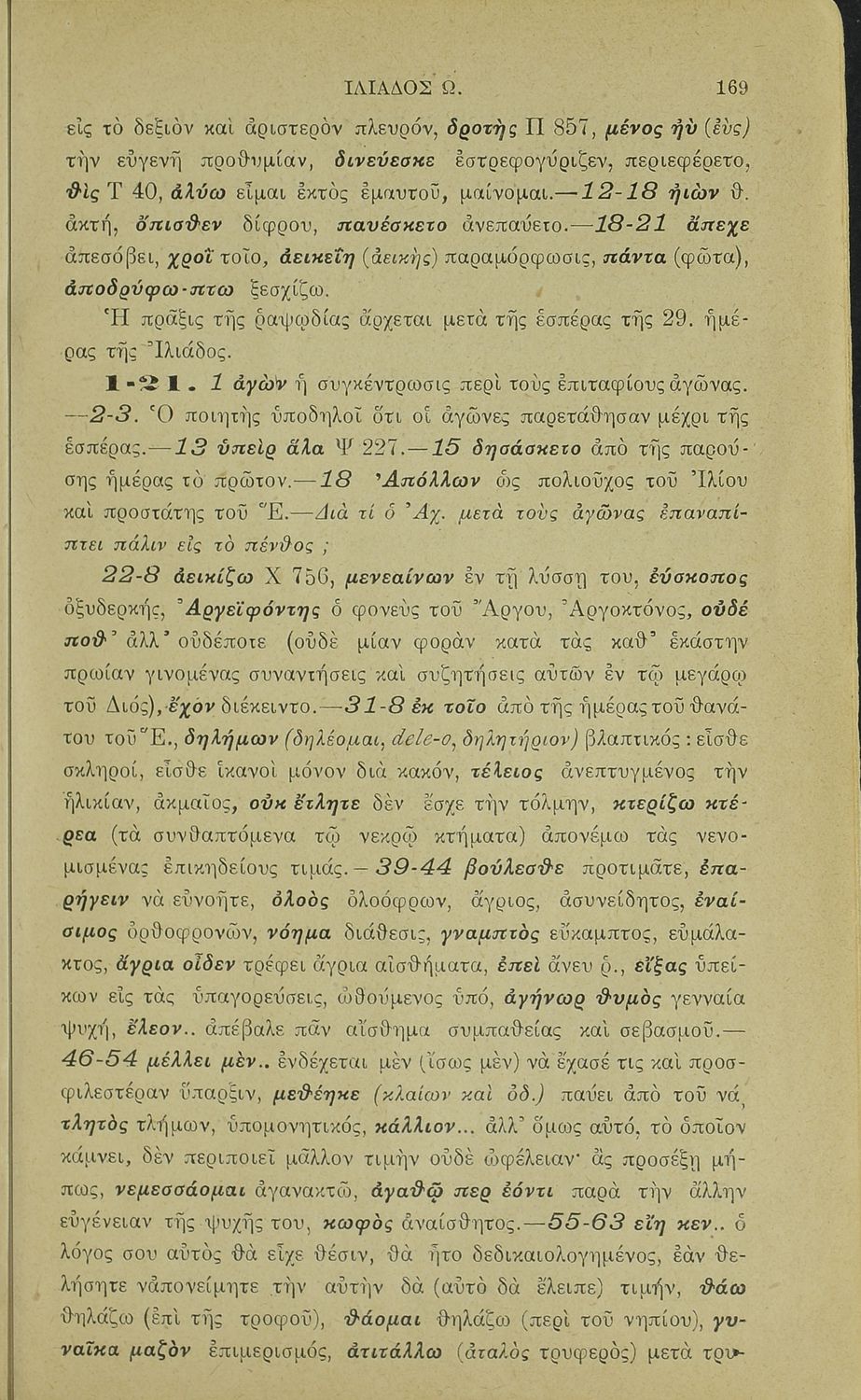 Μαθητικό βοήθημα του Ελληνικού Σχολείου, των Παρθεναγωγείων και του Γυμνασίου για το μάθημα των Αρχαίων Ελληνικών. Περιέχει τις ραψωδίες Ο, Π, Ρ, Σ, Τ, Χ, ψ, Ω από το πρωτότυπο με σχόλια και ερμηνευτικές ...