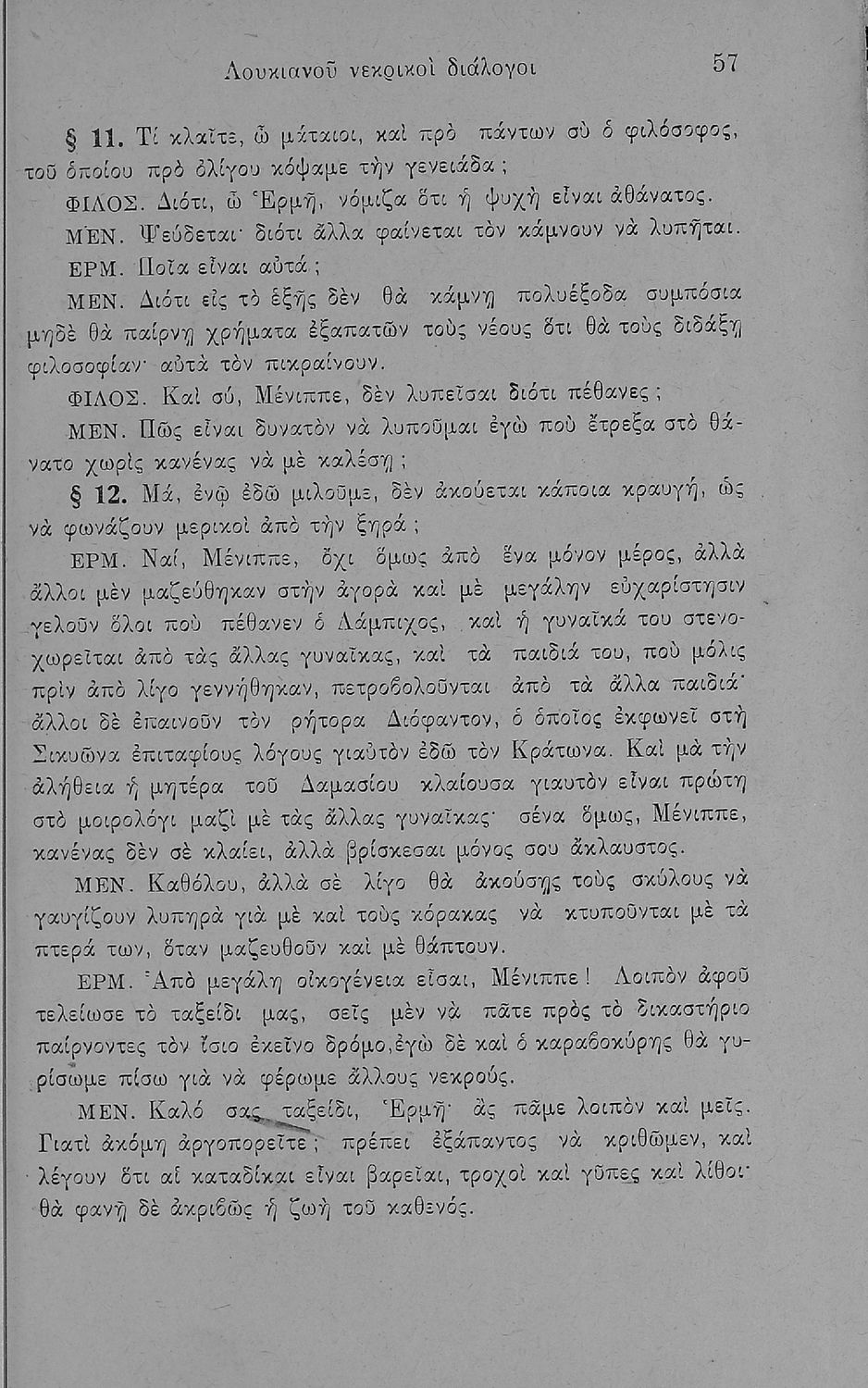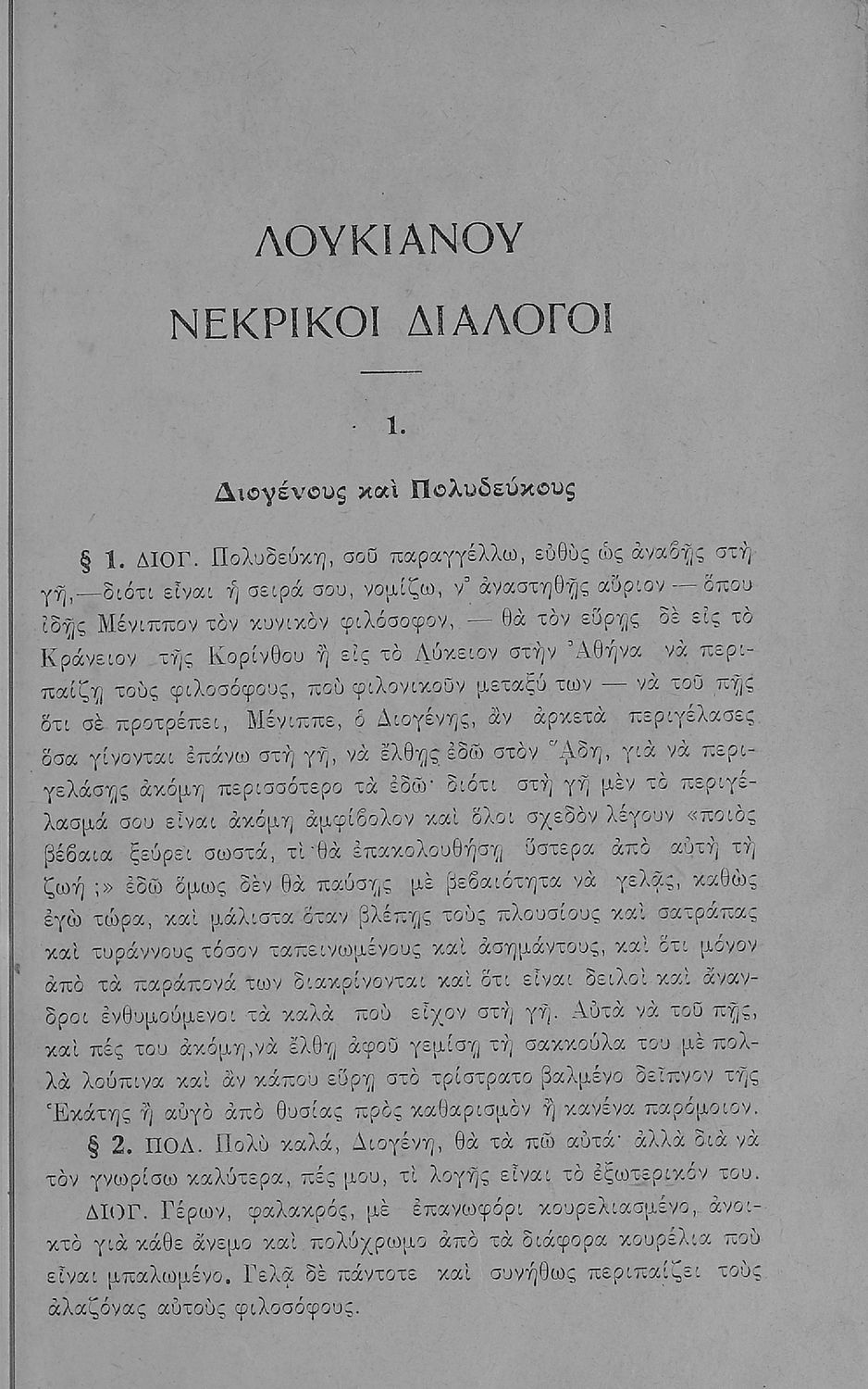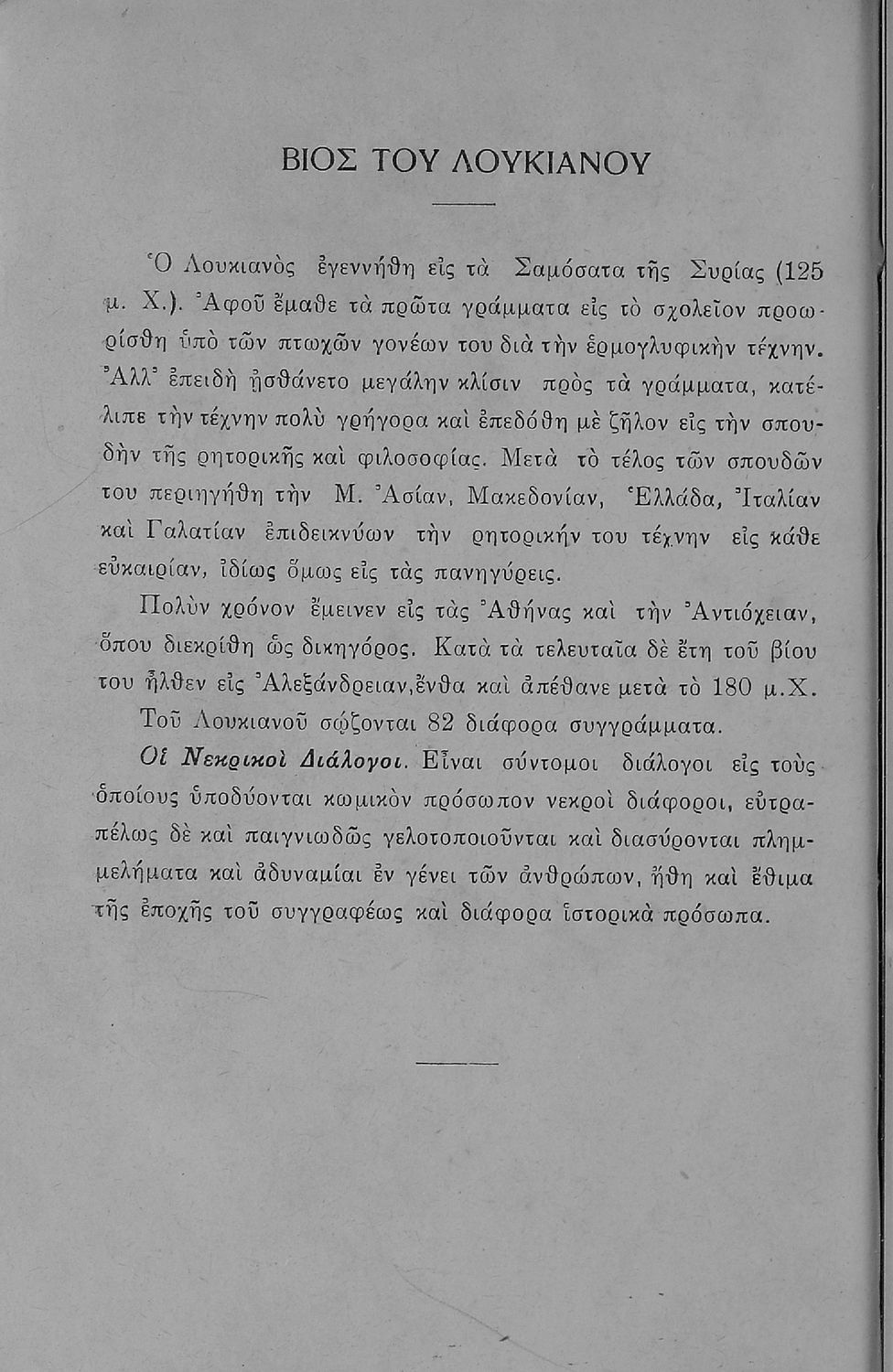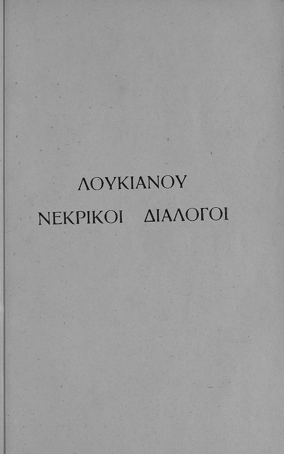 Σχολικό εγχειρίδιο Αρχαίων Ελληνικών για την Α΄ τάξη των Ημιγυμνασίων και Εξαταξίων Γυμνασίων που περιέχει αποσπάσματα από τους Νεκρικούς Διαλόγους του Λουκιανού και ετυμολογικές και πραγματολογικές σημειώσεις.