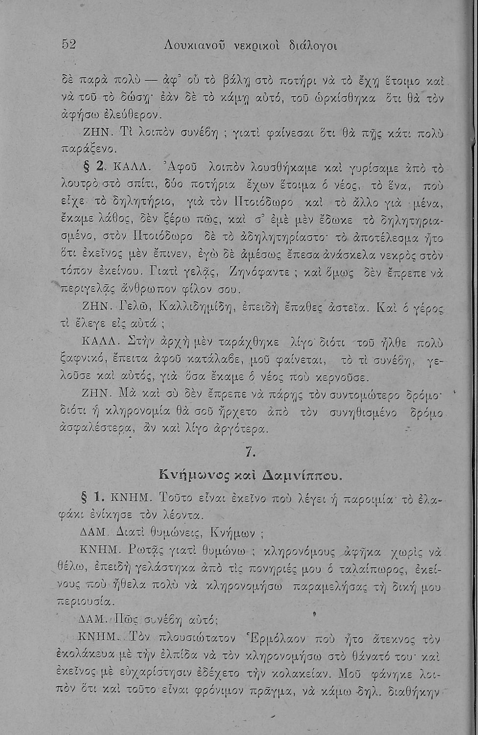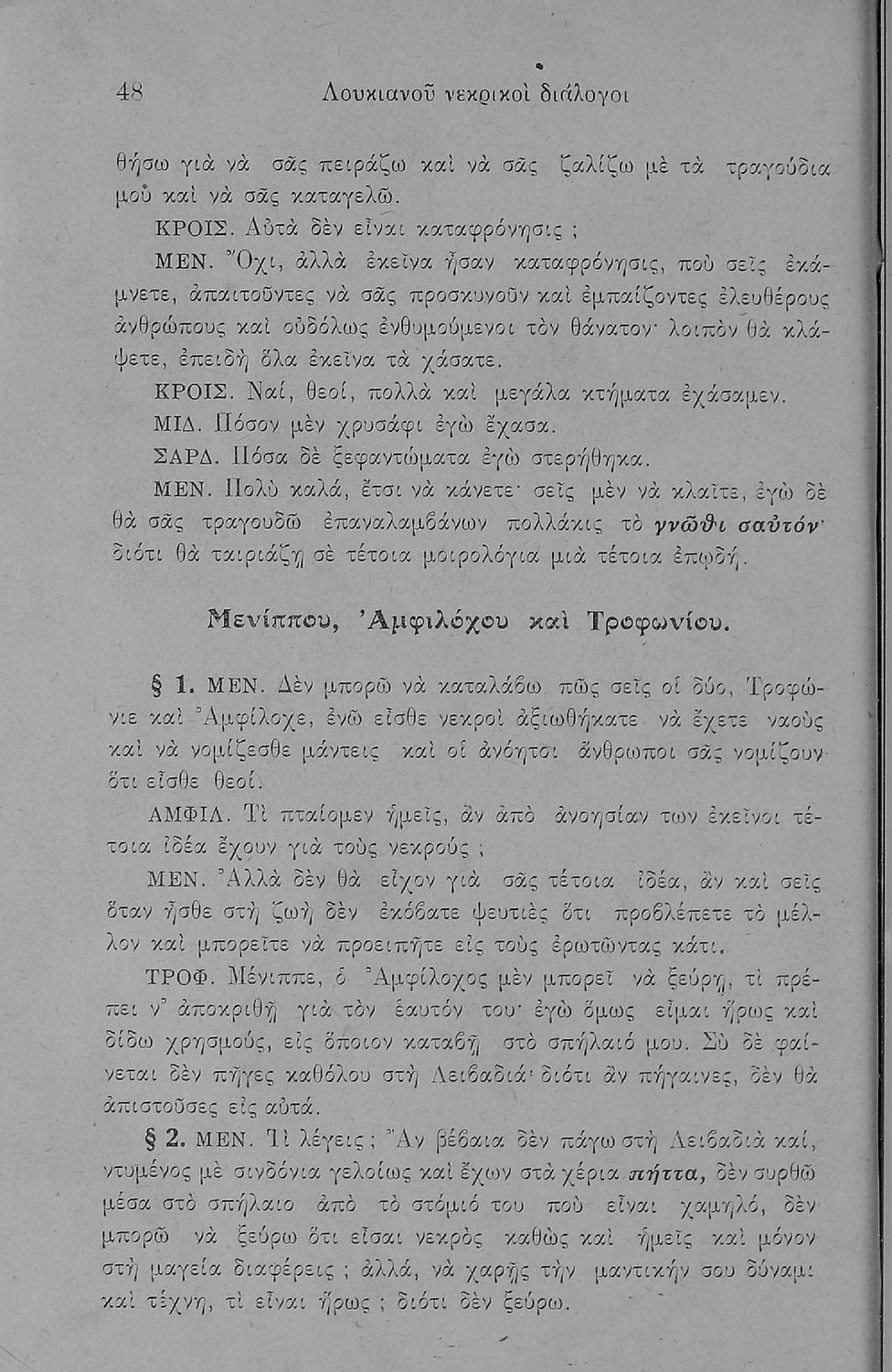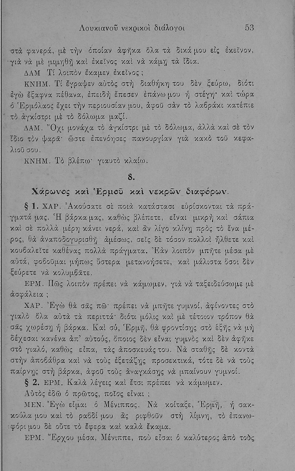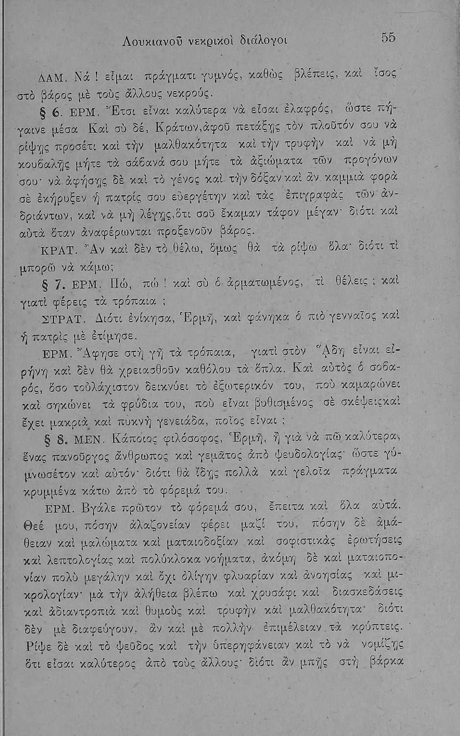 Σχολικό εγχειρίδιο Αρχαίων Ελληνικών για την Α΄ τάξη των Ημιγυμνασίων και Εξαταξίων Γυμνασίων που περιέχει αποσπάσματα από τους Νεκρικούς Διαλόγους του Λουκιανού και ετυμολογικές και πραγματολογικές σημειώσεις.