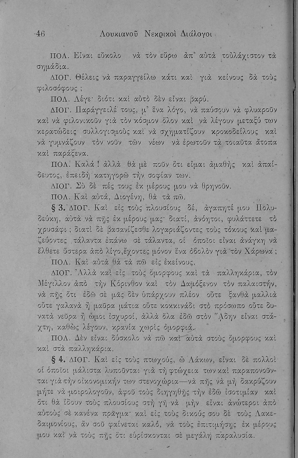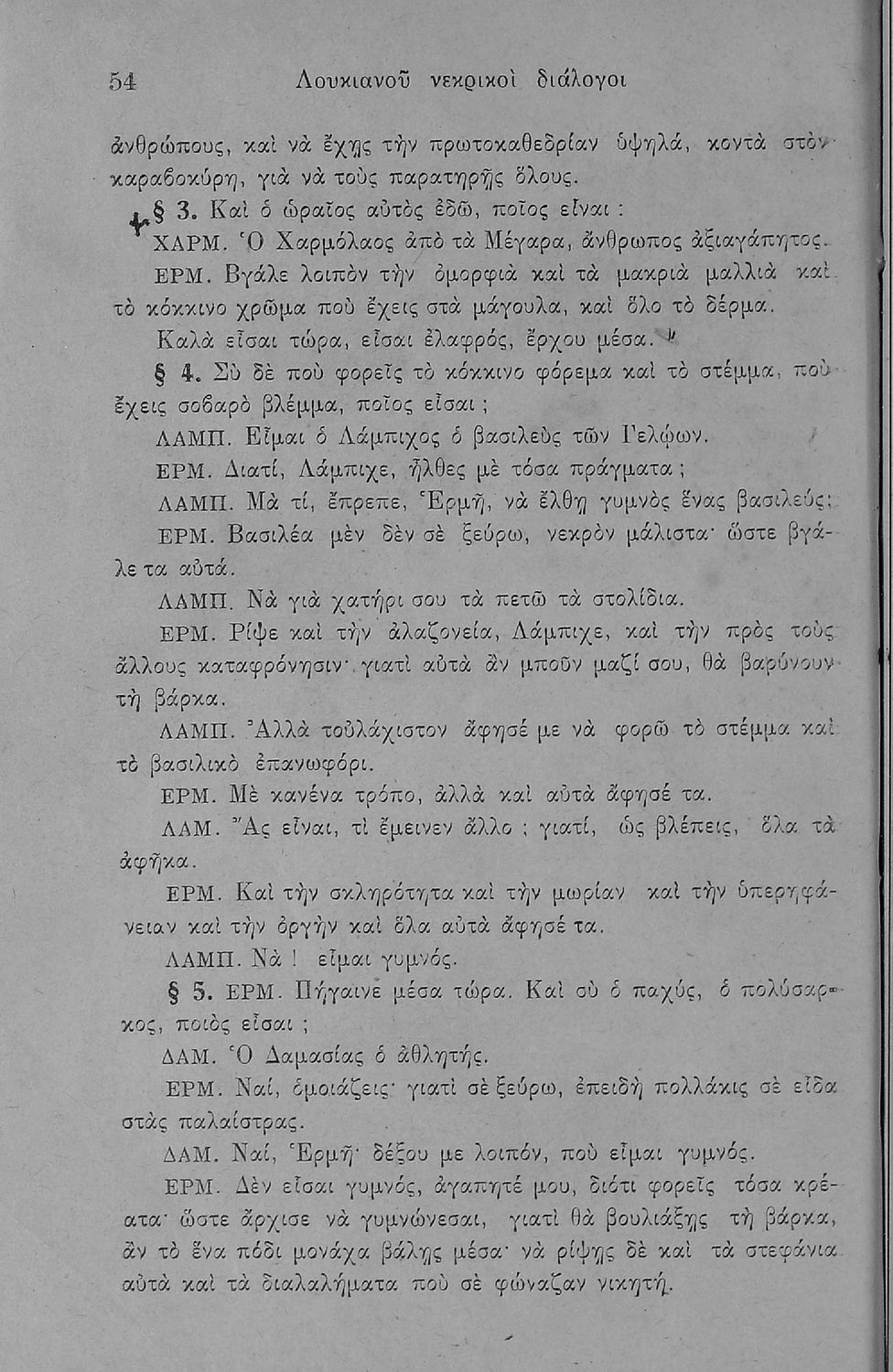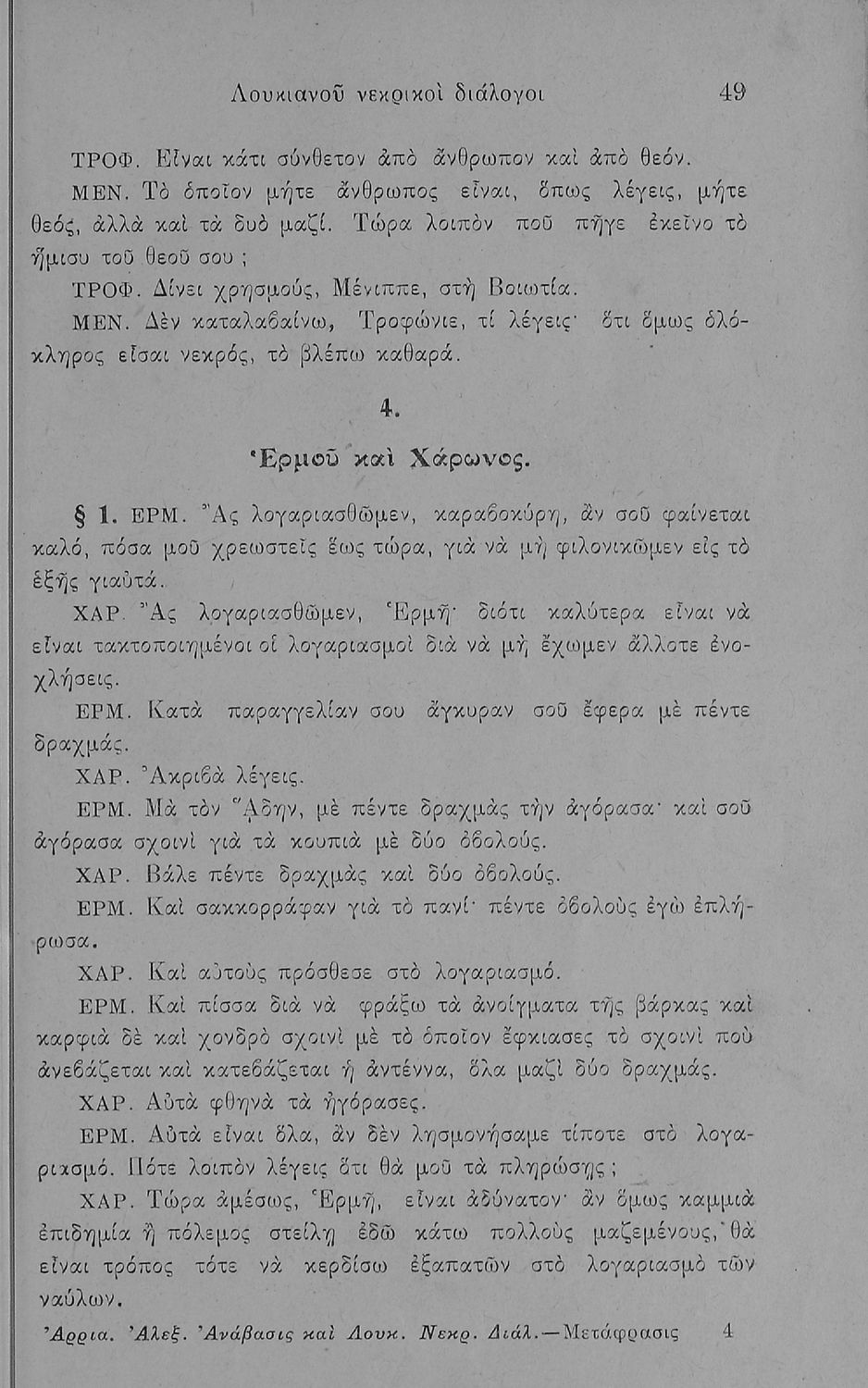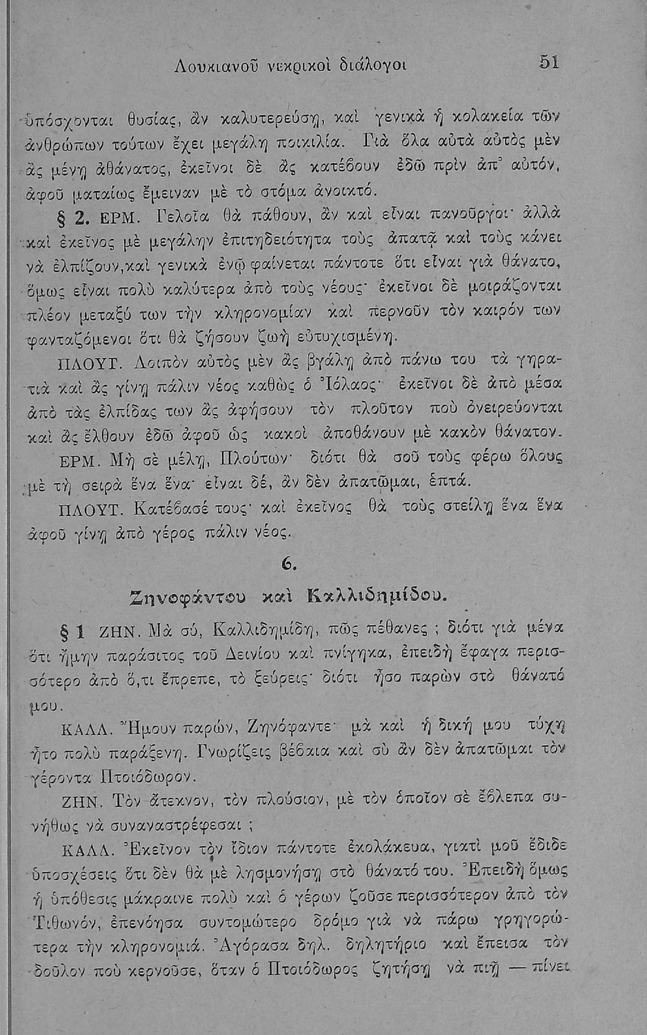Σχολικό εγχειρίδιο Αρχαίων Ελληνικών για την Α΄ τάξη των Ημιγυμνασίων και Εξαταξίων Γυμνασίων που περιέχει αποσπάσματα από τους Νεκρικούς Διαλόγους του Λουκιανού και ετυμολογικές και πραγματολογικές σημειώσεις.