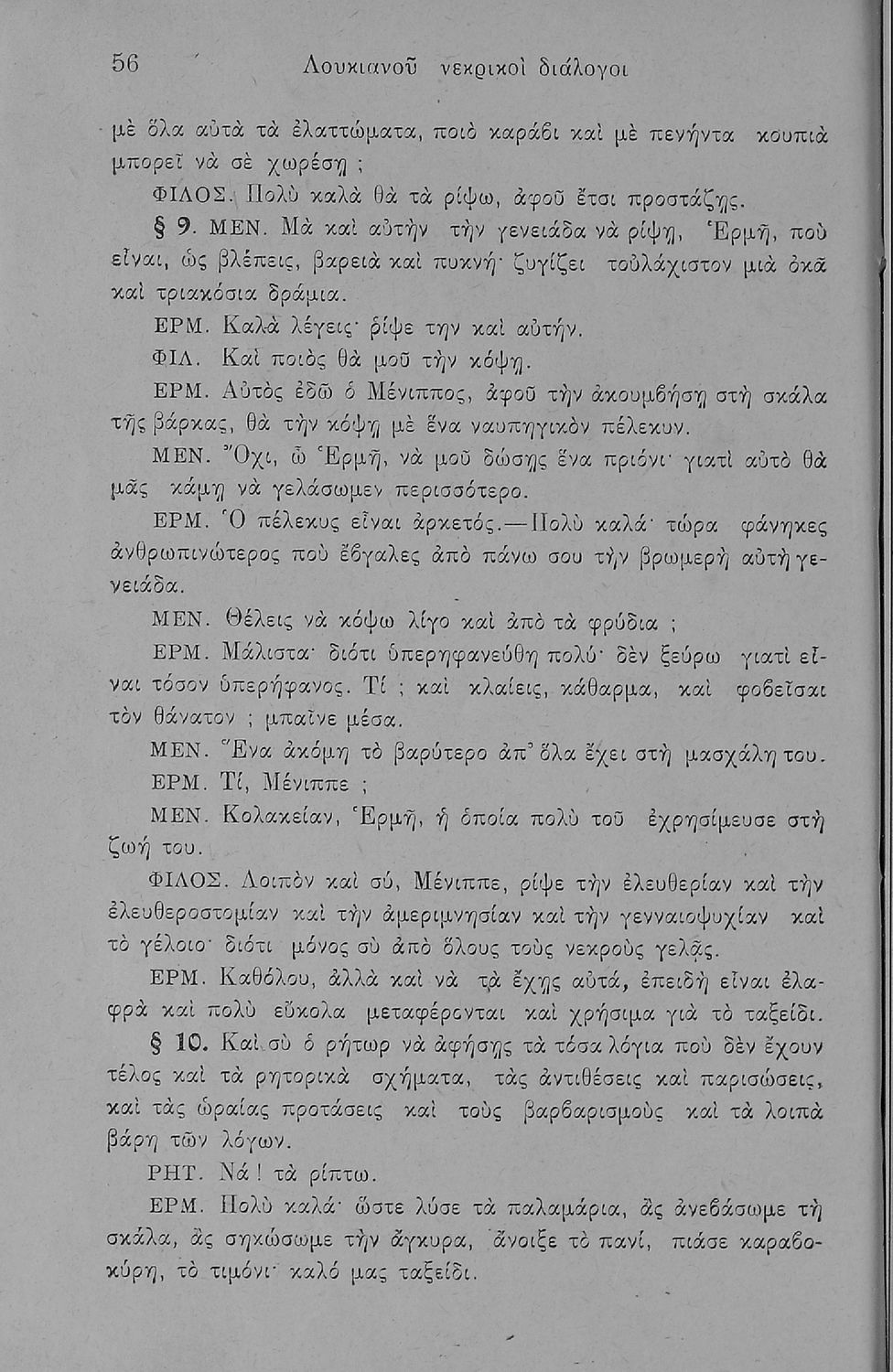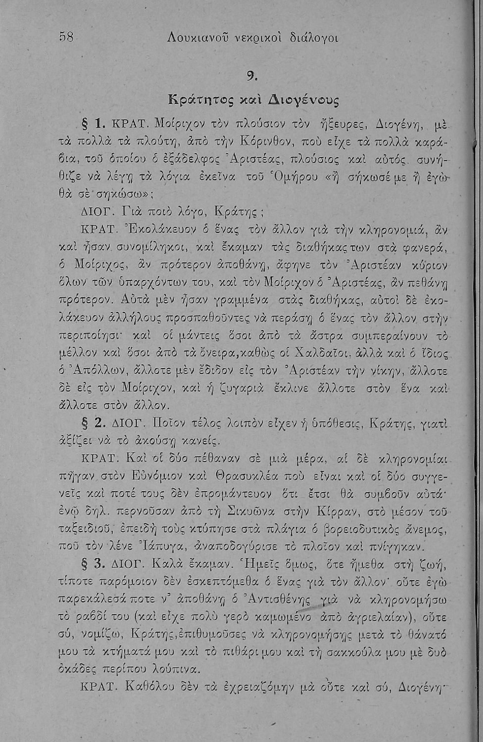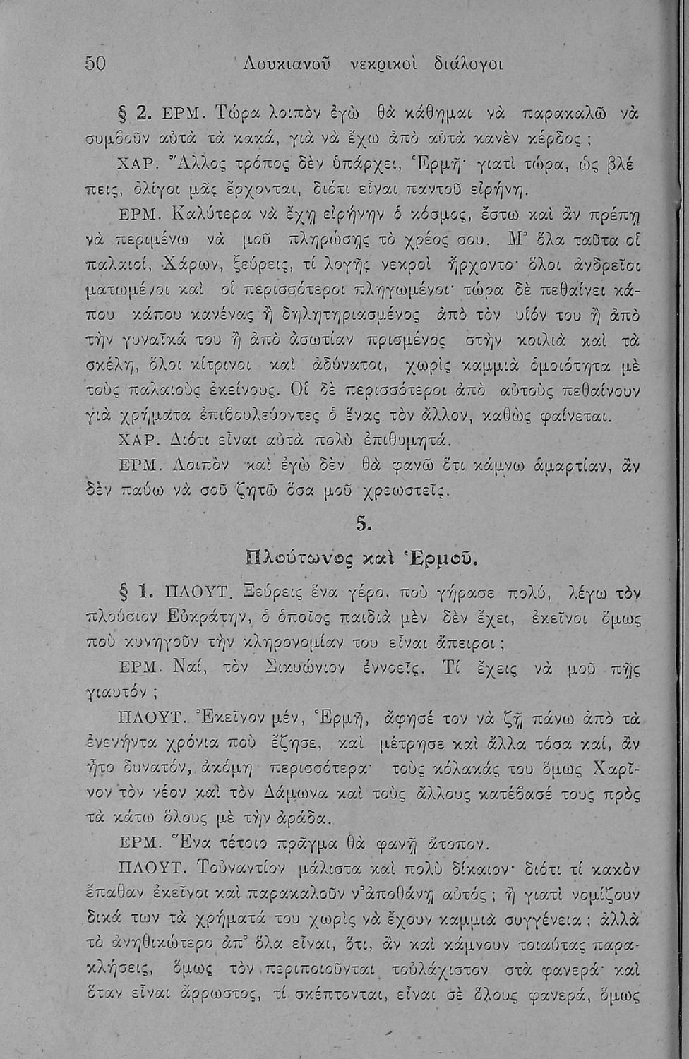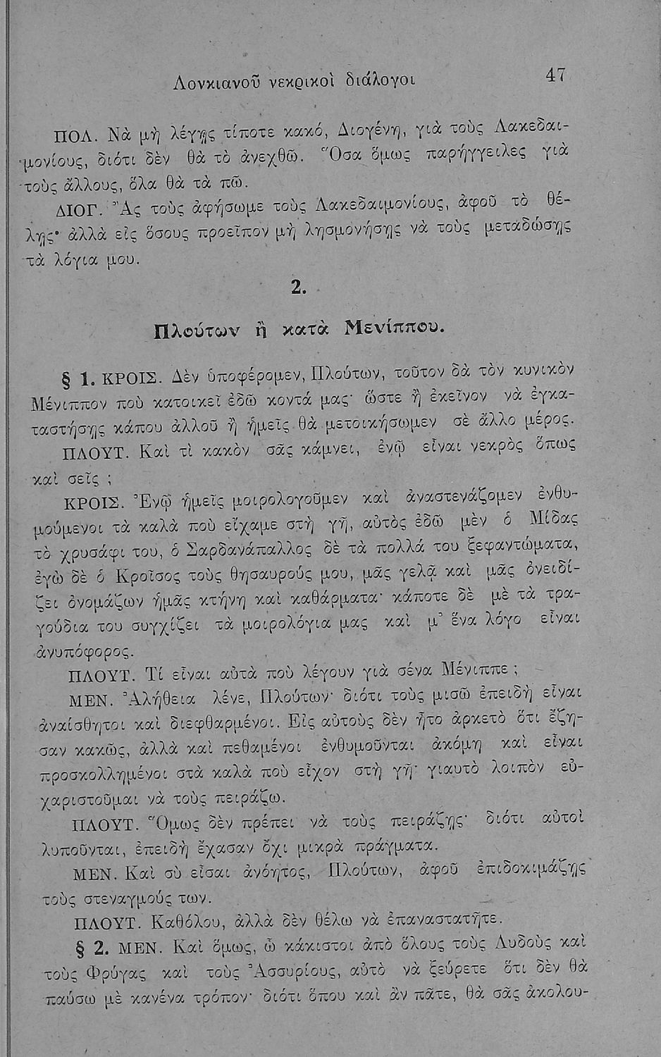 Σχολικό εγχειρίδιο Αρχαίων Ελληνικών για την Α΄ τάξη των Ημιγυμνασίων και Εξαταξίων Γυμνασίων που περιέχει αποσπάσματα από τους Νεκρικούς Διαλόγους του Λουκιανού και ετυμολογικές και πραγματολογικές σημειώσεις.