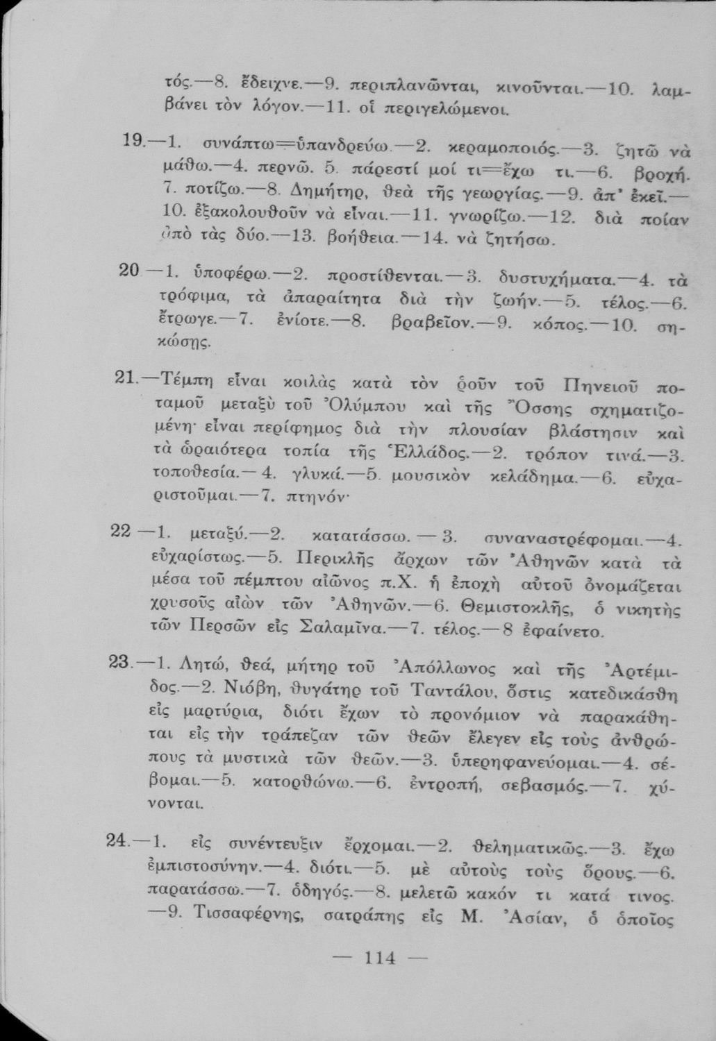 Βαθμίδα εκπαίδευσης: Δευτεροβάθμια Τάξη: Α' Γυμνασίου / Β' Γυμνασίου Μάθημα: Αρχαία Ελληνικά Γλώσσα: Καθαρεύουσα Παρουσίαση περιεχομένου: Σχολικό εγχειρίδιο Αρχαίων Ελληνικών για τις Α΄ και Β΄ τάξεις των Εξαταξίων Γυμνασίων που περιλαμβάνει σύντομα κείμενα εμπνευσμένα από την αρχαία ελληνική ιστορία και μυθολογία που χρησιμοποιούνται για τη διδασκαλία γραμματικών και συντακτικών φαινομένων καθώς και ερμηνευτικές σημειώσεις. |