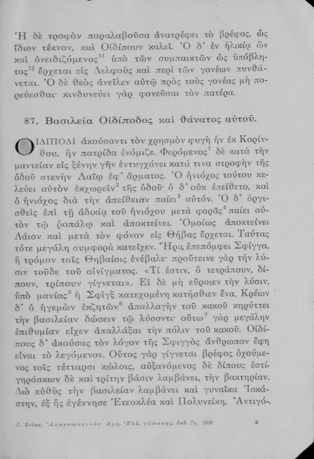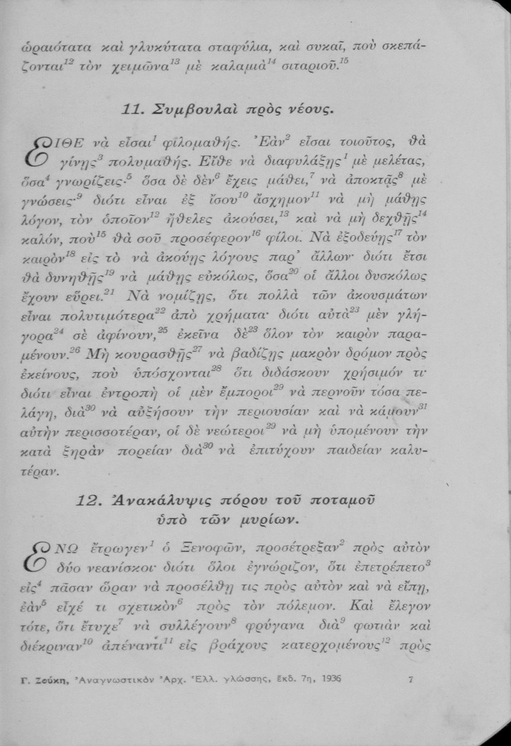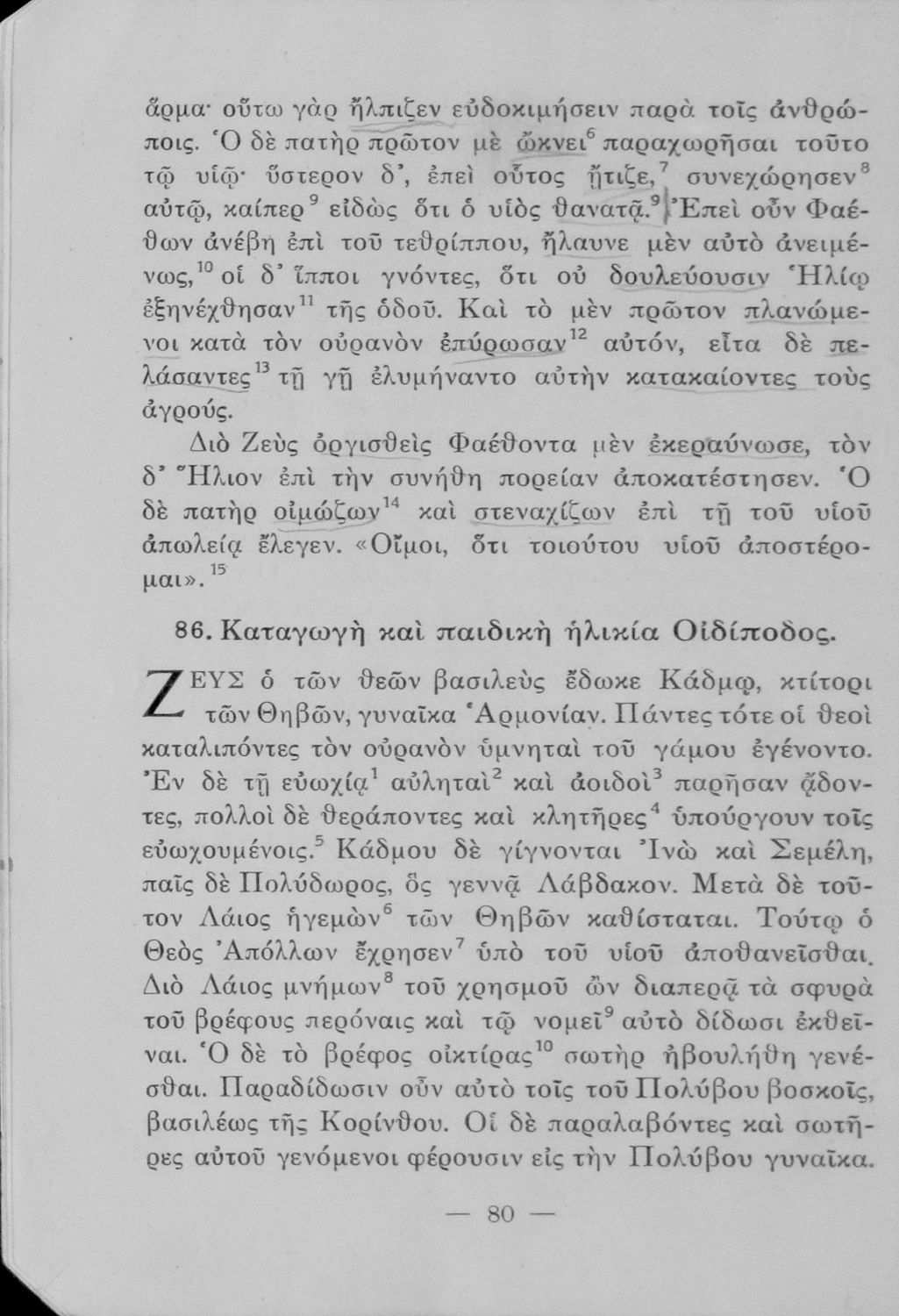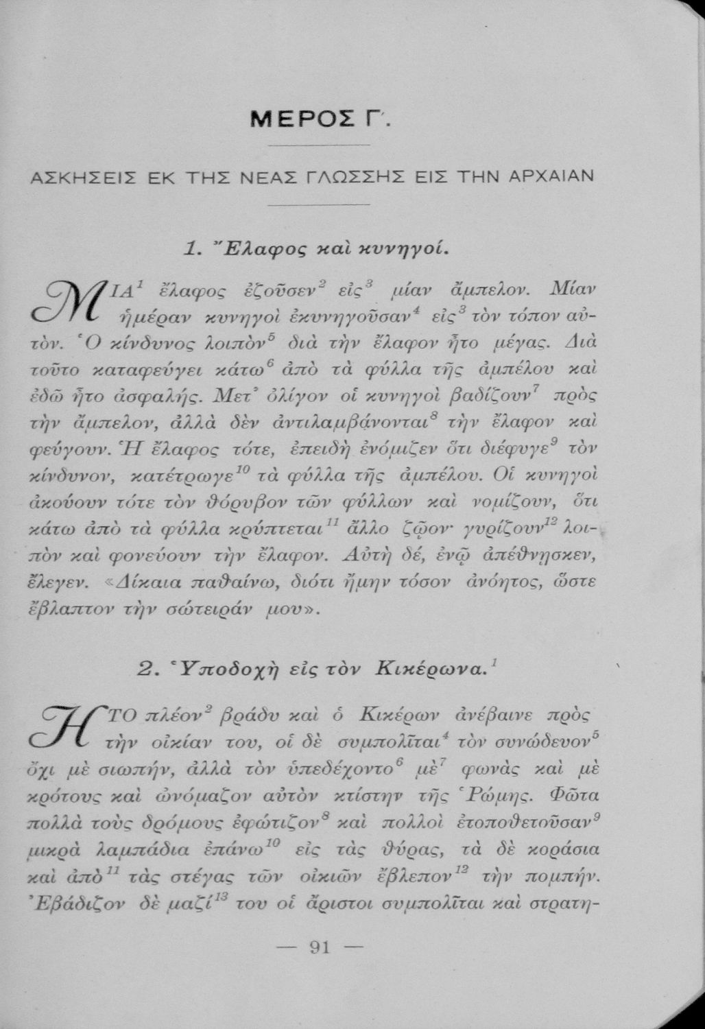 Σχολικό εγχειρίδιο Αρχαίων Ελληνικών για τις Α΄ και Β΄ τάξεις των Εξαταξίων Γυμνασίων που περιλαμβάνει σύντομα κείμενα εμπνευσμένα από την αρχαία ελληνική ιστορία και μυθολογία που χρησιμοποιούνται για τη διδασκαλία γραμματικών και συντακτικών φαινομένων καθώς και ερμηνευτικές σημειώσεις.