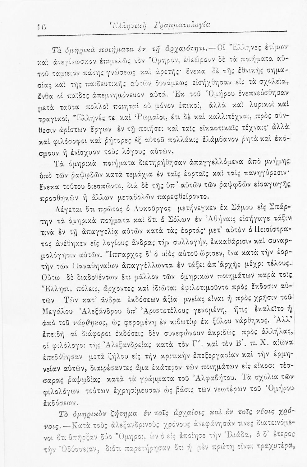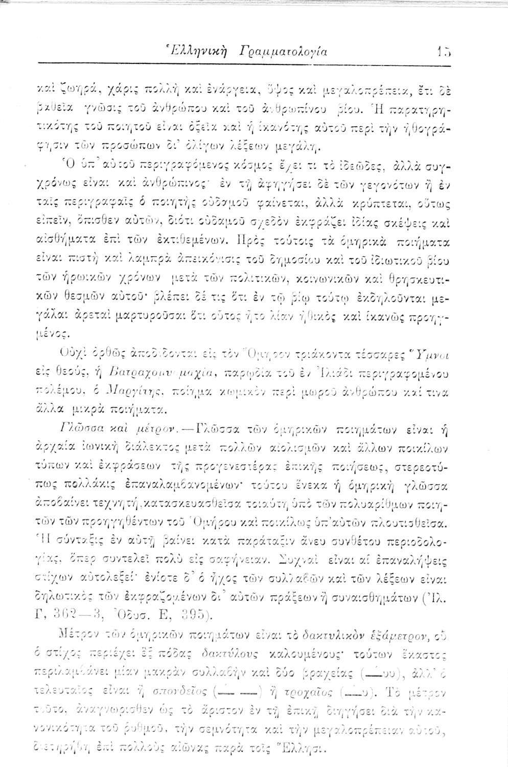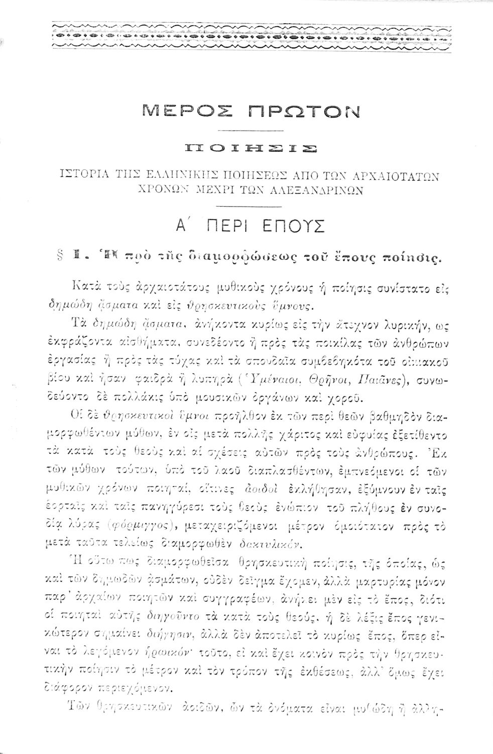 Βαθμίδα εκπαίδευσης: Δευτεροβάθμια Τάξη: Γυμνάσιο Μάθημα: Νέα Ελληνικά Γλώσσα: Καθαρεύουσα Παρουσίαση περιεχομένου: Σχολικό εγχειρίδιο Αρχαίων και Νέων Ελληνικών για το Γυμνάσιο που εξετάζει την εξέλιξη της ποίησης και του πεζού λόγου κατά την Αρχαϊκή, Κλασσική, Αλεξανδρινή και Ρωμαϊκή και Βυζαντινή περίοδο. |