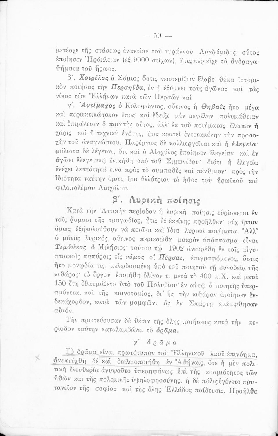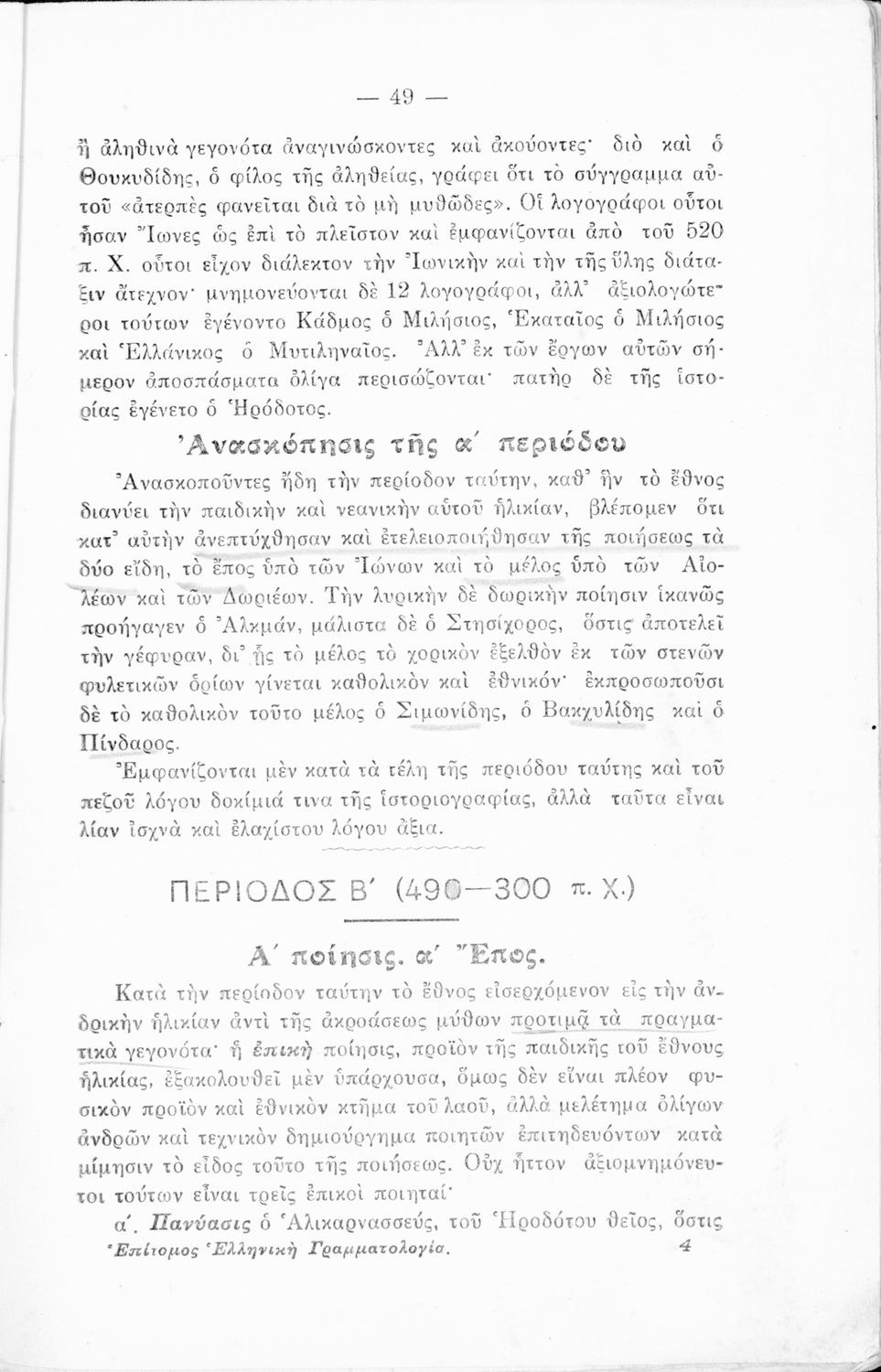 Σχολικό εγχειρίδιο Αρχαίων και Νέων Ελληνικών για τις Γ΄, Δ΄, Ε΄, ΣΤ΄ Γυμνασίου που παρουσιάζει τα είδη λογοτεχνίας και την εξέλιξη της ελληνικής γλώσσας από την εποχή του Όμηρου μέχρι την Ελληνική Επανάσταση. Περιέχει και αναφορά στα δημοτικά τραγούδια και σύντομα βιογραφικά σημειώματα επιφανών λογοτεχνών. Ο συγγραφέας ήταν Καθηγητής Ελληνικών Γραμμάτων στο Εθνικό Πανεπιστήμιο και Γυμνασιάρχης στο Αρσάκειο.