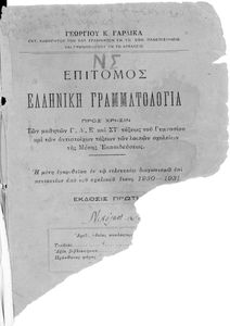 Βαθμίδα εκπαίδευσης: Δευτεροβάθμια Τάξη: Γ' Γυμνασίου / Δ' Γυμνασίου / Ε' Γυμνασίου / ΣΤ' Γυμνασίου Μάθημα: Αρχαία Ελληνικά Γλώσσα: Καθαρεύουσα Παρουσίαση περιεχομένου: Σχολικό εγχειρίδιο Αρχαίων και Νέων Ελληνικών για τις Γ΄, Δ΄, Ε΄, ΣΤ΄ Γυμνασίου που παρουσιάζει τα είδη λογοτεχνίας και την εξέλιξη της ελληνικής γλώσσας από την εποχή του Όμηρου μέχρι την Ελληνική Επανάσταση. Περιέχει και αναφορά στα δημοτικά τραγούδια και σύντομα βιογραφικά σημειώματα επιφανών λογοτεχνών. Ο συγγραφέας ήταν Καθηγητής Ελληνικών Γραμμάτων στο Εθνικό Πανεπιστήμιο και Γυμνασιάρχης στο Αρσάκειο. |