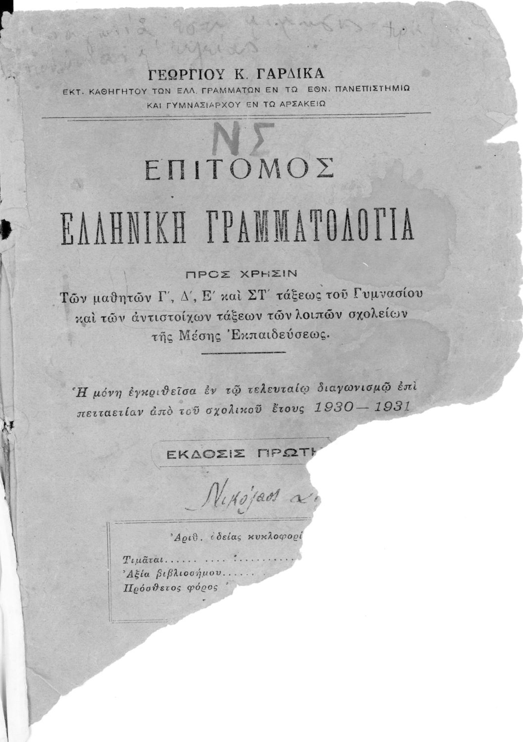 LDR 01779 2200205 4500 035 ## _a01-18522 040 ## _aΙνστιτούτο Εκπαιδευτικής Πολιτικής 041 ## _ael 100 ## _aΓιώργος Κ. Γαρδίκας 110 ## _a18522 245 0# _aΕπίτομος Ελληνική Γραμματολογία. Προς χρήσιν των μαθητών Γ΄, Δ΄, Ε΄, ΣΤ΄ του Γυμνασίου και των αντίστοιχων Τάξεων των λοιπών Σχολείων της Μέσης Εκπαίδευσης. 250 ## _a1η Έκδοση 260 ## _aΑθήνα _bΒιβλιοπωλείο Ιωάννη Ν. Σιδέρη _c1930 300 ## _a183 520 ## _aΣχολικό εγχειρίδιο Αρχαίων και Νέων Ελληνικών για τις Γ΄, Δ΄, Ε΄, ΣΤ΄ Γυμνασίου που παρουσιάζει τα είδη λογοτεχνίας και την εξέλιξη της ελληνικής γλώσσας από την εποχή του Όμηρου μέχρι την Ελληνική Επανάσταση. Περιέχει και αναφορά στα δημοτικά τραγούδια και σύντομα βιογραφικά σημειώματα επιφανών λογοτεχνών. Ο συγγραφέας ήταν Καθηγητής Ελληνικών Γραμμάτων στο Εθνικό Πανεπιστήμιο και Γυμνασιάρχης στο Αρσάκειο. 521 ## _aΓ' Γυμνασίου / Δ' Γυμνασίου / Ε' Γυμνασίου / ΣΤ' Γυμνασίου 522 ## _aΕλλάδα 546 ## _aΚαθαρεύουσα 563 ## _aΜαλακό Εξώφυλλο 650 #4 _aΈπος _aΠοίηση _aΡητορική _aΤραγωδία _aΦιλοσοφία
