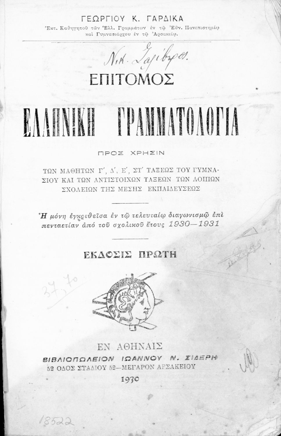 Εκδότης: Βιβλιοπωλείο Ιωάννη Ν. Σιδέρη Έτος έκδοσης: 1930 Τόπος έκδοσης: Αθήνα Έκδοση: 1η |