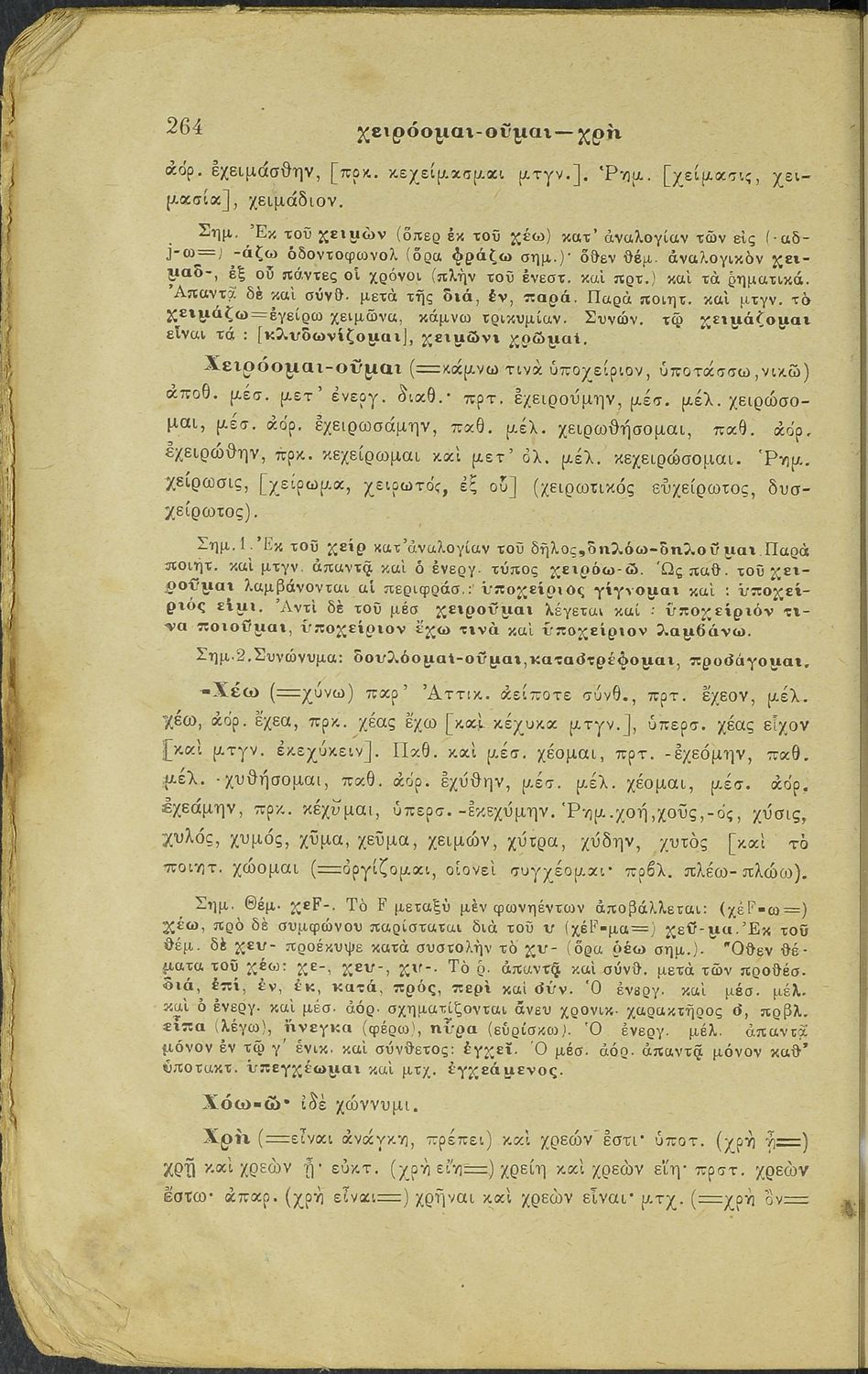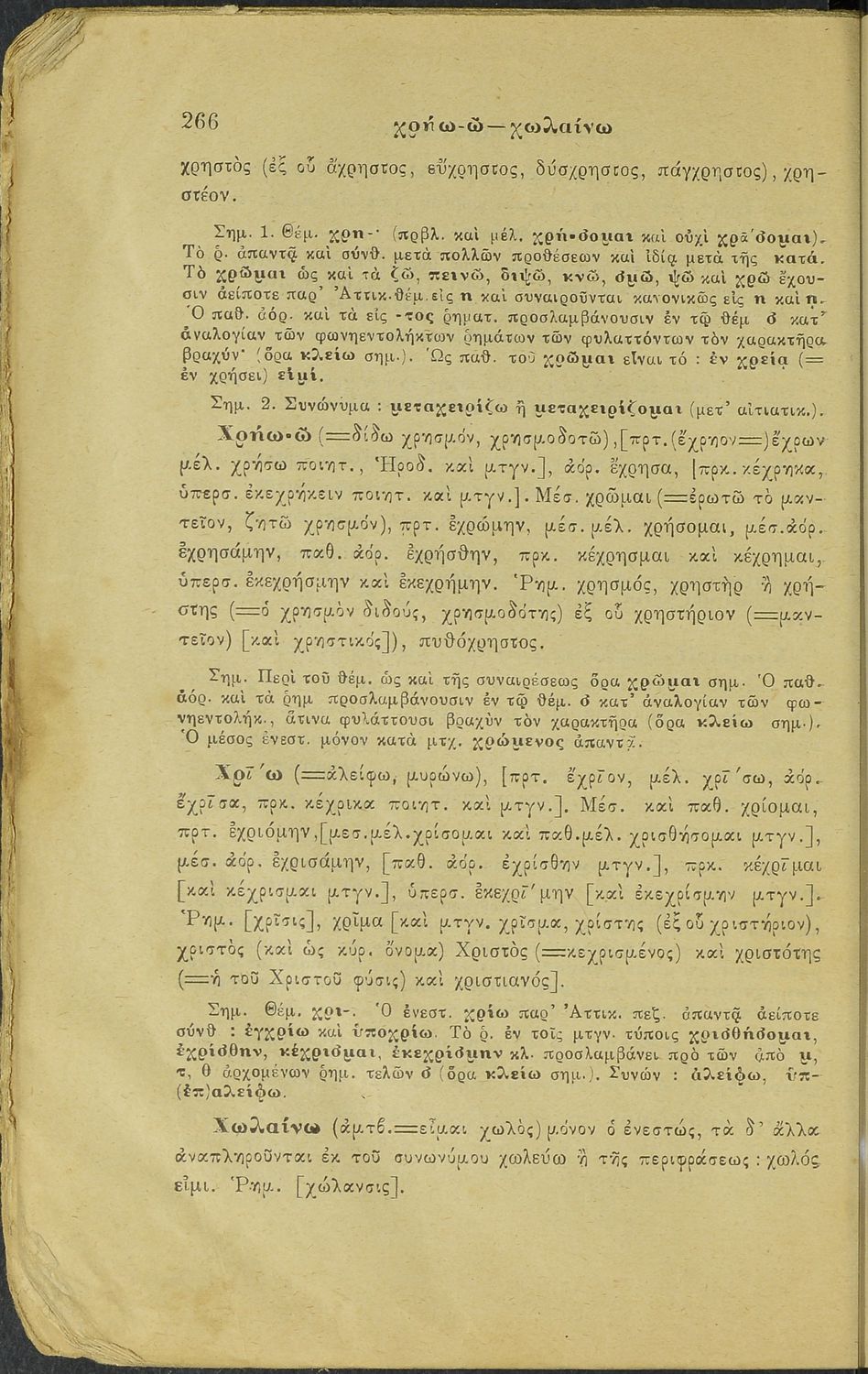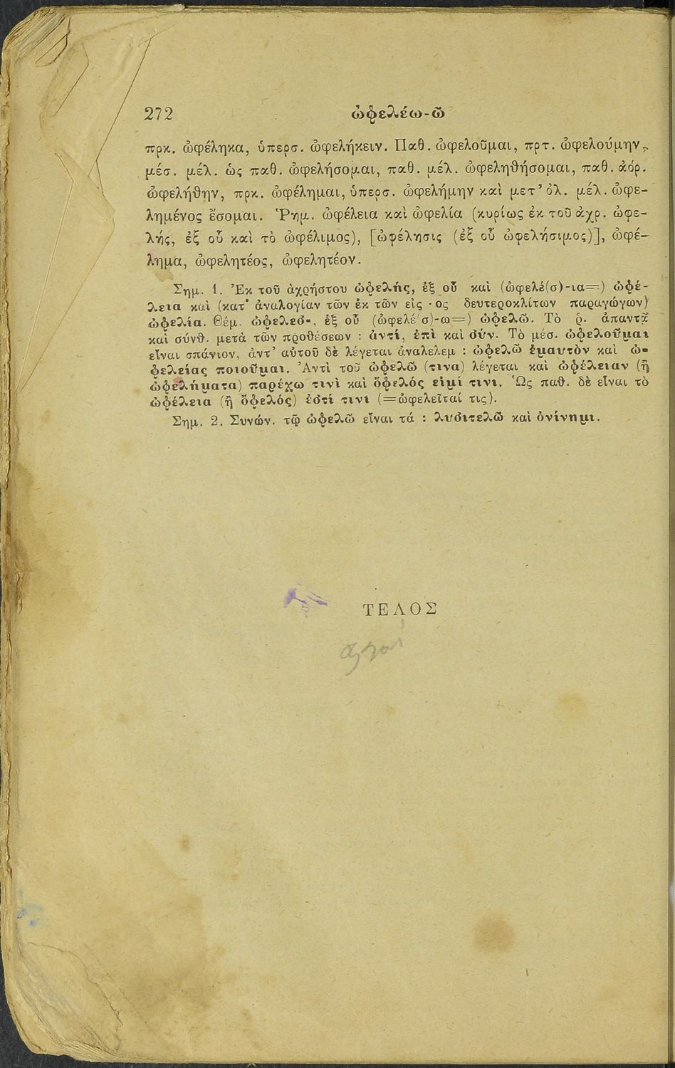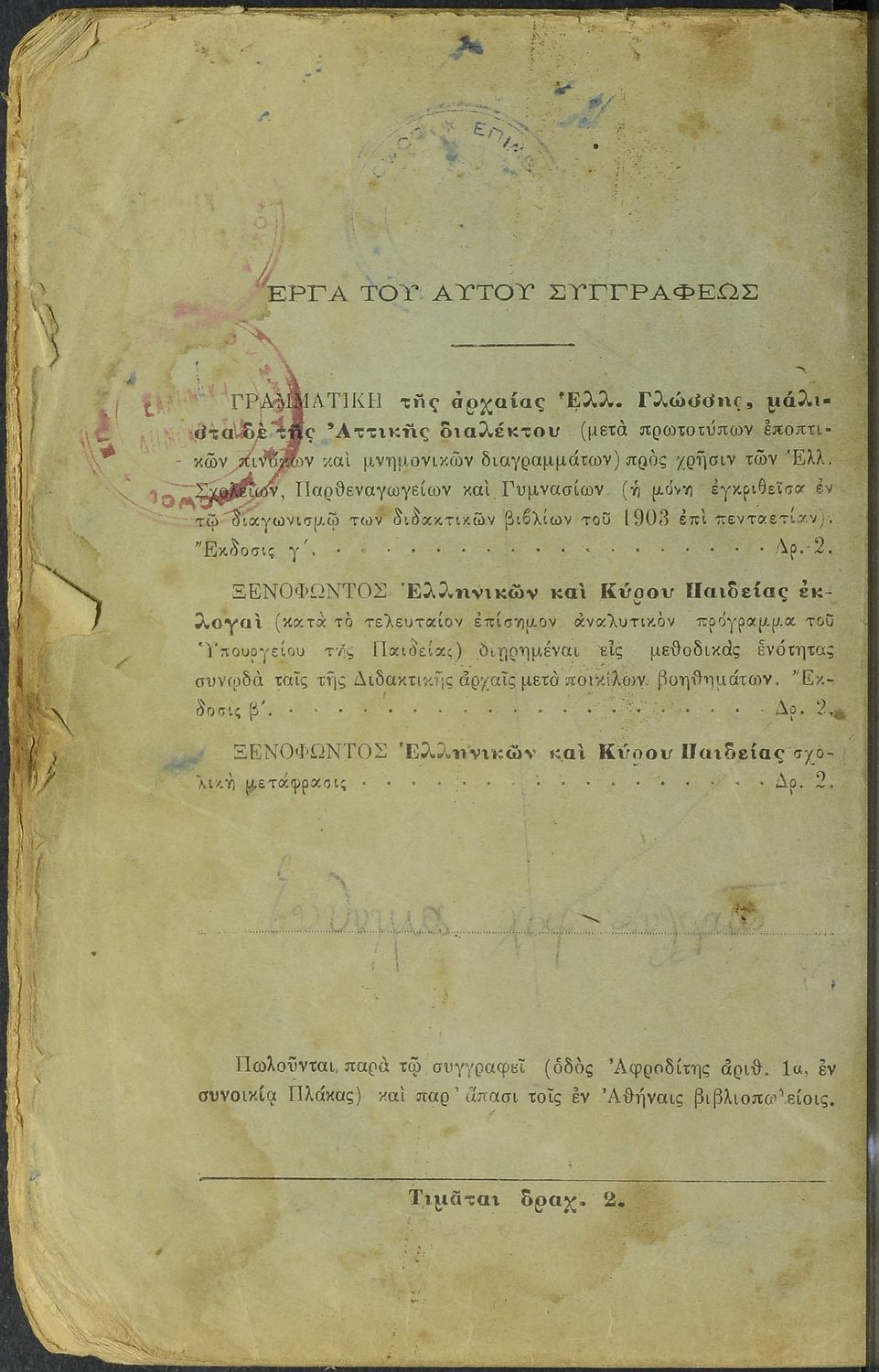 Μαθητικό βοήθημα Αρχαίων Ελληνικών για τα Ελληνικά Σχολεία, Παρθεναγωγεία και Γυμνάσια που περιλαμβάνει γραμματική της αρχαίας ελληνικής και κατάλογο ανωμάλων ρημάτων.