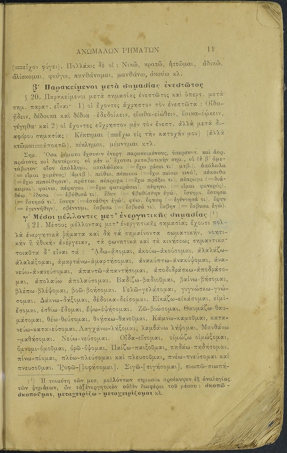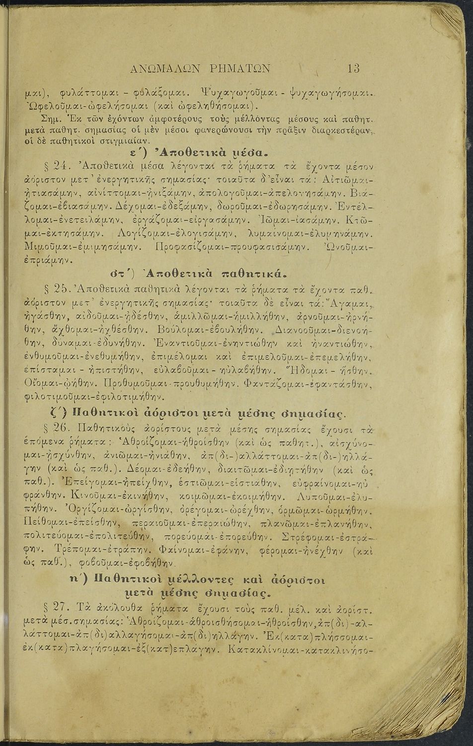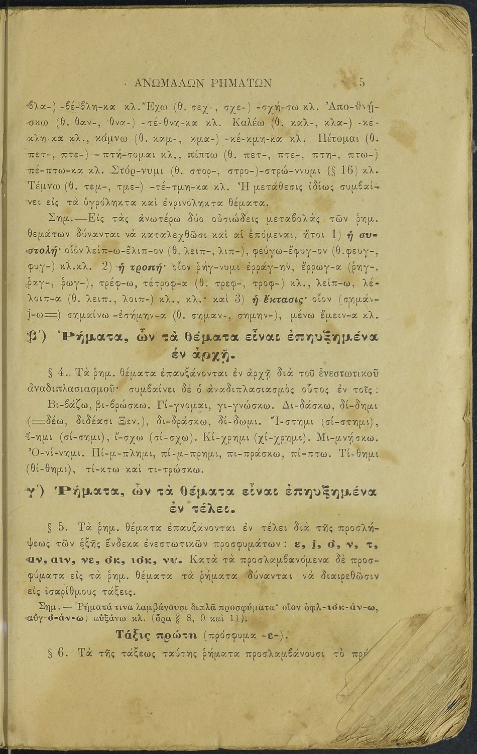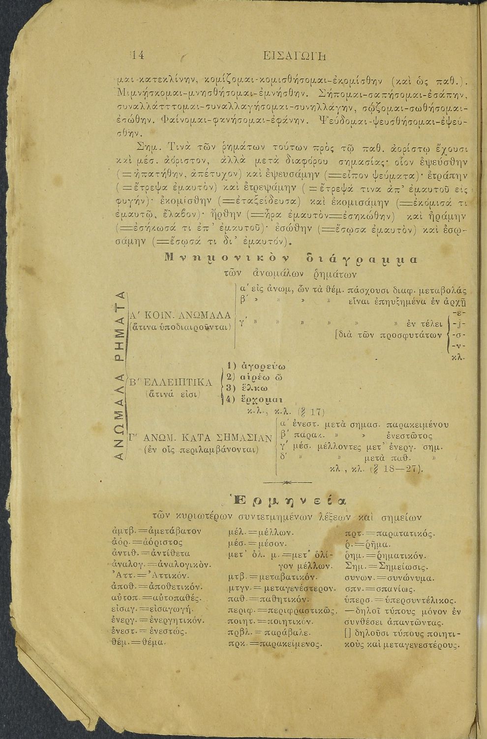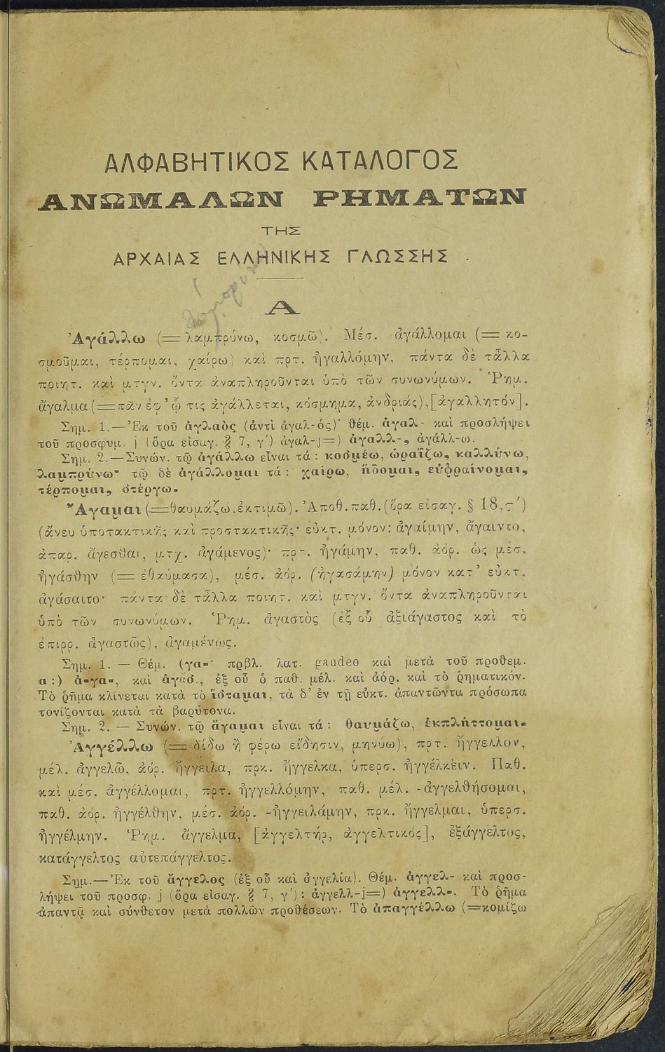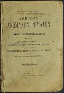 Μαθητικό βοήθημα Αρχαίων Ελληνικών για τα Ελληνικά Σχολεία, Παρθεναγωγεία και Γυμνάσια που περιλαμβάνει γραμματική της αρχαίας ελληνικής και κατάλογο ανωμάλων ρημάτων.