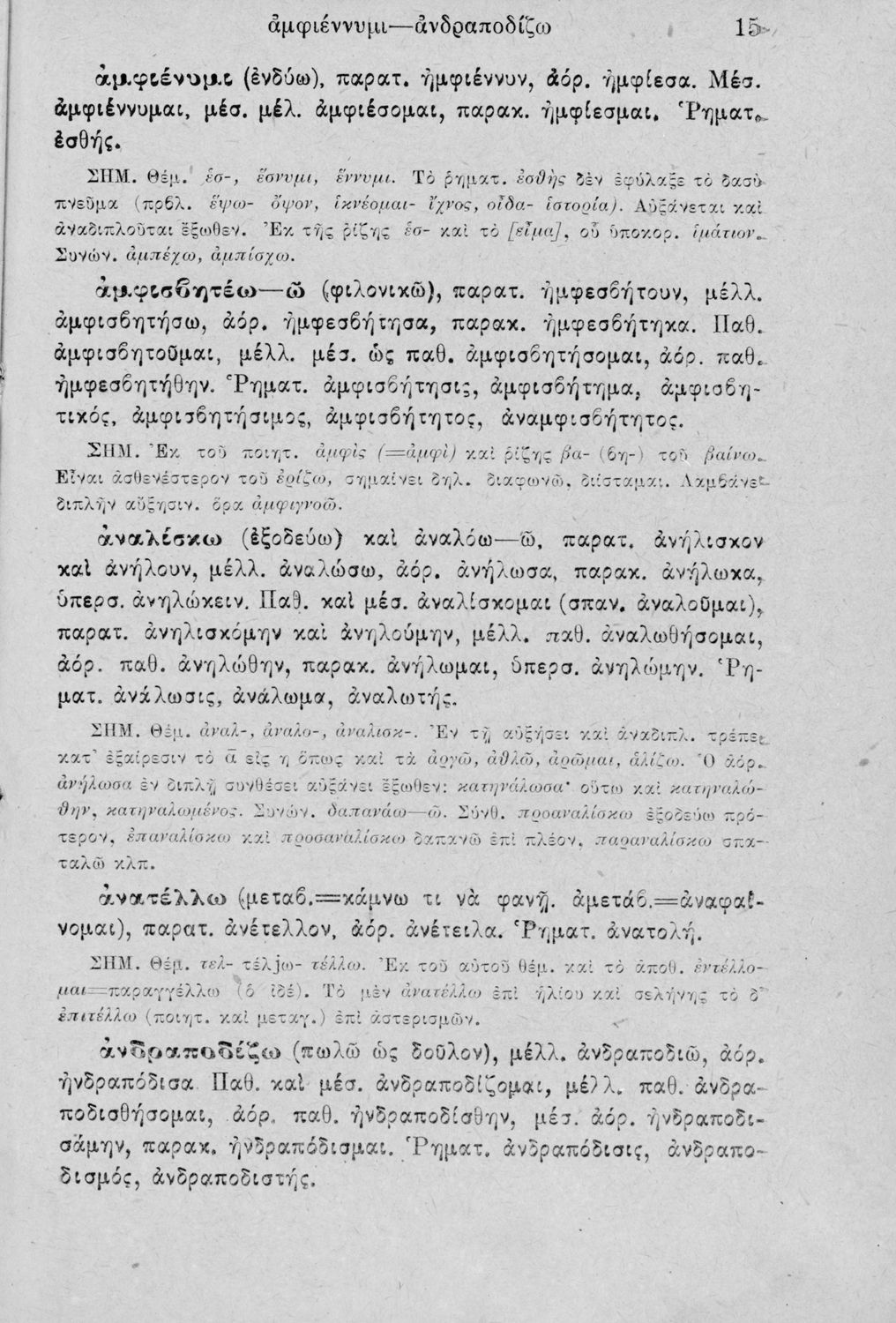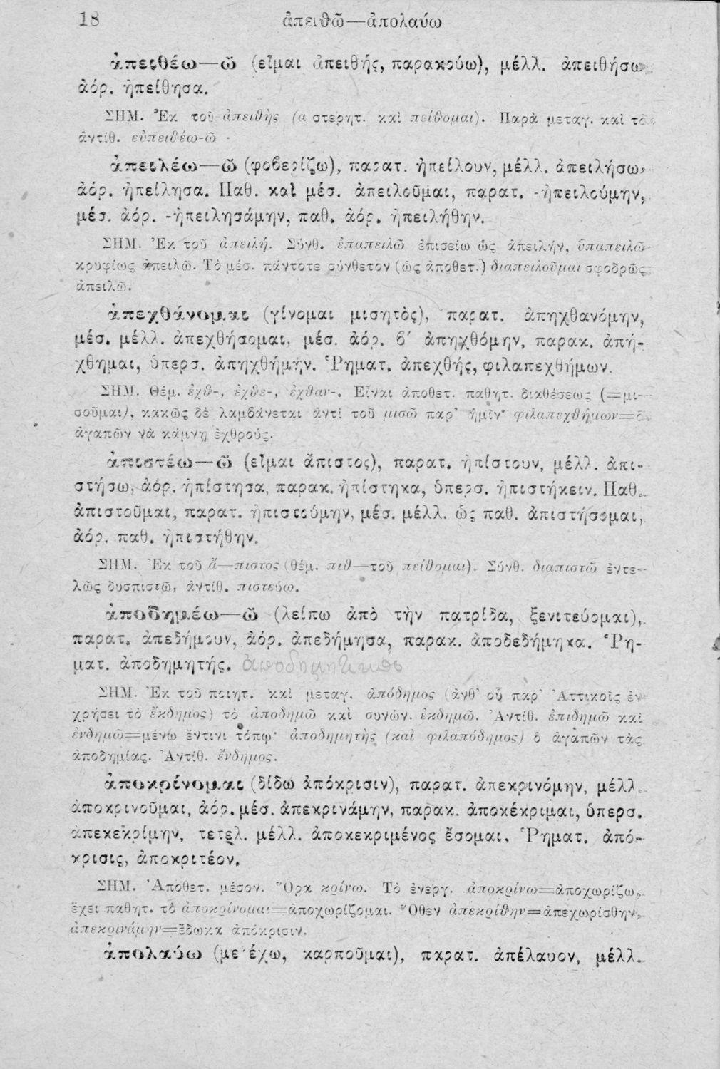 Μαθητικό βοήθημα Αρχαίων Ελληνικών Γυμνασίου που αποτελεί λεξικό ανωμάλων ρημάτων της Αττικής διαλέκτου. Περιέχει και γραμματικές σημειώσεις.