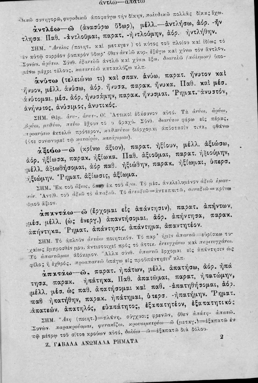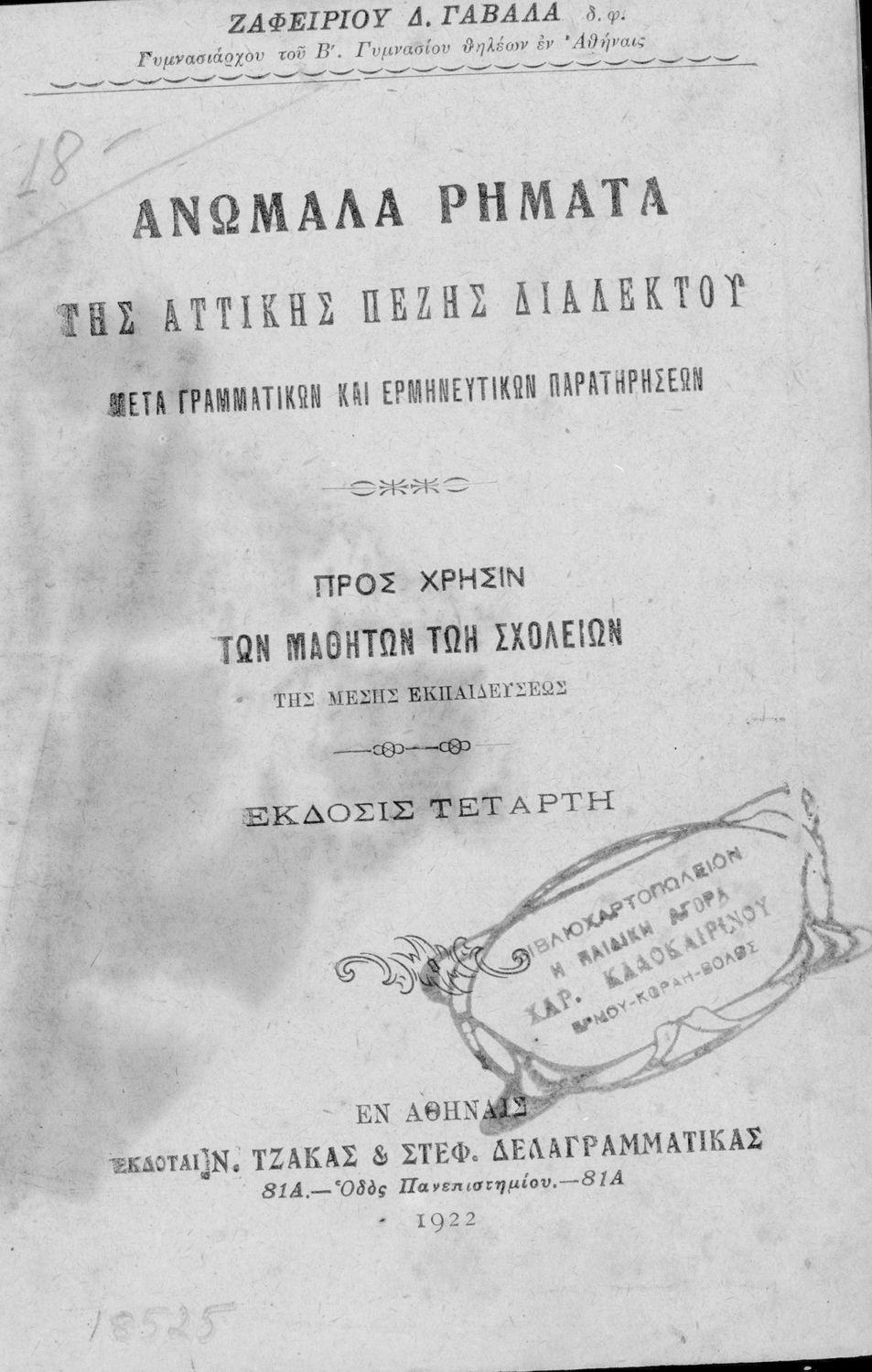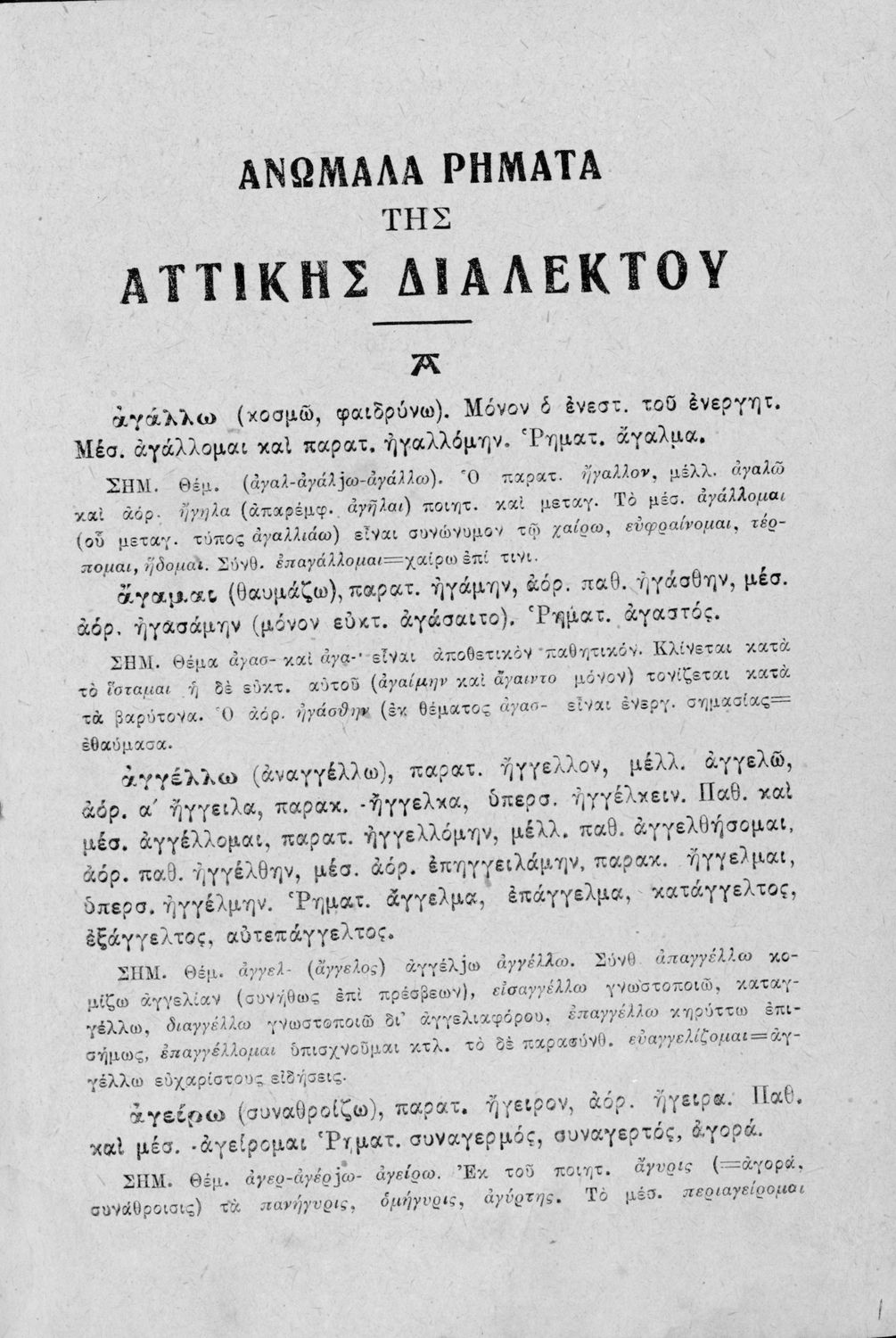 Μαθητικό βοήθημα Αρχαίων Ελληνικών για τα Γυμνάσια, Παρθεναγωγεία και Ελληνικά σχολεία το οποίο περιέχει κατάλογο ανωμάλων ρημάτων της Αττικής διαλέκτου.