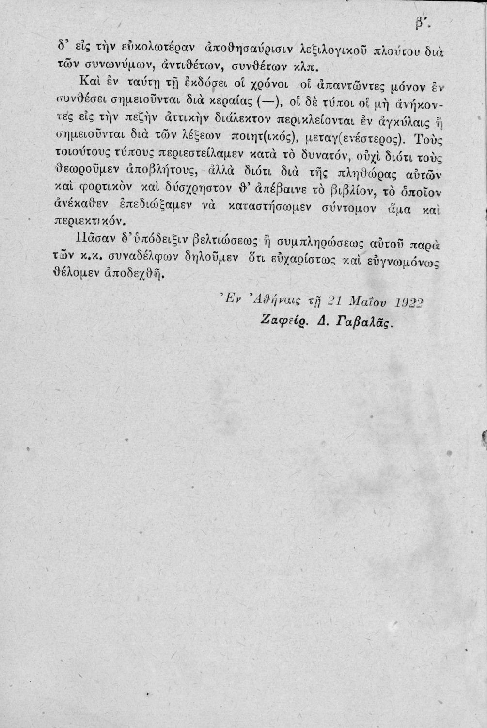 Μαθητικό βοήθημα Αρχαίων Ελληνικών για τα Ελληνικά Σχολεία, Παρθεναγωγεία και Γυμνάσια που περιλαμβάνει γραμματική της αρχαίας ελληνικής και κατάλογο ανωμάλων ρημάτων.