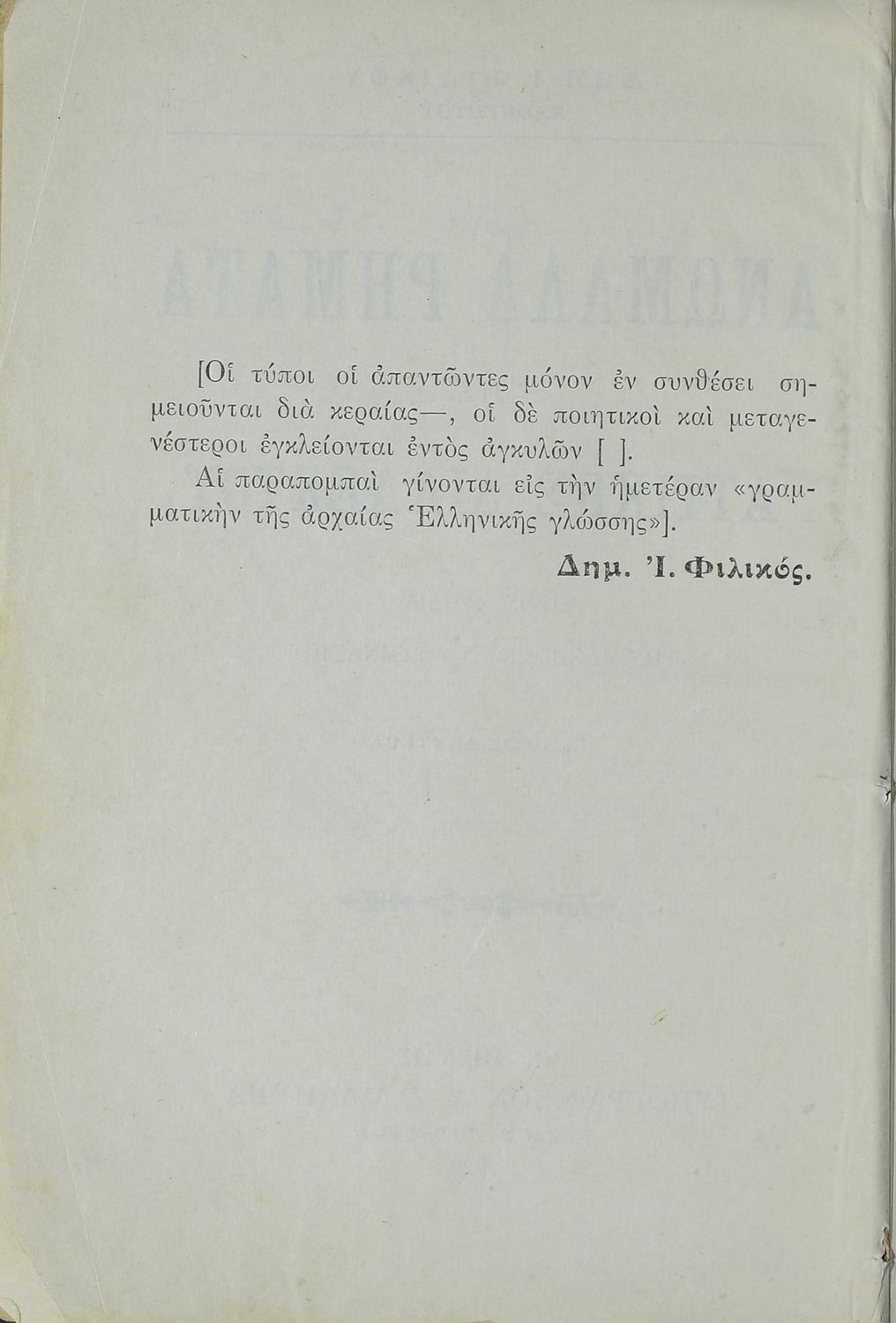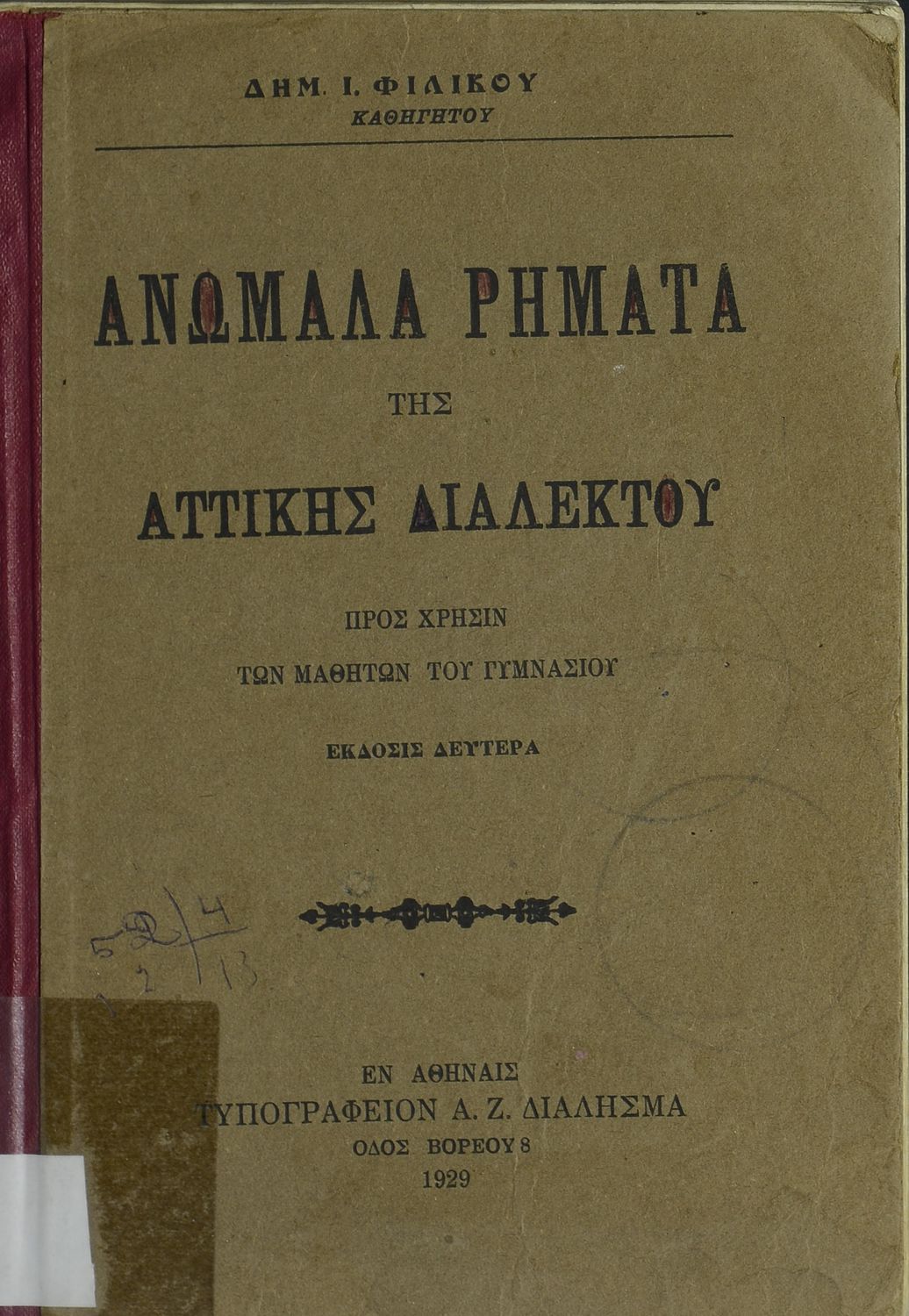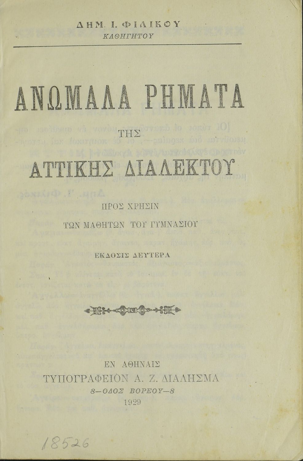 Τίτλος: Ανώμαλα Ρήμα της Αττικής Διαλέκτου. Προς χρήσιν των μαθητών του Γυμνασίου