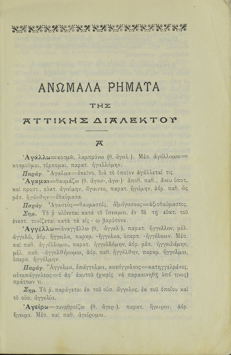 Μαθητικό βοήθημα Αρχαίων Ελληνικών Γυμνασίου, Ελληνικού Σχολείου και Παρθεναγωγείου που περιέχει τα ανώμαλα ρήματα της αττικής διαλέκτου και γραμματικές σημειώσεις.