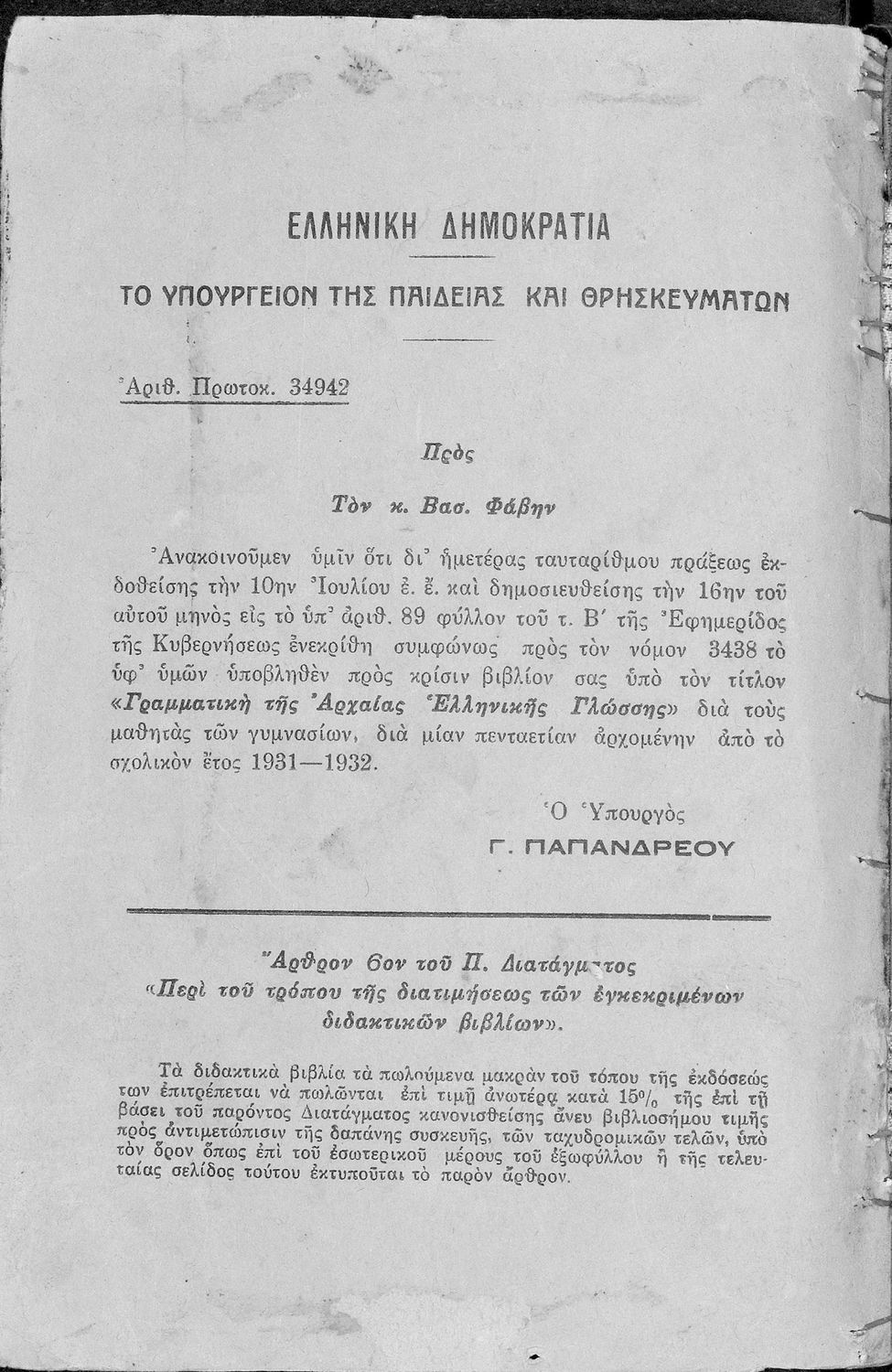 Σχολικό εγχειρίδιο Αρχαίων Ελληνικών Γυμνασίου που περιλαμβάνει τη γραμματική της αρχαίας ελληνικής και είναι χωρισμένο σε φθογγολογικό και τυπολογικό μέρος Περιέχει και κατάλογο ανωμάλων ρημάτων.