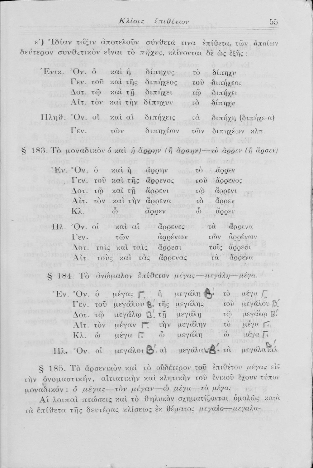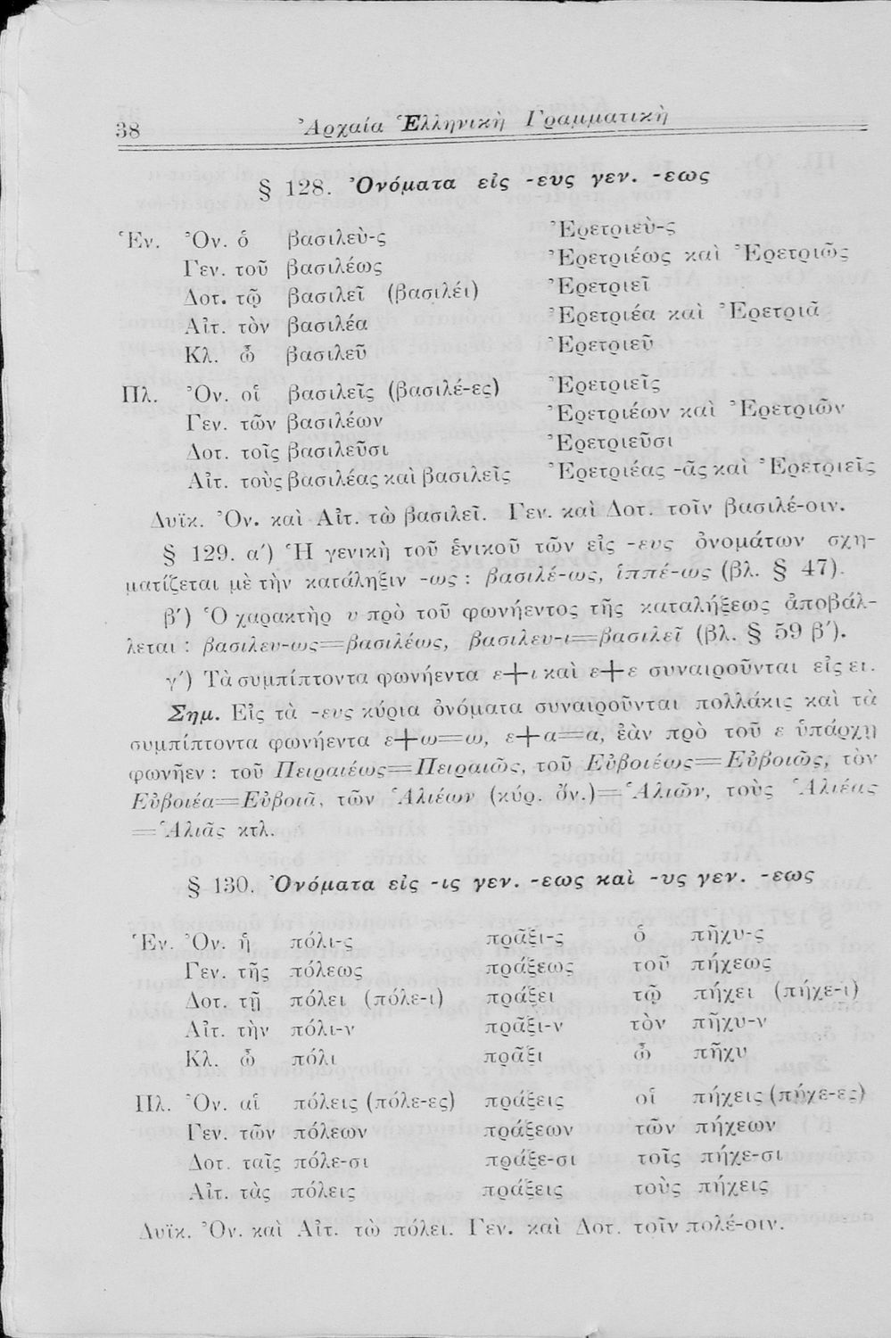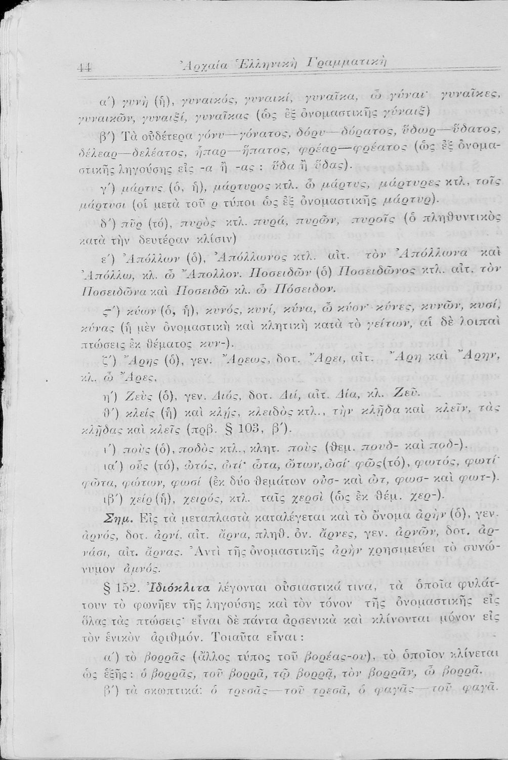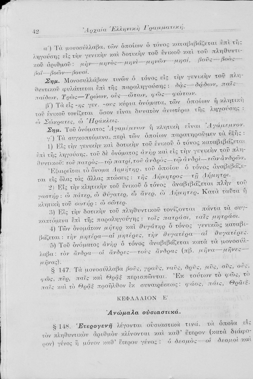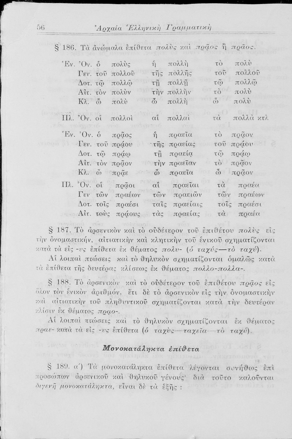 Σχολικό εγχειρίδιο Αρχαίων Ελληνικών Γυμνασίου που περιλαμβάνει τη γραμματική της αρχαίας ελληνικής και είναι χωρισμένο σε φθογγολογικό και τυπολογικό μέρος Περιέχει και κατάλογο ανωμάλων ρημάτων.