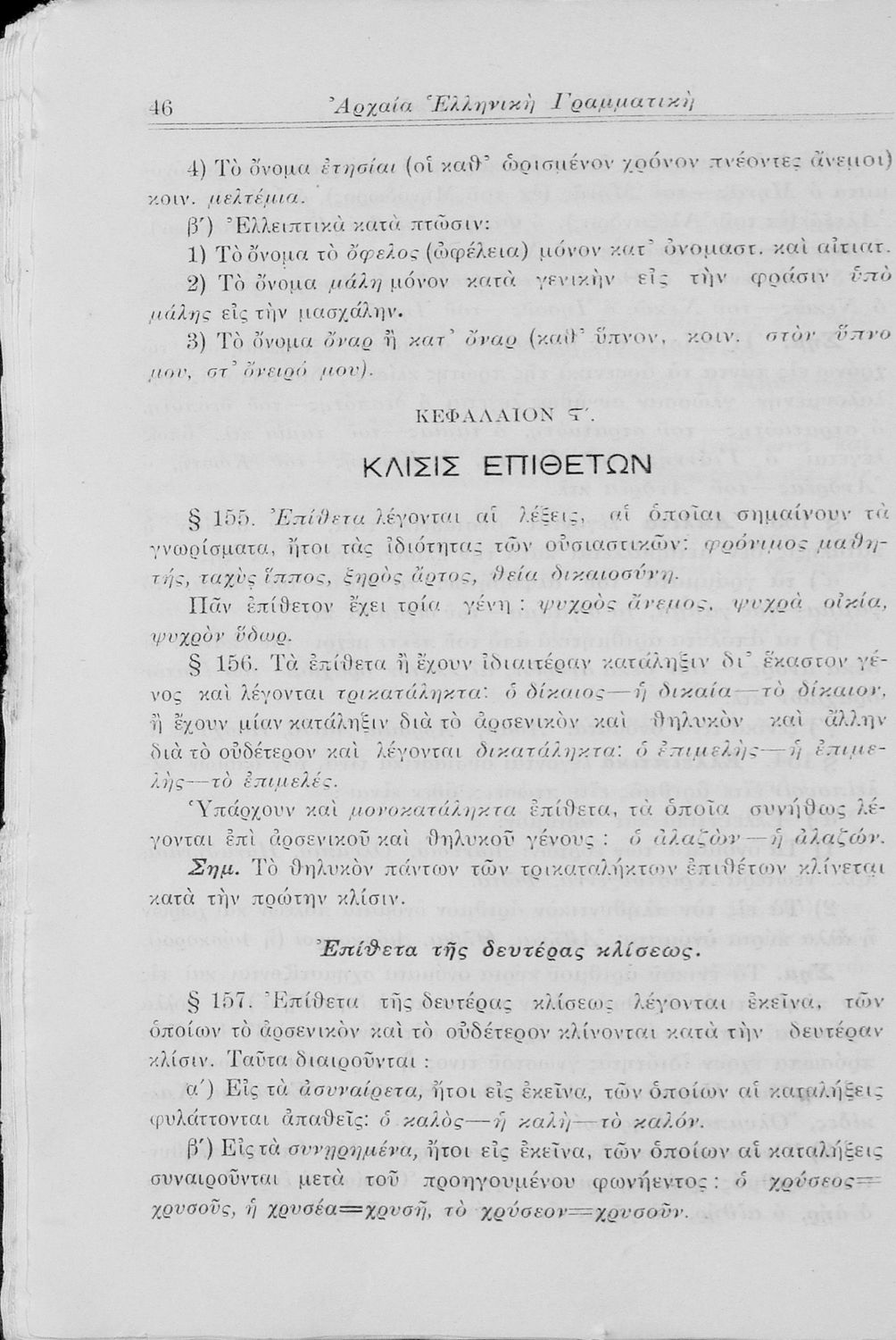 Σχολικό εγχειρίδιο Αρχαίων Ελληνικών για τα Ελληνικά Σχολεία, Παρθεναγωγεία και Γυμνάσια που περιέχει τους κανόνες γραμματικής και είναι χωρισμένο σε φθογγολογικό, τυπολογικό και ετυμολογικό μέρος.