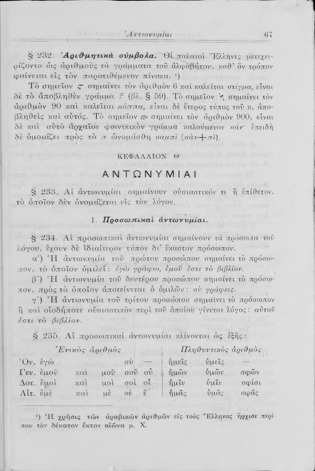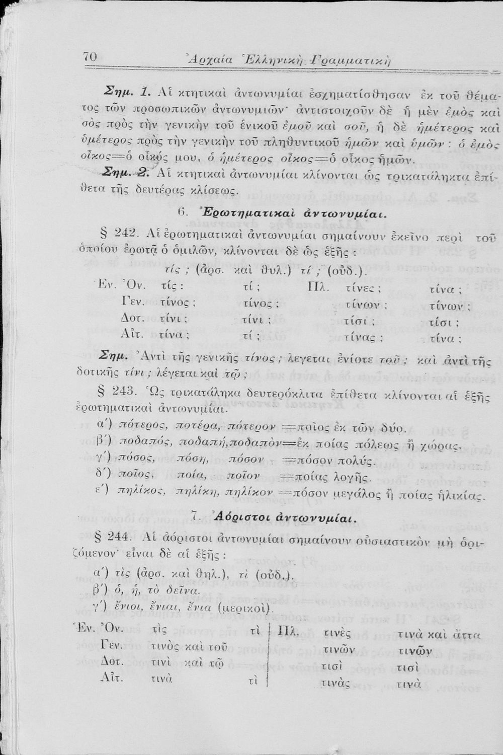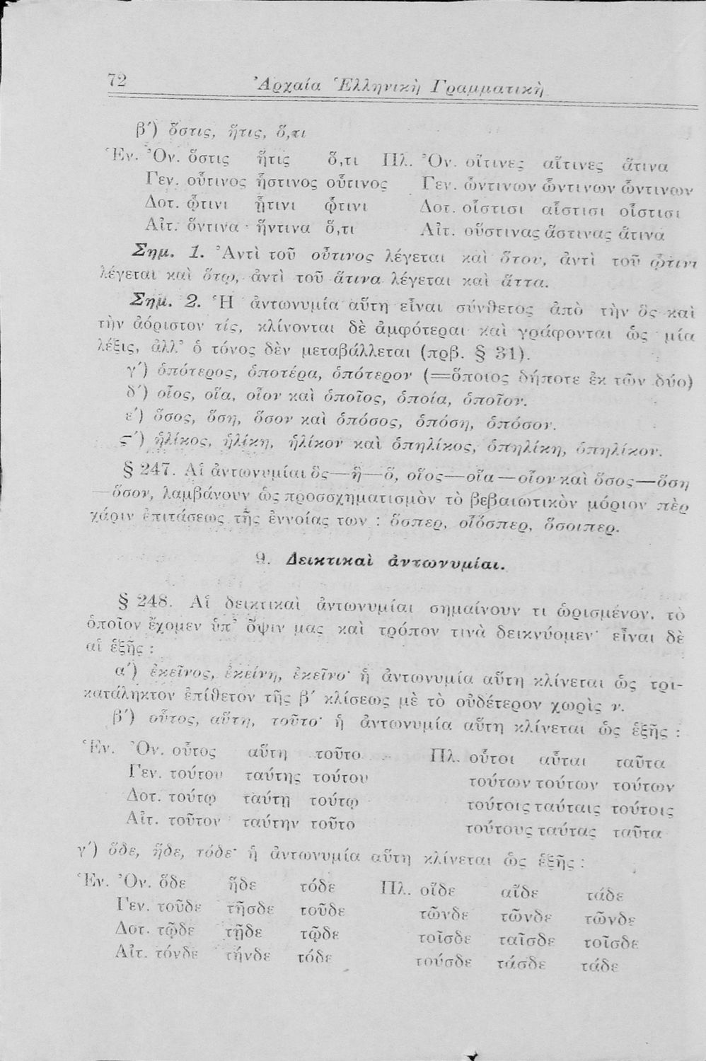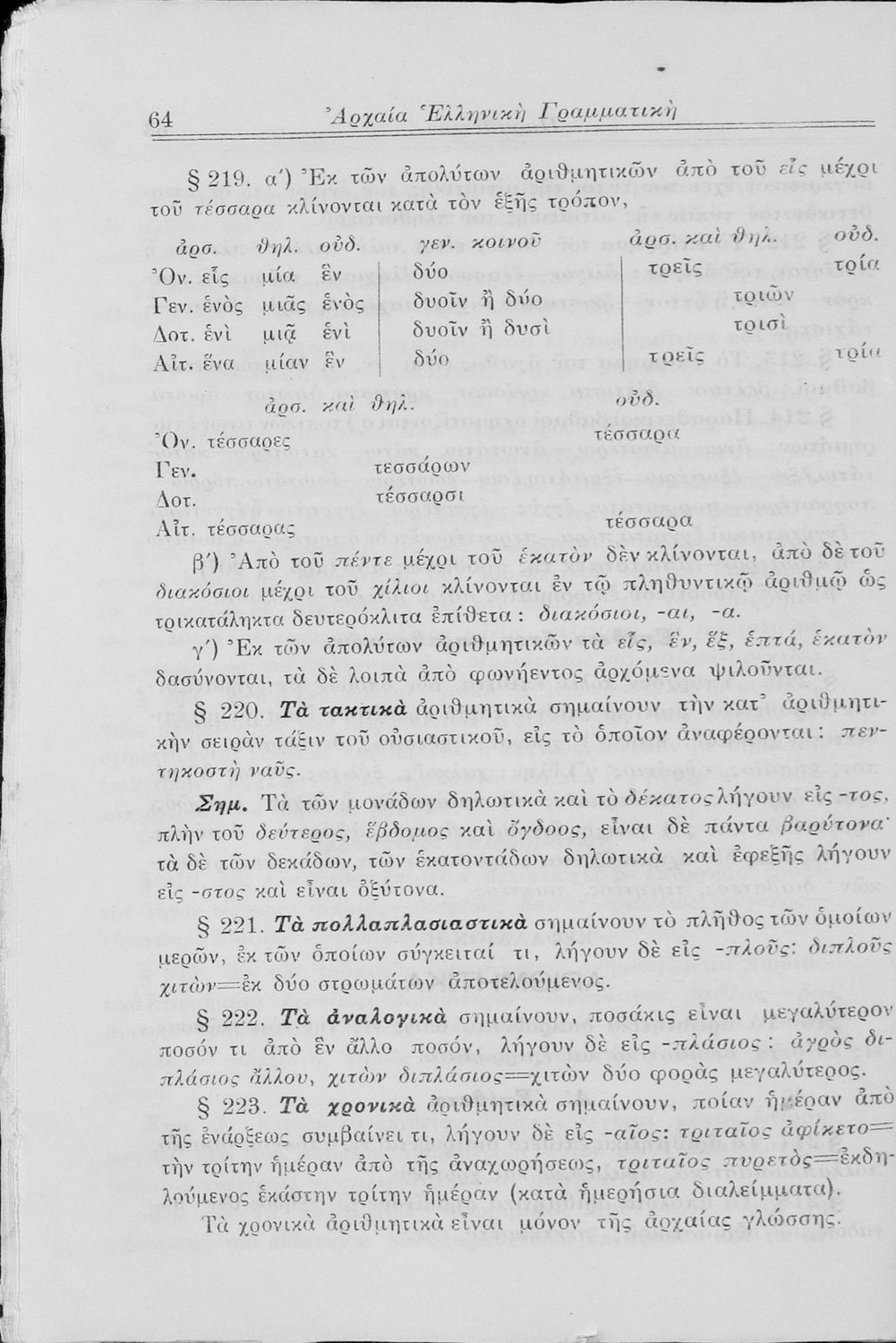 Σχολικό εγχειρίδιο Αρχαίων Ελληνικών Γυμνασίου που περιλαμβάνει τη γραμματική της αρχαίας ελληνικής και είναι χωρισμένο σε φθογγολογικό και τυπολογικό μέρος Περιέχει και κατάλογο ανωμάλων ρημάτων.