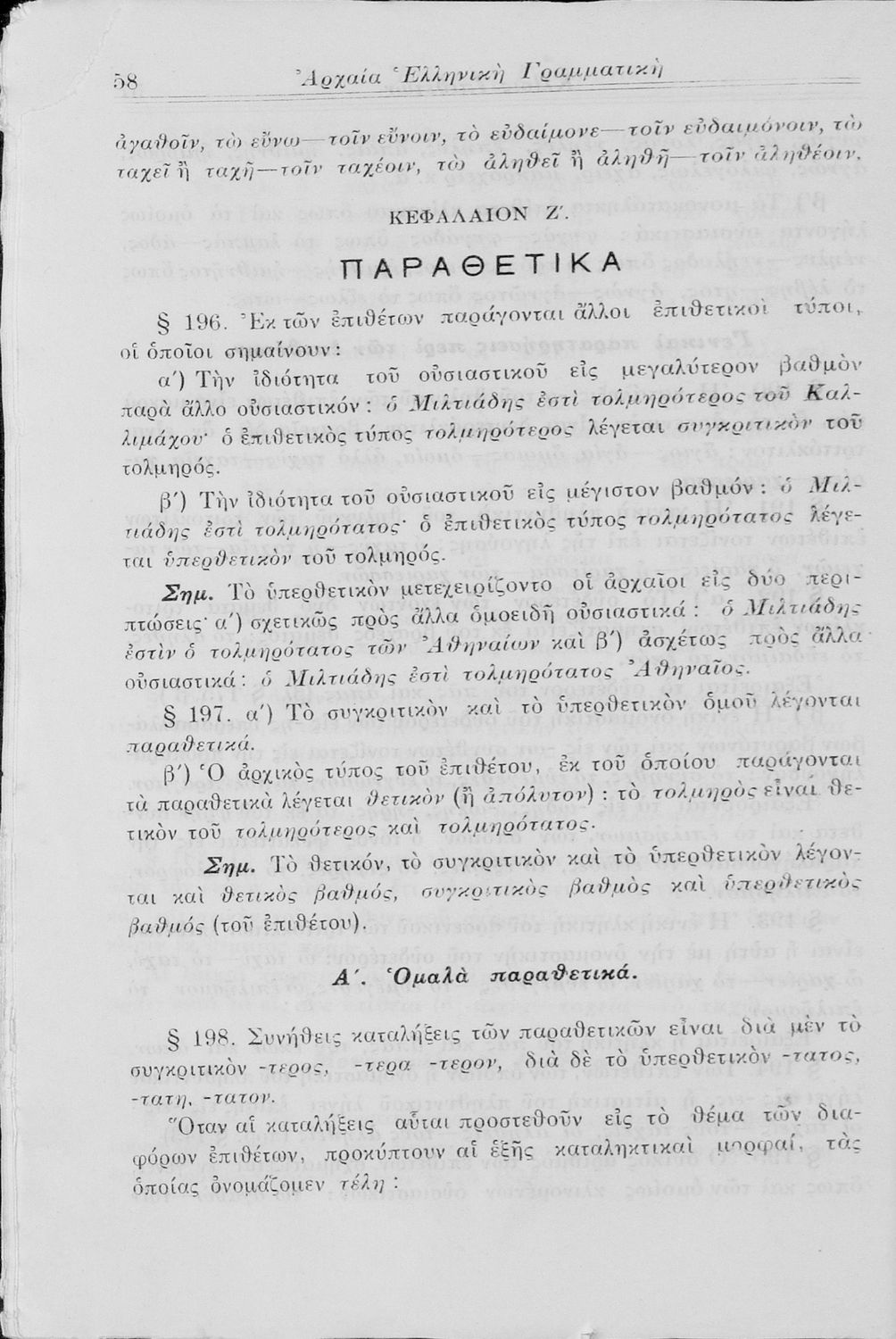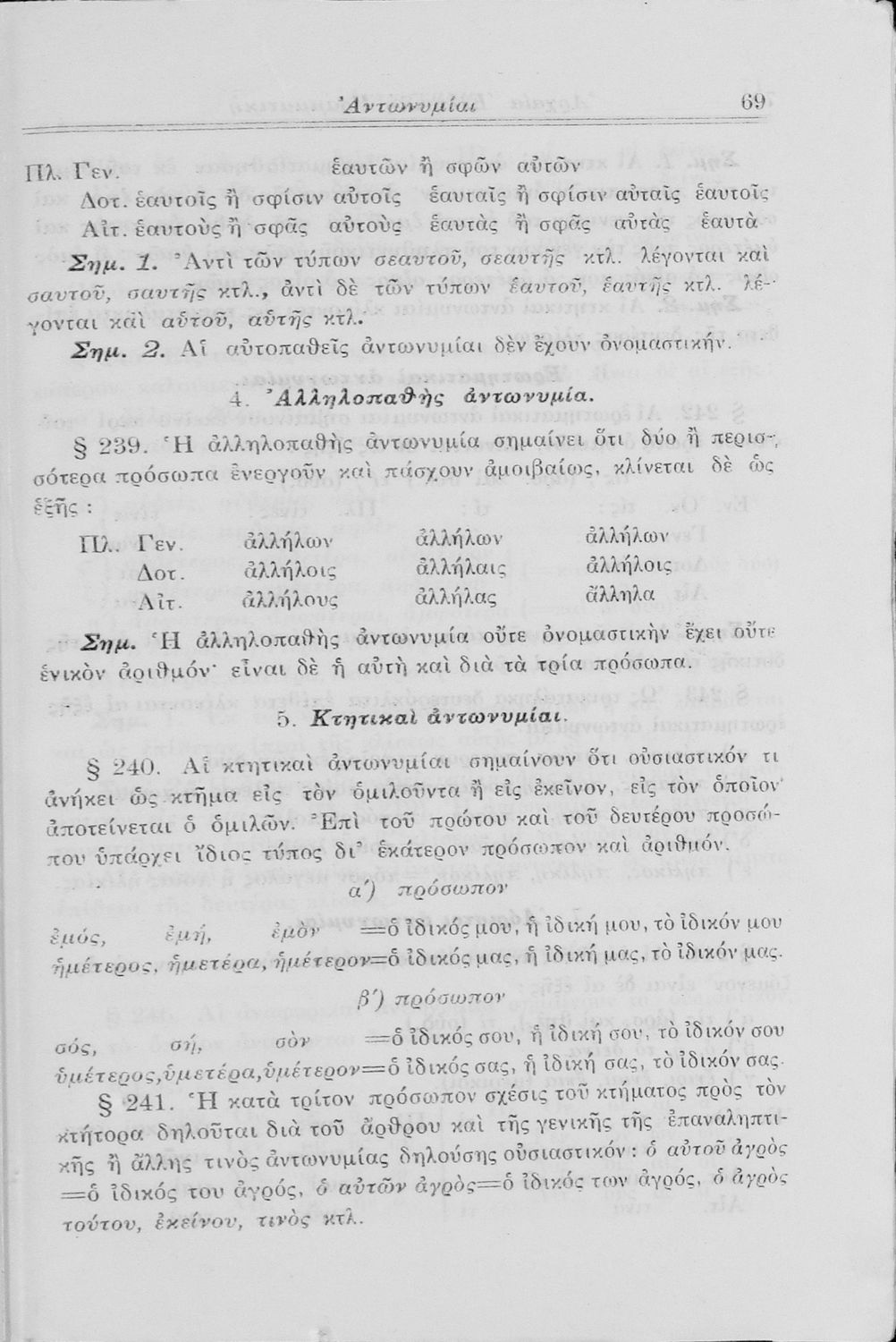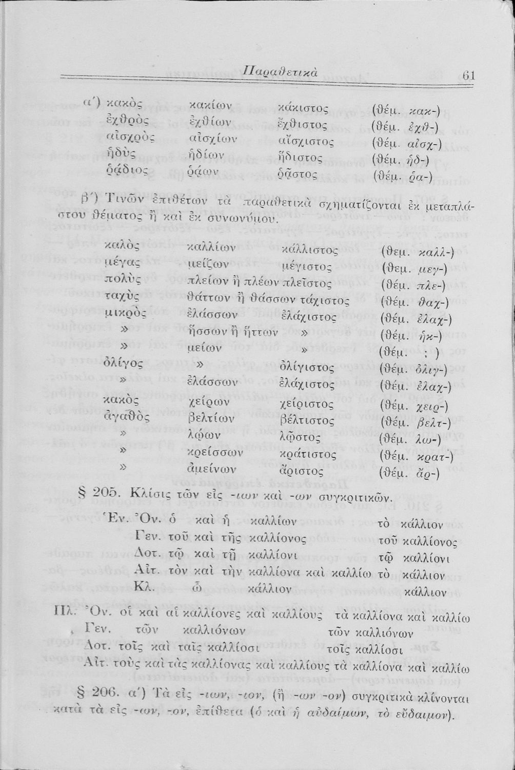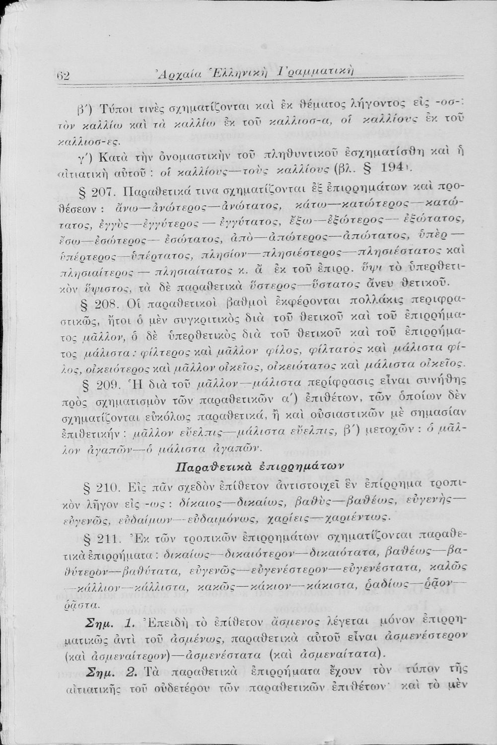 Σχολικό εγχειρίδιο Αρχαίων Ελληνικών Γυμνασίου που περιλαμβάνει τη γραμματική της αρχαίας ελληνικής και είναι χωρισμένο σε φθογγολογικό και τυπολογικό μέρος Περιέχει και κατάλογο ανωμάλων ρημάτων.