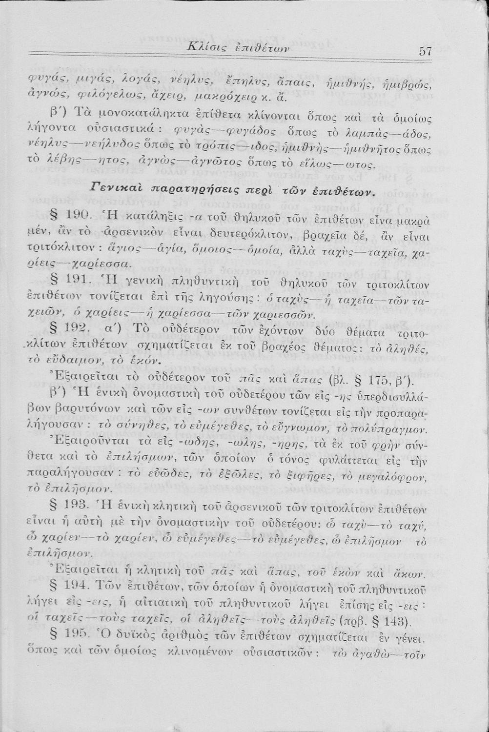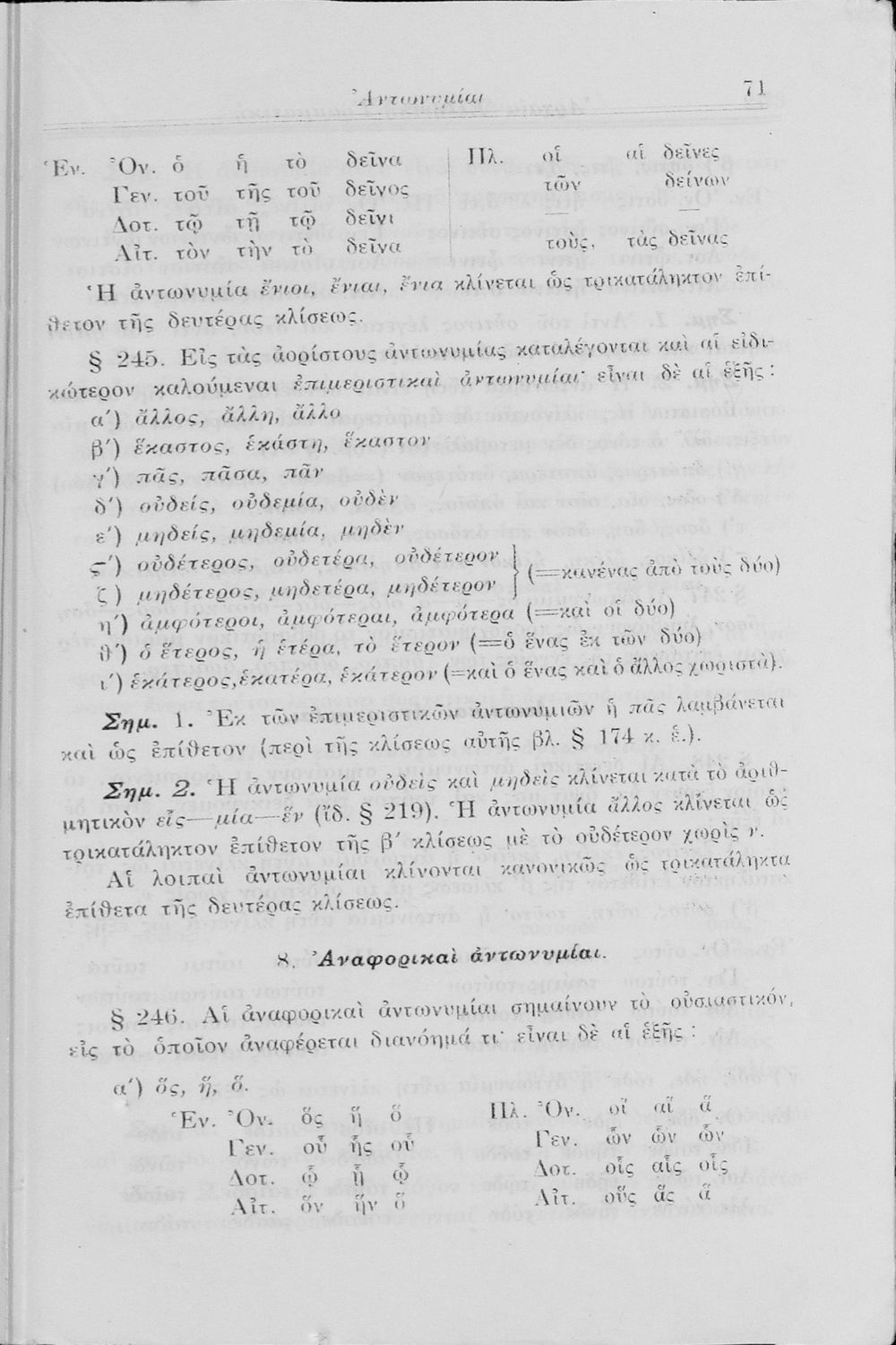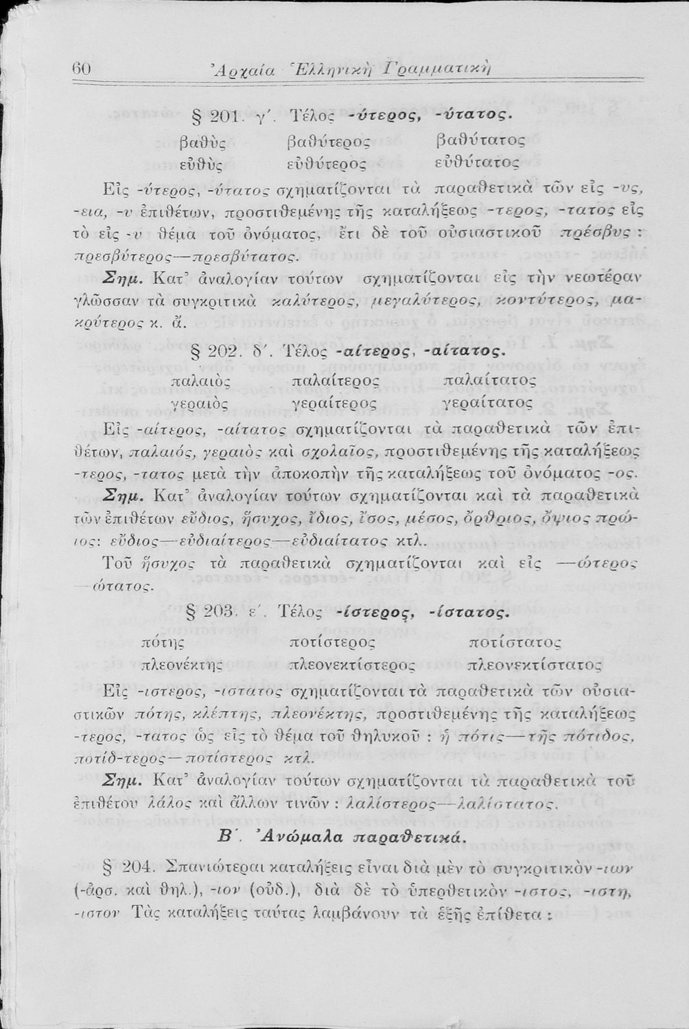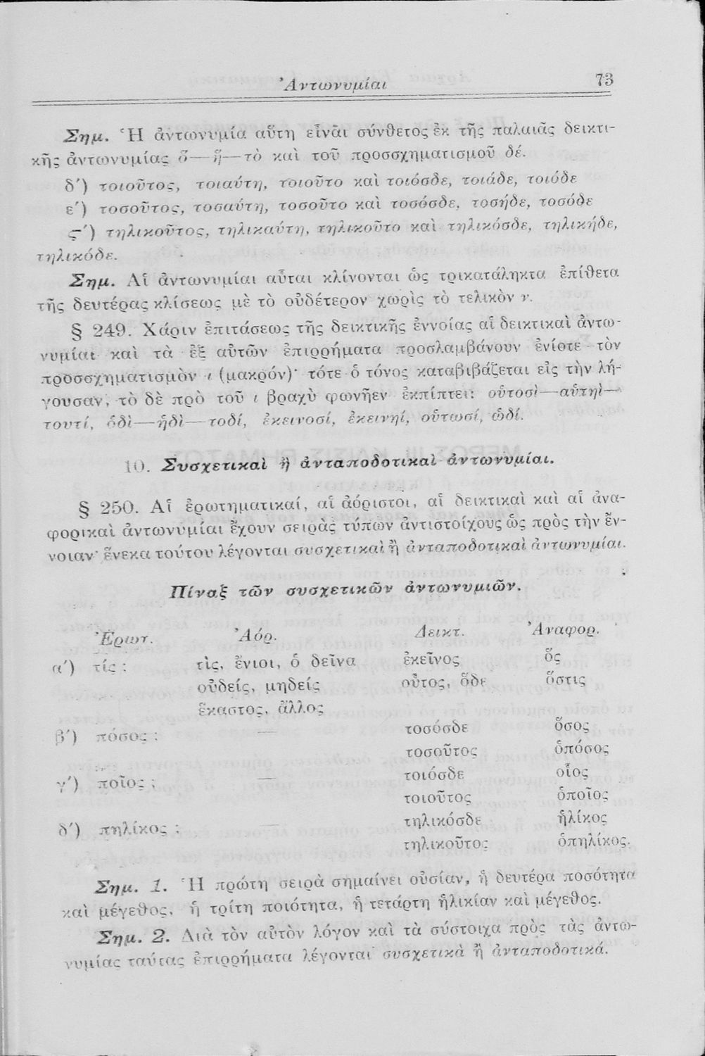 Σχολικό εγχειρίδιο Αρχαίων Ελληνικών Γυμνασίου που περιλαμβάνει τη γραμματική της αρχαίας ελληνικής και είναι χωρισμένο σε φθογγολογικό και τυπολογικό μέρος Περιέχει και κατάλογο ανωμάλων ρημάτων.