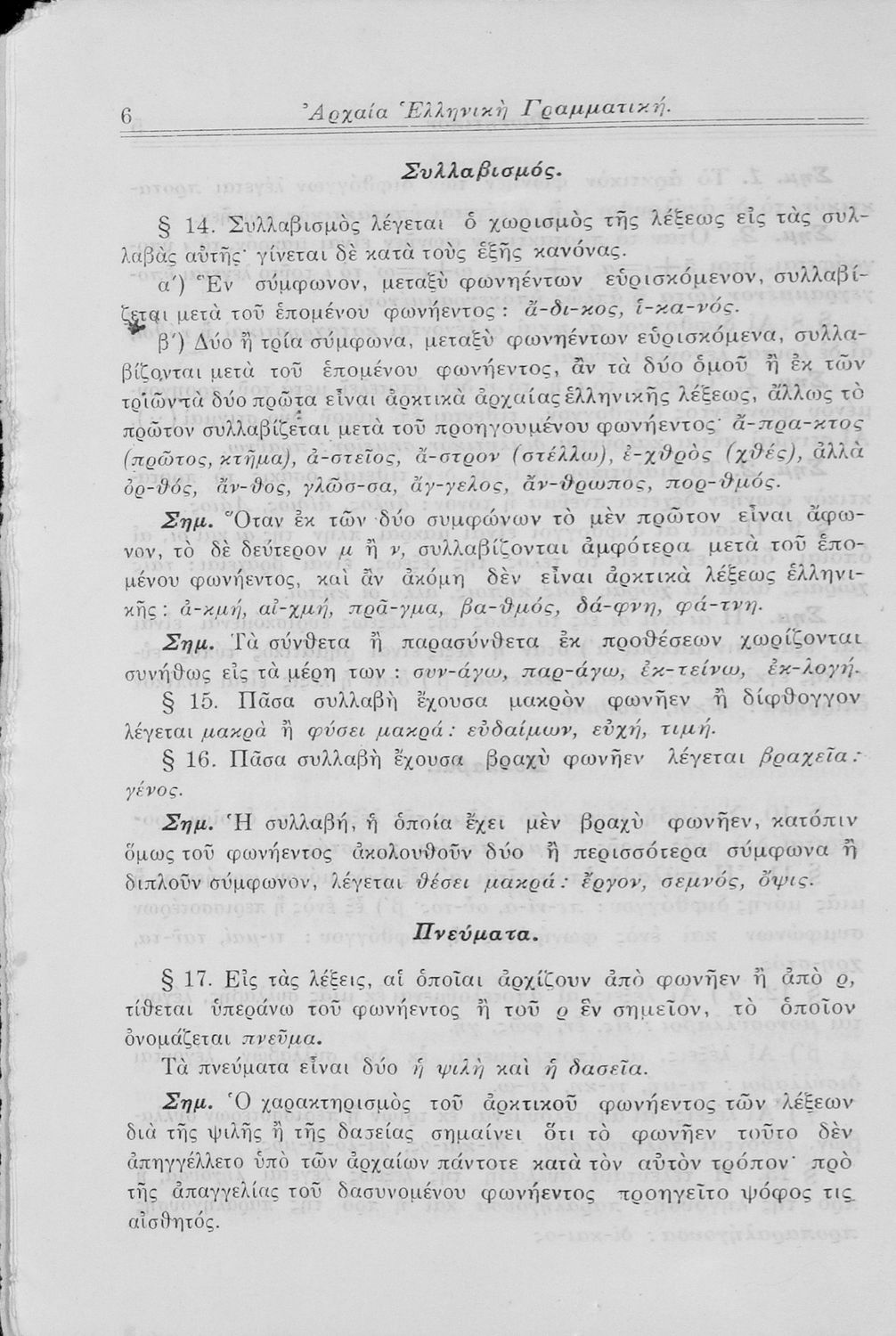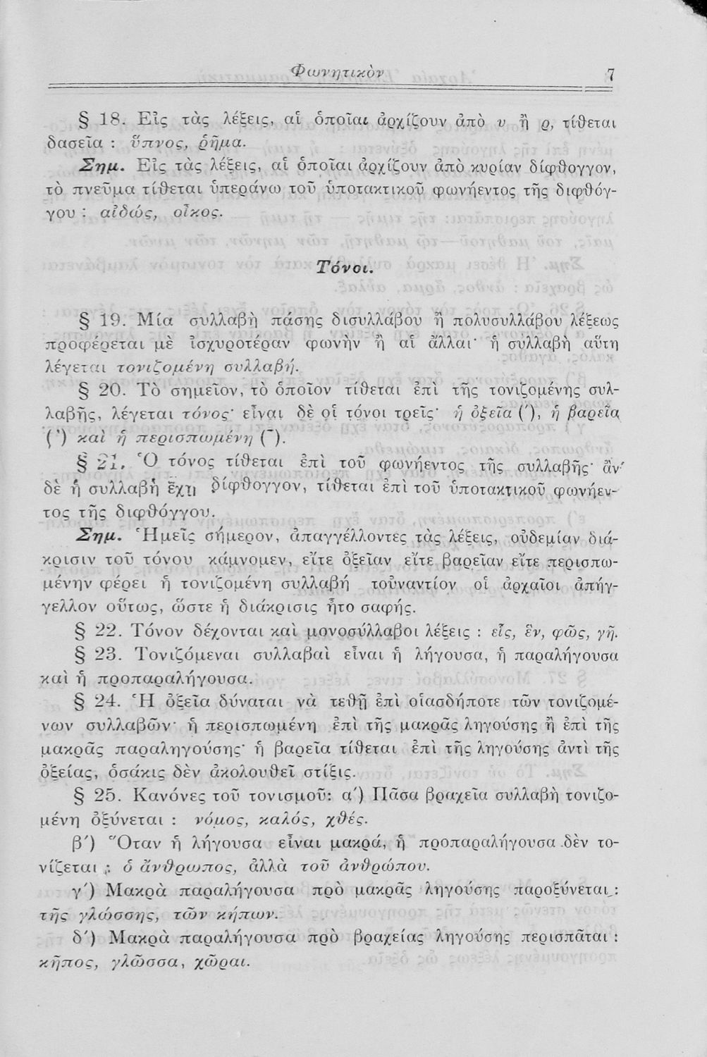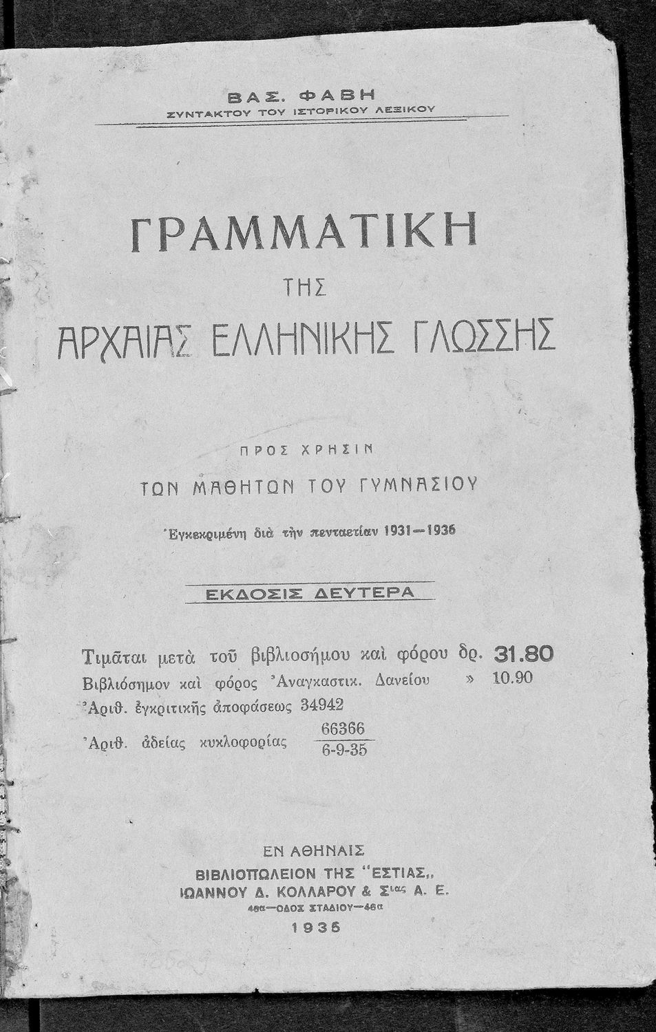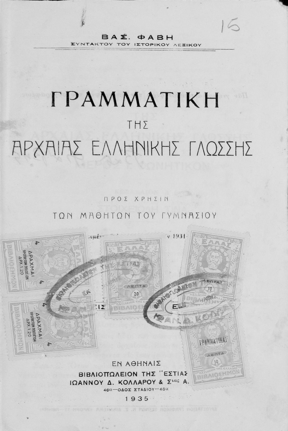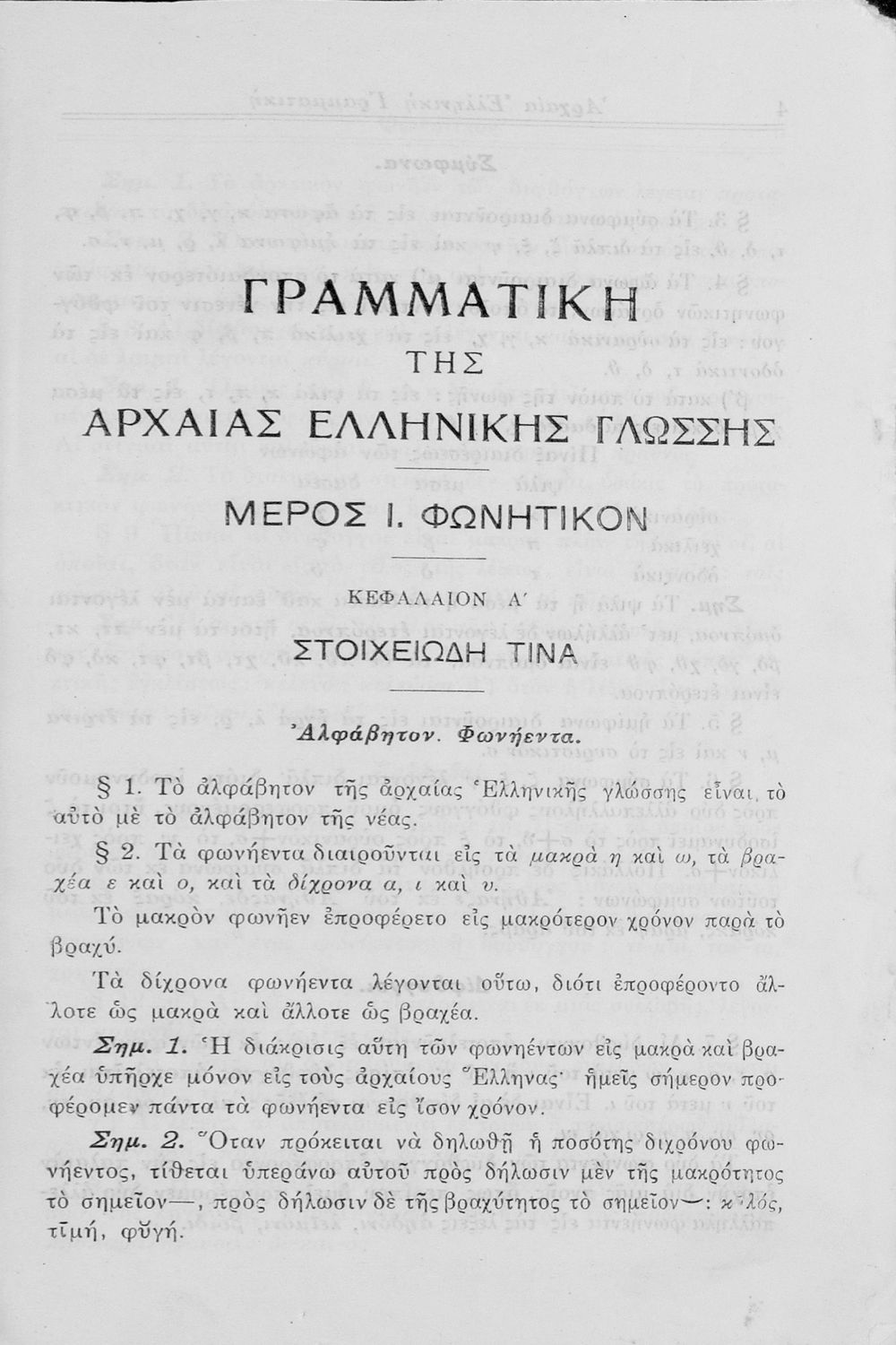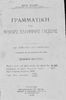 Σχολικό εγχειρίδιο Αρχαίων Ελληνικών για τα Ελληνικά Σχολεία, Παρθεναγωγεία και Γυμνάσια που περιέχει τους κανόνες γραμματικής και είναι χωρισμένο σε φθογγολογικό, τυπολογικό και ετυμολογικό μέρος.