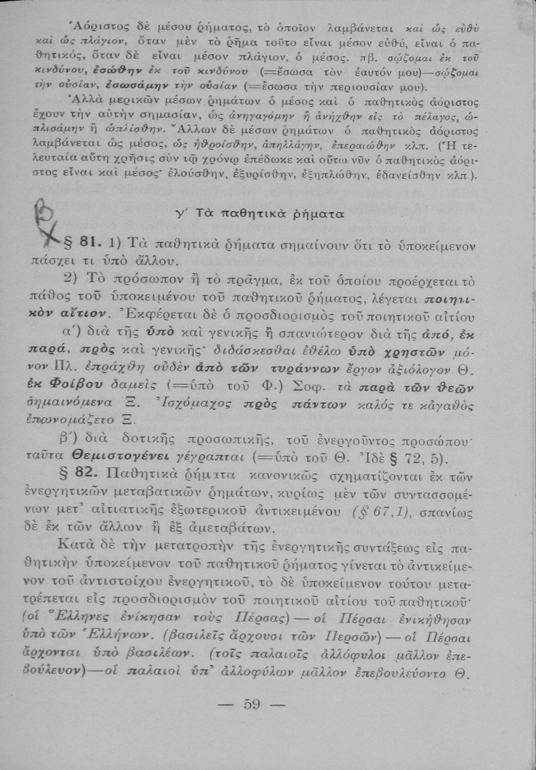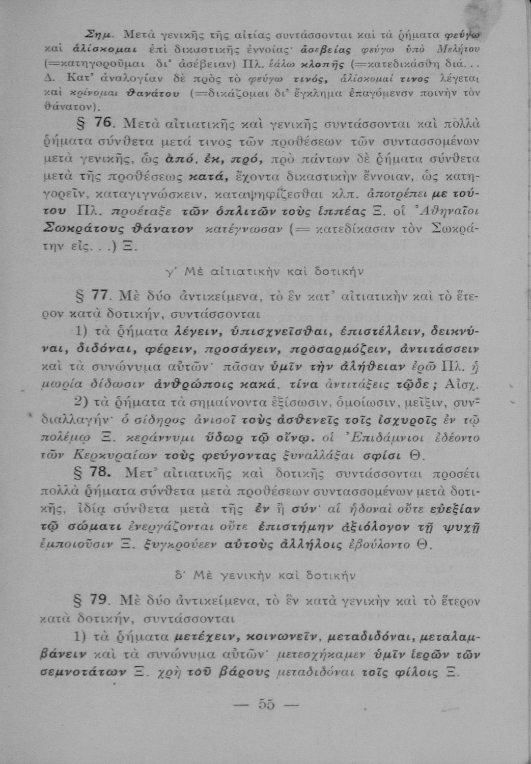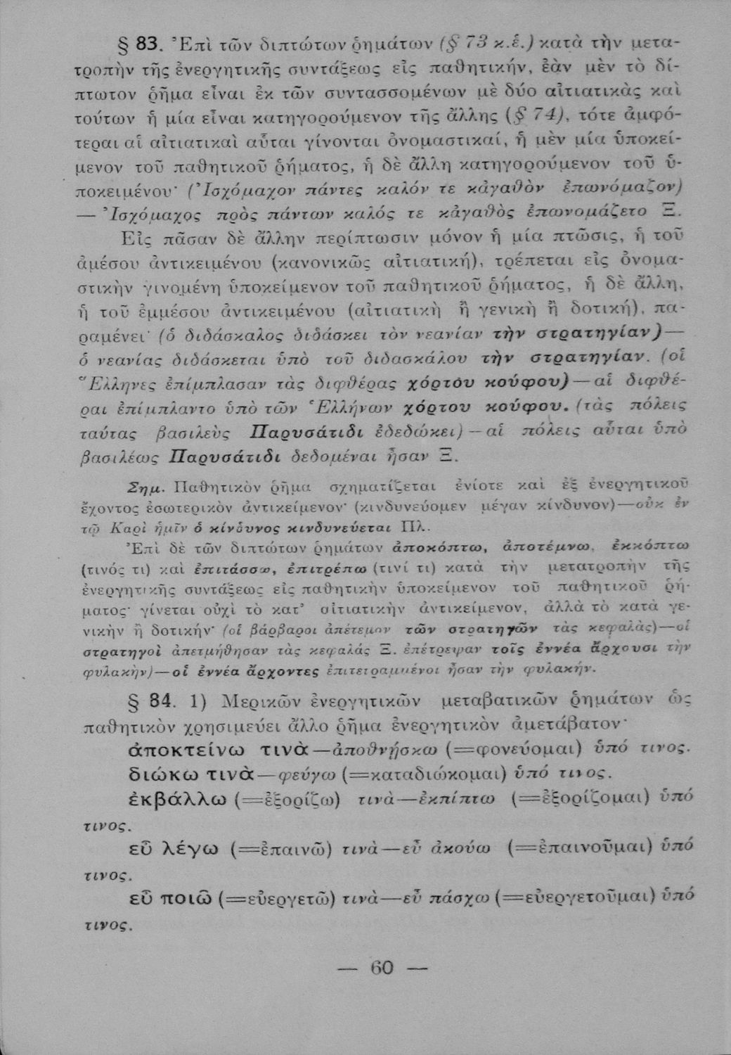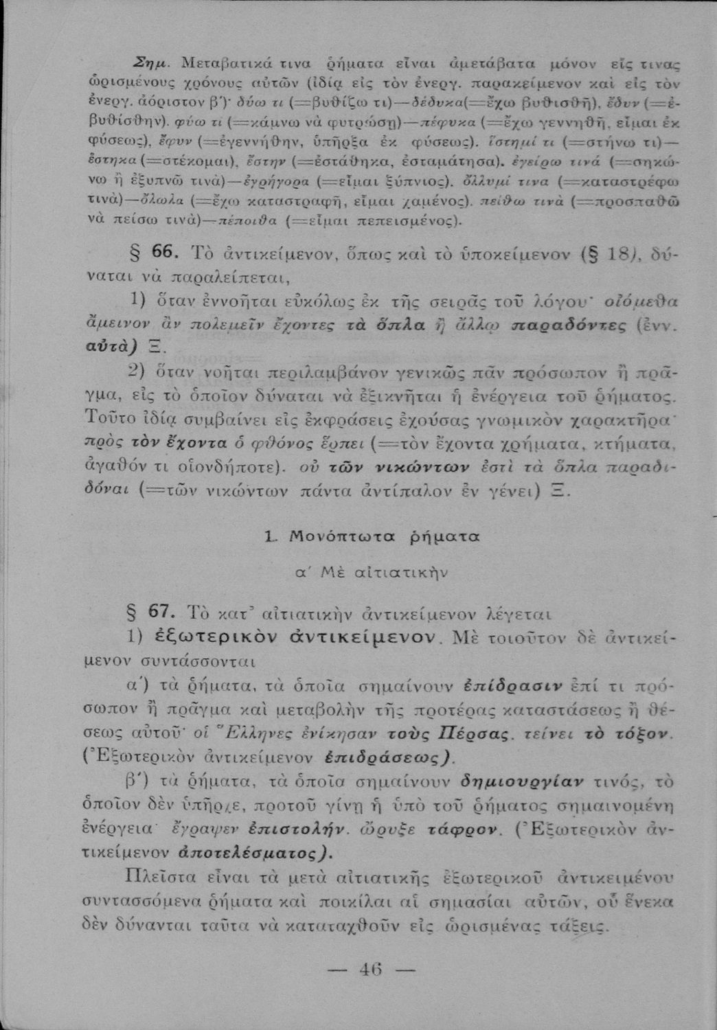 Βαθμίδα εκπαίδευσης: Δευτεροβάθμια Μάθημα: Αρχαία Ελληνικά Γλώσσα: Καθαρεύουσα Παρουσίαση περιεχομένου: Σχολικό εγχειρίδιο Αρχαίων Ελληνικών που εξετάζει τα μέρη του λόγου και την σύνταξή τους. |