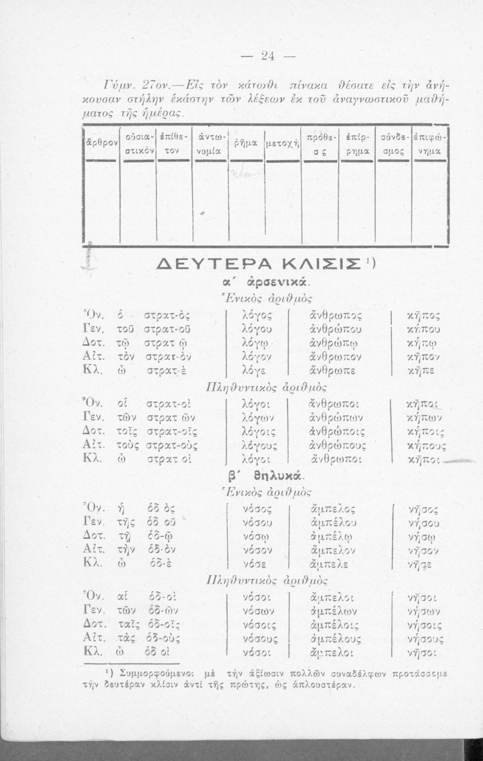 Σχολικό εγχειρίδιο Γ΄ και Δ΄ Δημοτικού που περιέχει τη γραμματικής της νέας ελληνικής. Την έκδοση επιμελήθηκε ο Γ. Λογοθέτης, τέως διευθυντής του επταταξίου δημ. Τμήμ.της Ευαγγελικής Σχολής.