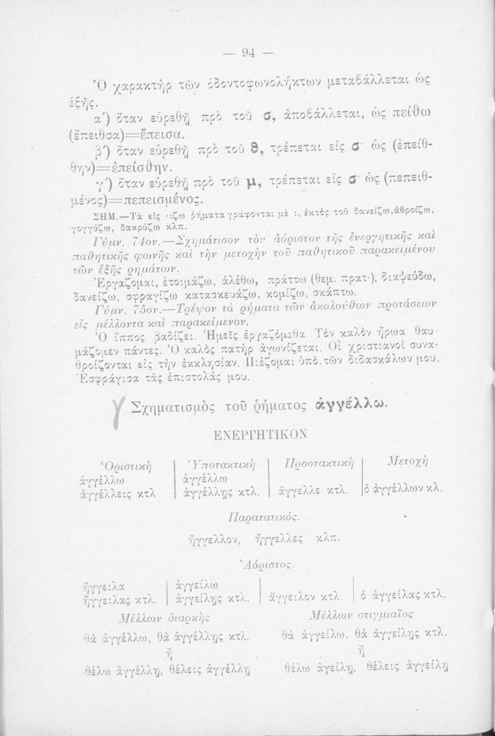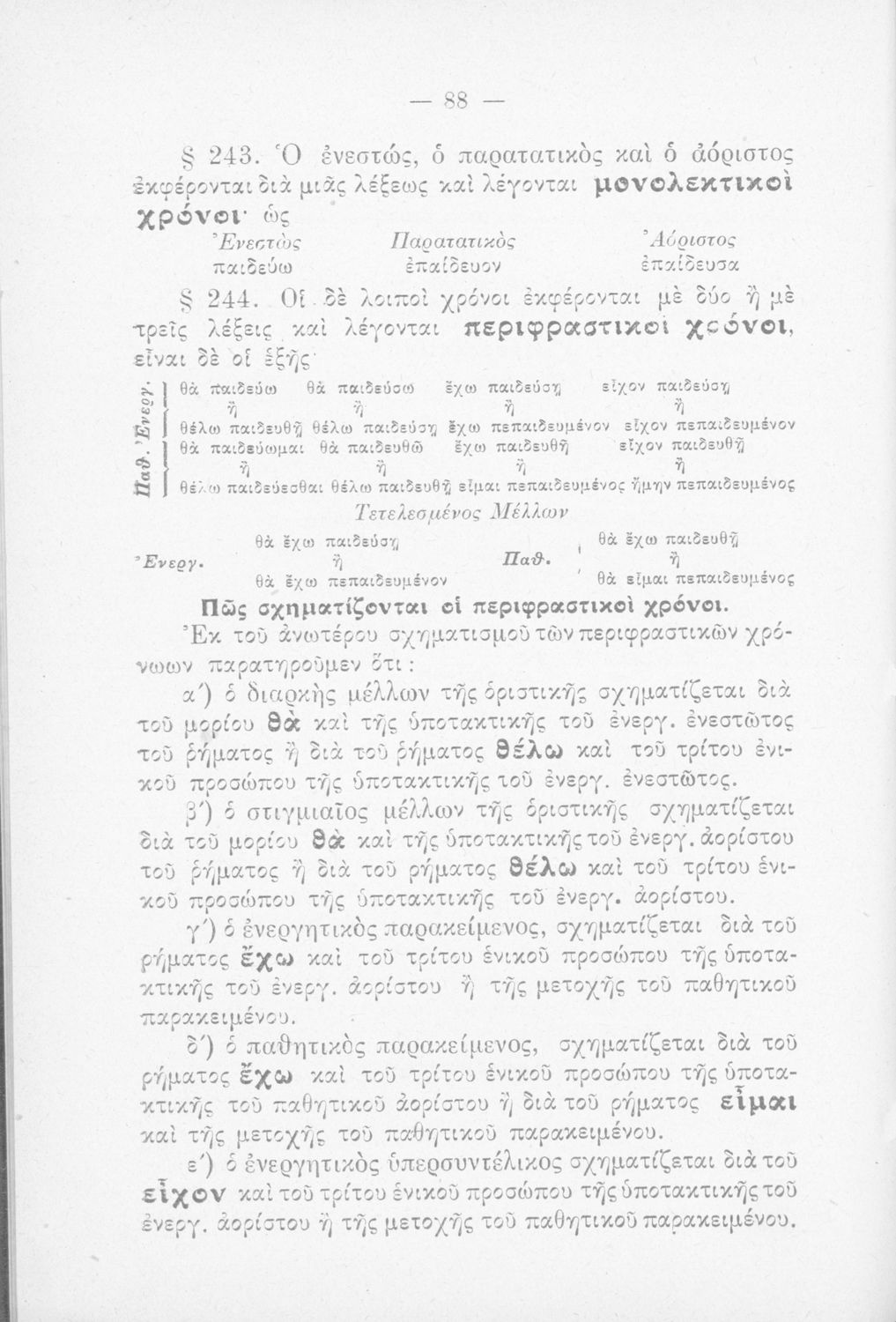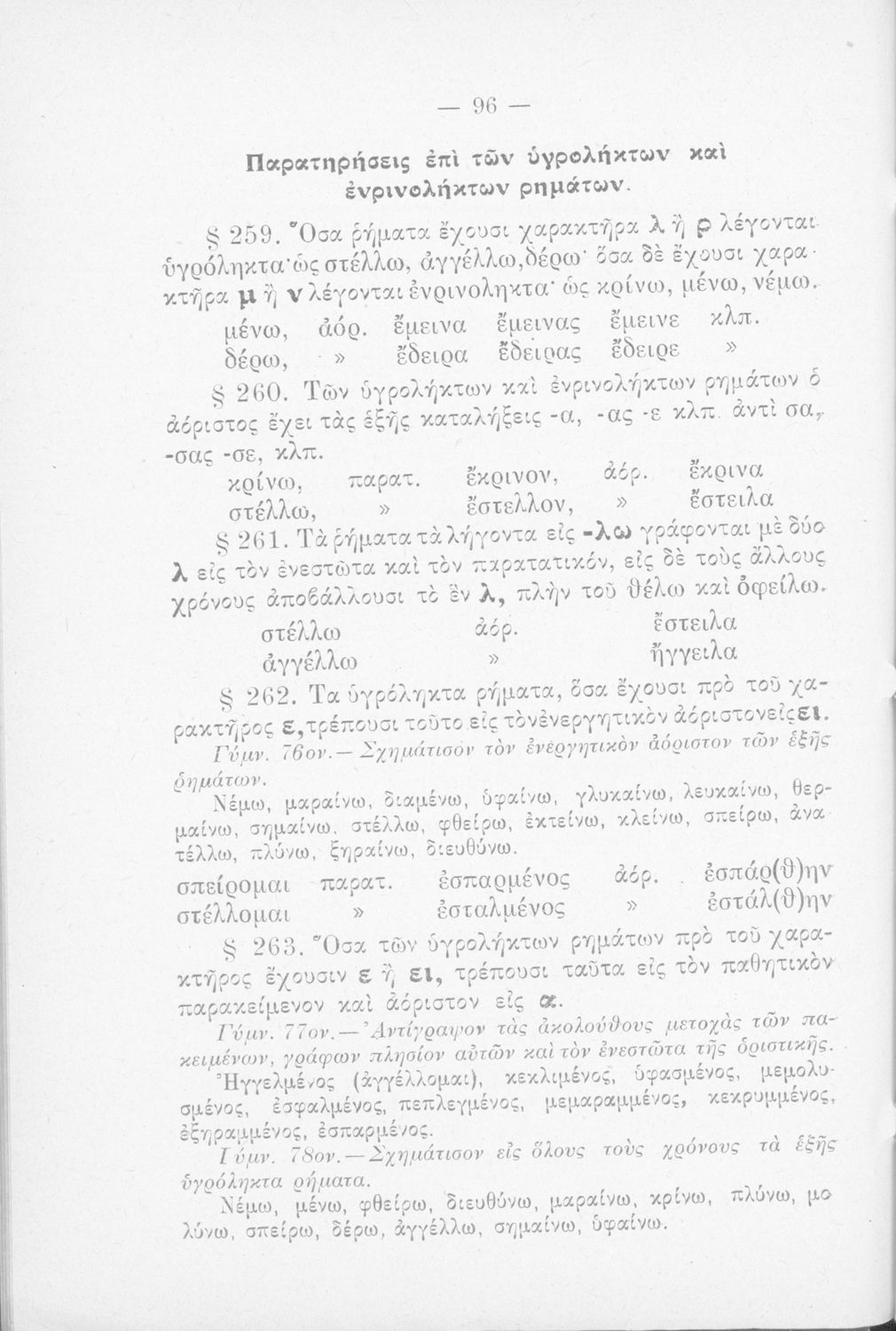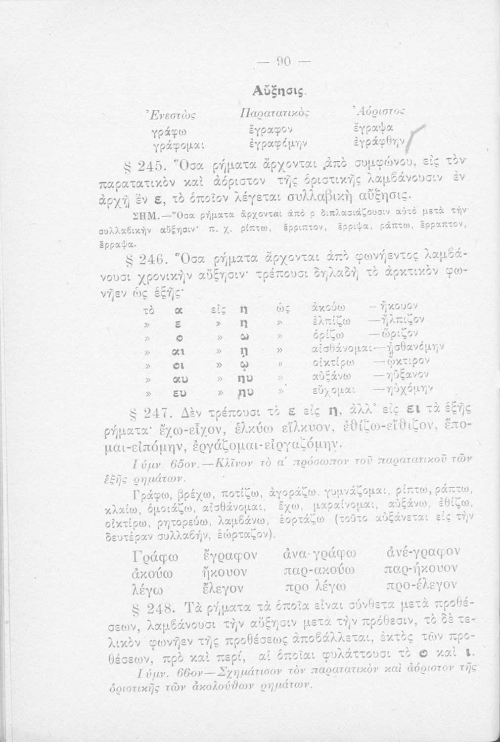 Σχολικό εγχειρίδιο Αρχαίων Ελληνικών για τα Ελληνικά Σχολεία και Παρθεναγωγεία που περιέχει τους κανόνες γραμματικής και είναι χωρισμένο σε φθογγολογικό, τυπολογικό και ετυμολογικό μέρος.
