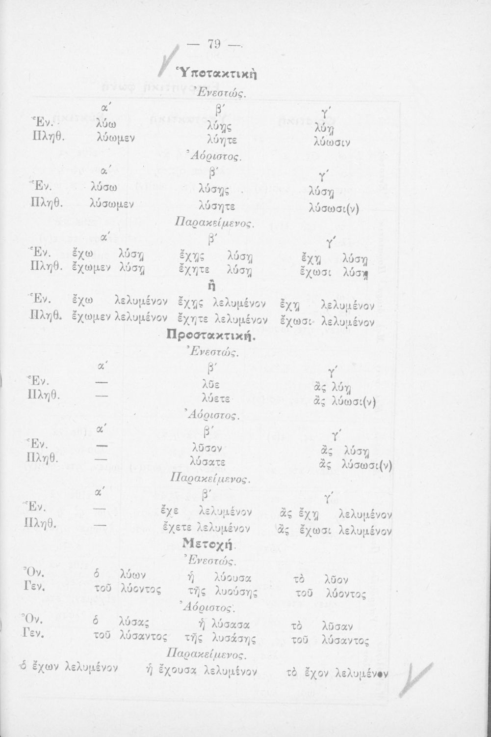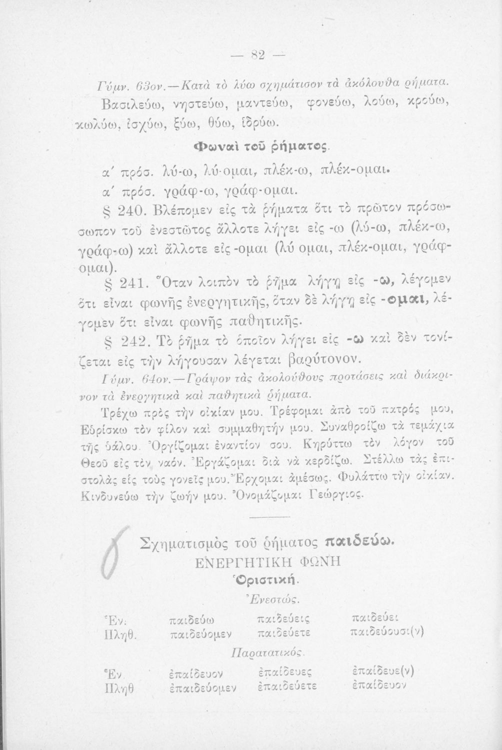Σχολικό εγχειρίδιο για τις τάξεις του Δημοτικού και συγκεκριμένα της γραμματικής των Αρχαίων Ελληνικών. Το εγχειρίδιο χωρίζεται σε 2 μέρη. Το πρώτο μέρος περιλαμβάνει το τεχνολογικό μέρος της γραμματικής, όπου