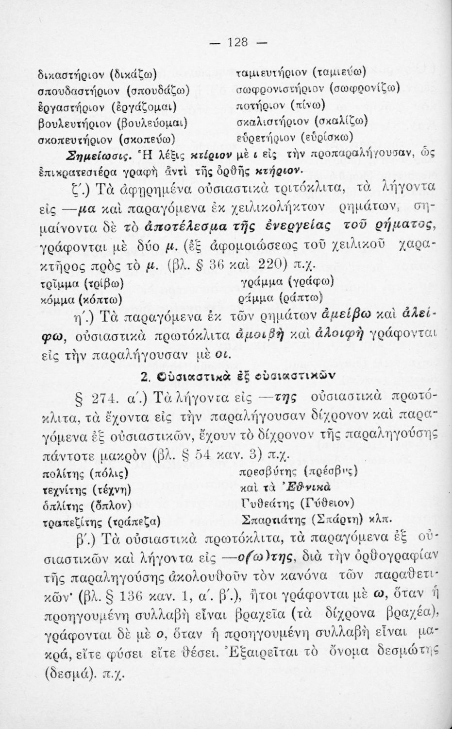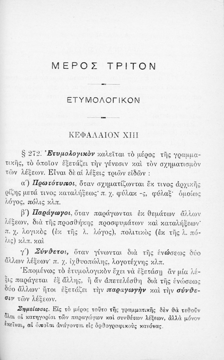 Σχολικό εγχειρίδιο Αρχαίων Ελληνικών για τα Ελληνικά Σχολεία, Παρθεναγωγεία και Γυμνάσια που περιέχει τους κανόνες γραμματικής και είναι χωρισμένο σε φθογγολογικό, τυπολογικό και ετυμολογικό μέρος.