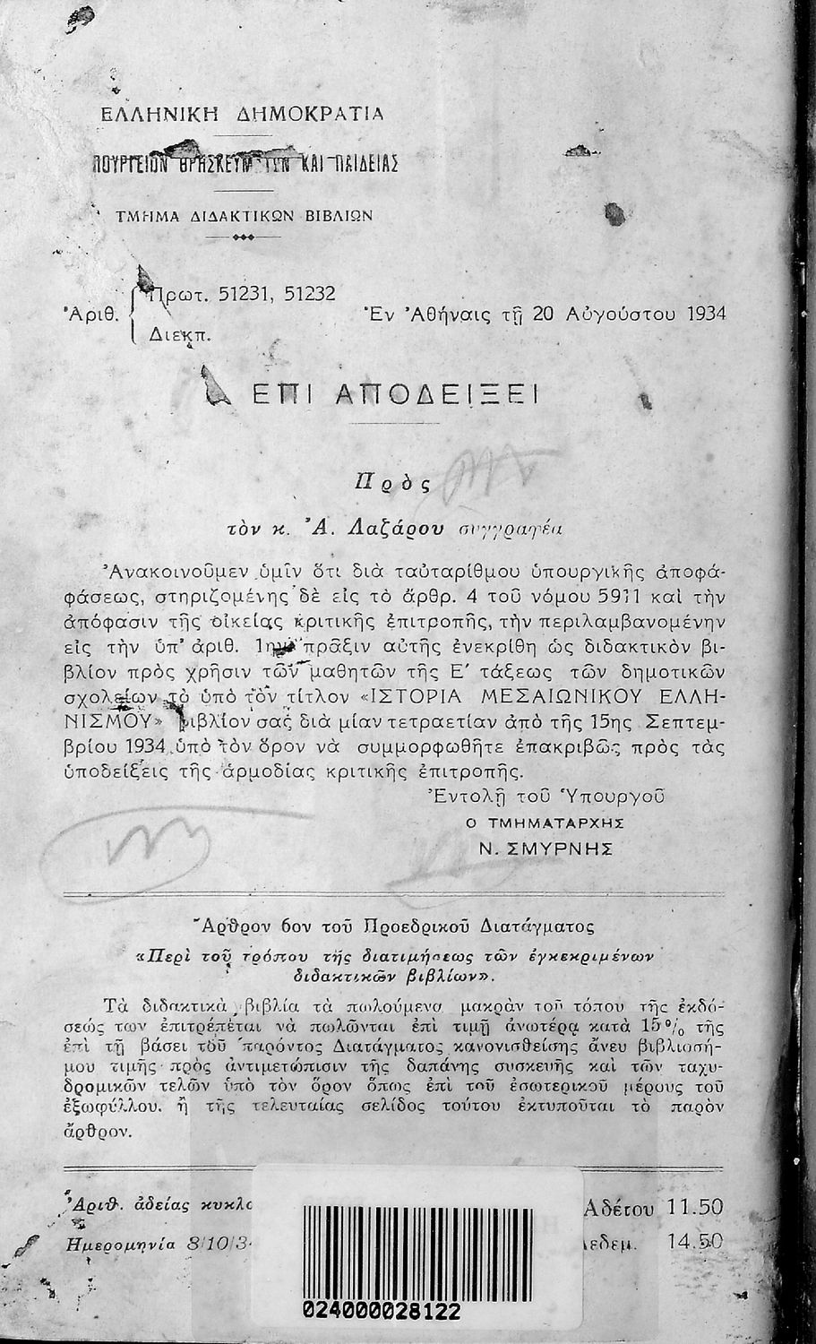 Υπουργική απόφαση / Σύμβαση: 51231/51232/20-8-1934