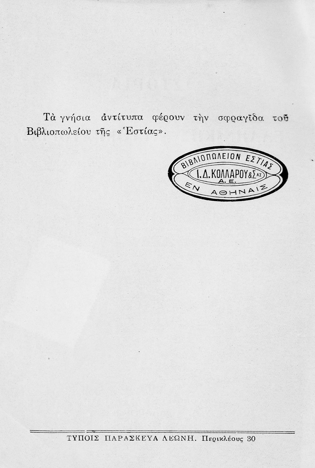 Εκδότης: Ιωάννης Δ. Κολλάρος και ΣΙΑ, Βιβλιοπωλείο της "Εστίας"