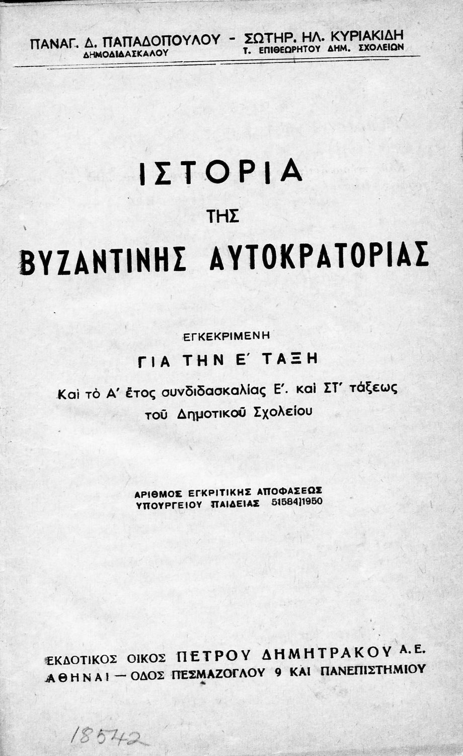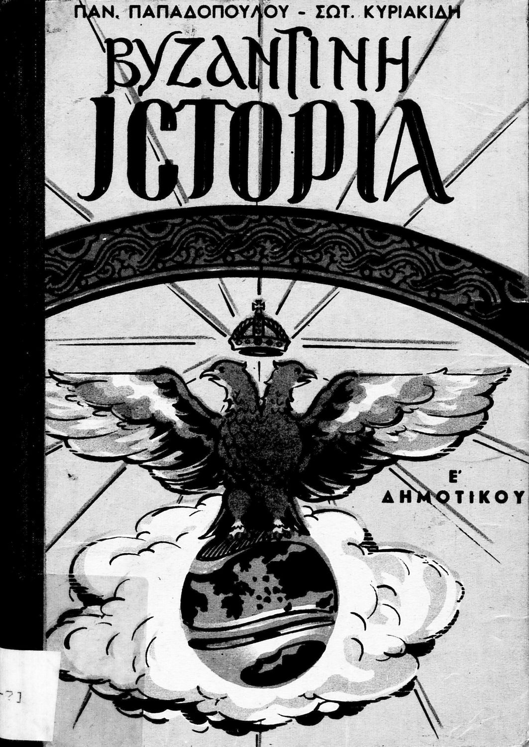 Κωδικός αναγνώρισης: 01-18542 Τίτλος: Ιστορία της Βυζαντινής Αυτοκρατορίας προς χρήσιν των μαθητών της Ε΄ τάξεως των Δημοτικών Σχολείων και της Ε΄ και ΣΤ΄ τάξεως κατά το πρώτον έτος συνδιδασκαλίας αυτών Συγγραφέας: Π. Δ. Παπαδόπουλος, Σ. Ηλ. Κυριακίδης Μέγεθος και υπόστρωμα: Μαθητικό βοήθημα, 20εκ., σκληρό εξώφυλλο, 120 σελίδες. Φωτογραφίες (ασπρόμαυρες). |