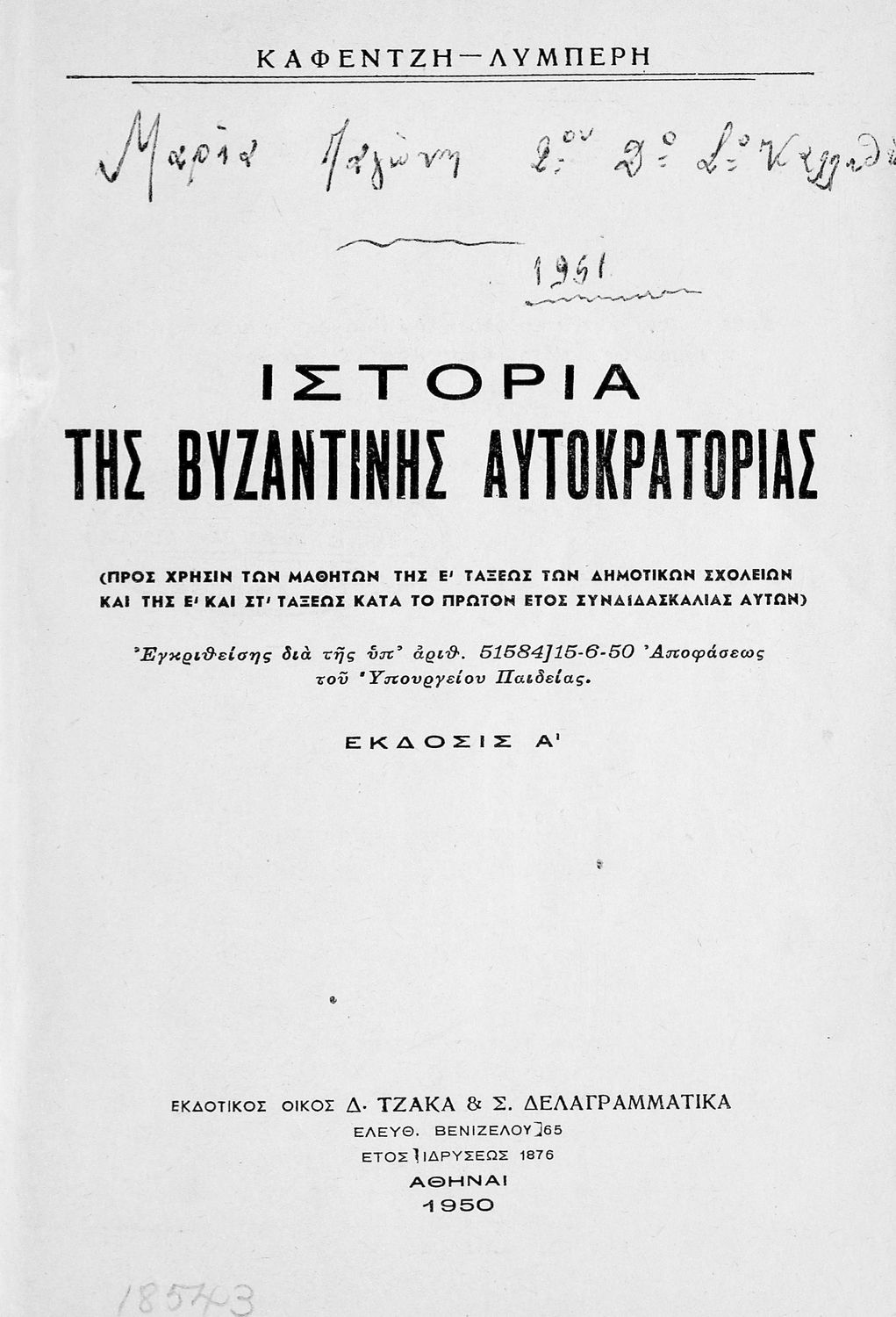 Τίτλος: Ιστορία της Βυζαντινής Αυτοκρατορίας προς χρήσιν των μαθητών της Ε΄ Τάξεως των Δημοτικών Σχολείων και της Ε΄ και ΣΤ΄ Τάξεως κατά το πρώτον έτος συνδιδασκαλίας αυτών