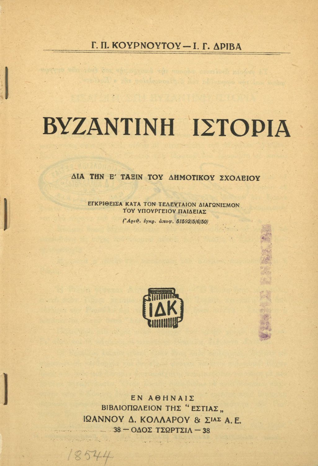 Κωδικός αναγνώρισης: 01-18544 Τίτλος: Βυζαντινή ιστορία δια την Ε΄ τάξιν του Δημοτικού Σχολείου Συγγραφέας: Γ. Π. Κουρνούτος, Ι. Γ. Δρίβας Μέγεθος και υπόστρωμα: Μαθητικό βοήθημα, 21εκ., μαλακό εξώφυλλο, 111 σελίδες. Εξώφυλλο (έγχρωμο), σκίτσα (ασπρόμαυρα). |