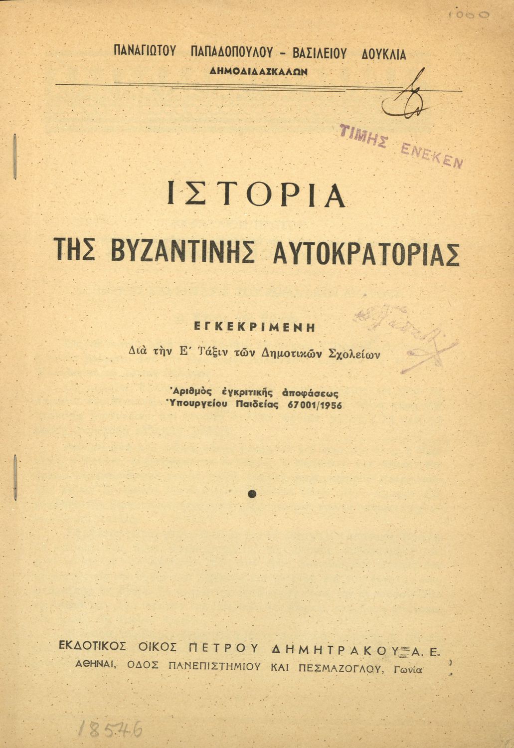 Κωδικός αναγνώρισης: 01-18546 Τίτλος: Ιστορία της Βυζαντινής Αυτοκρατορίας δια την Ε΄ τάξιν των Δημοτικών Σχολείων Συγγραφέας: Παναγιώτης Παπαδόπουλος, Βασίλειος Δούκλιας Μέγεθος και υπόστρωμα: Μαθητικό βοήθημα, 24εκ., μαλακό εξώφυλλο, 102 σελίδες. Εξώφυλλο (έγχρωμο), σκίτσα (ασπρόμαυρα). |