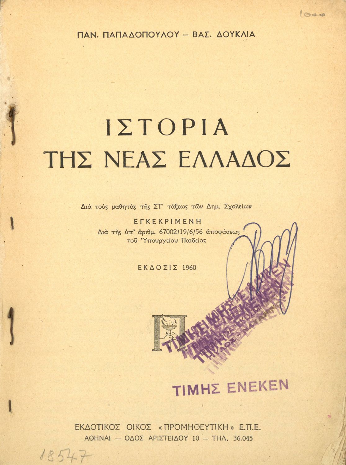 Εκδότης: Προμηθευτική Ε.Π.Ε Έτος έκδοσης: 1960 Τόπος έκδοσης: Αθήνα Υπουργική απόφαση / Σύμβαση: 67002/19-6-1956 Έτος έγκρισης: 1956 |