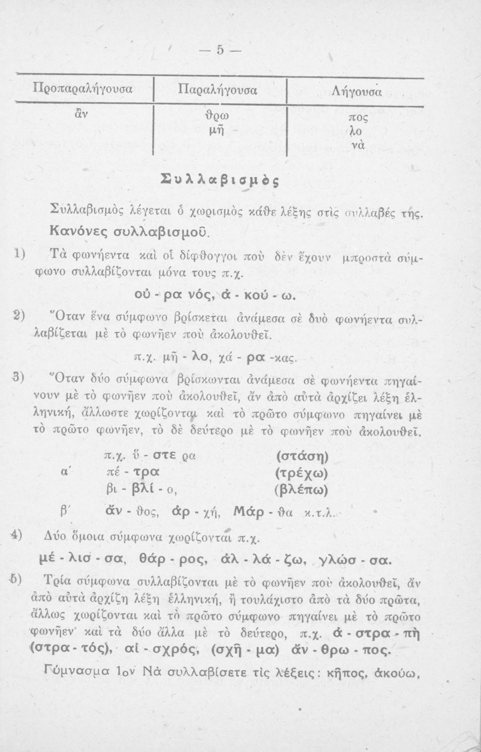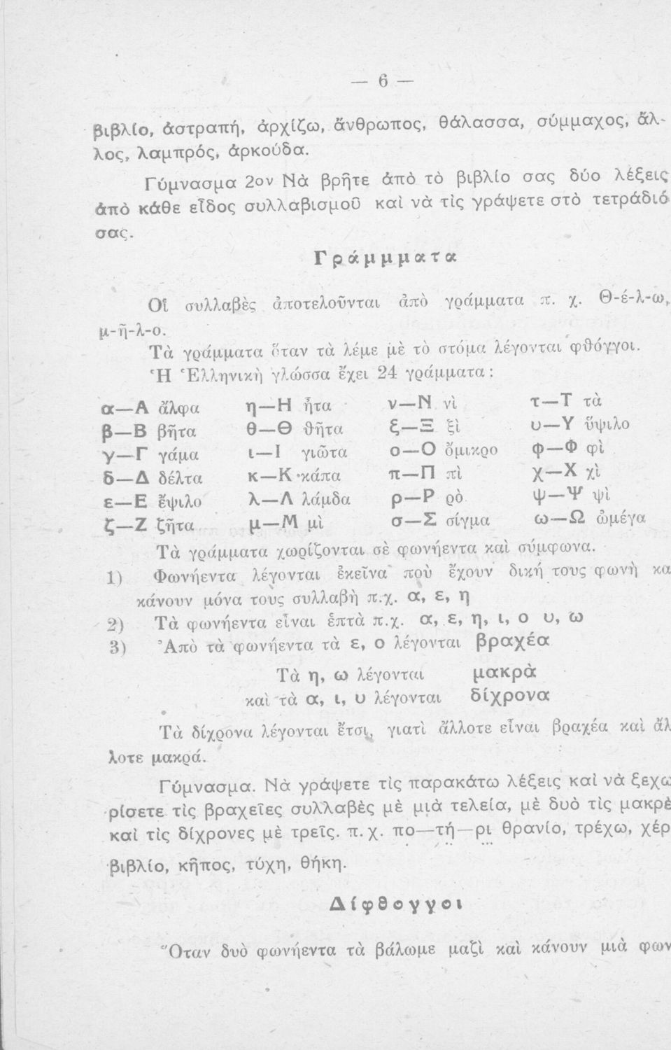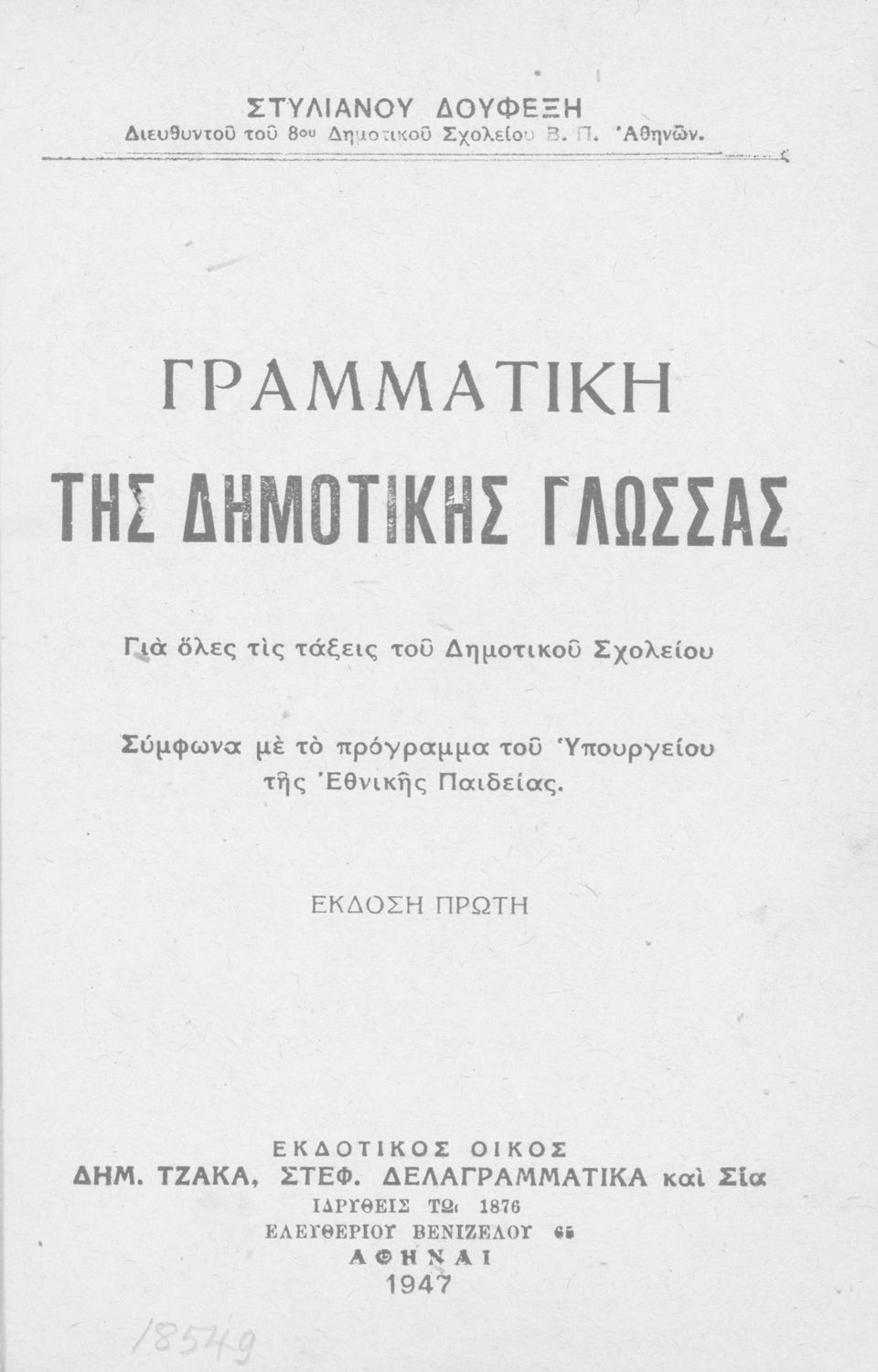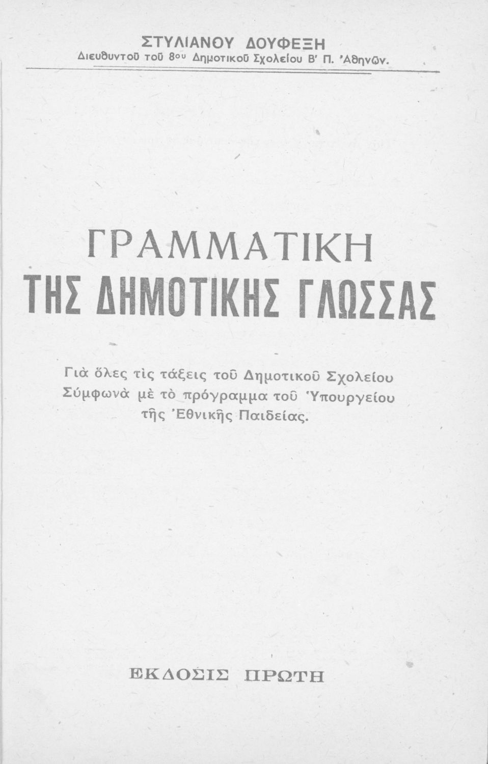 Μαθητικό βοήθημα Γλώσσας Δημοτικού που περιέχει τους γραμματικούς κανόνες της νέας ελληνικής. Ο συγγραφέας ήταν δημοδιδάσκαλος και διδάκτωρ της Νομικής.