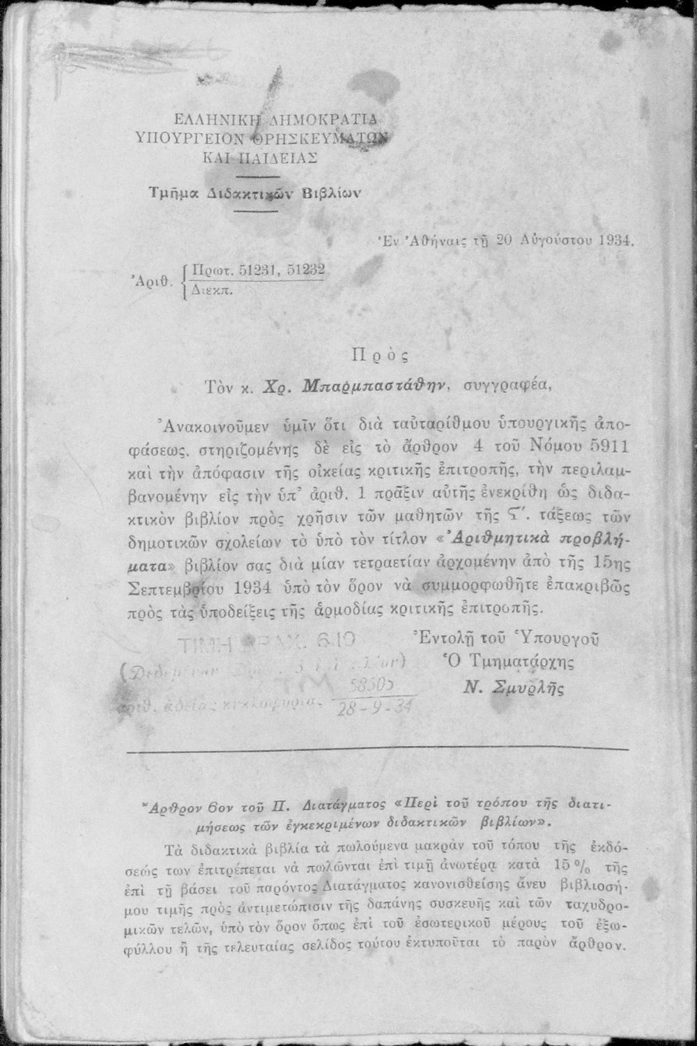 Εκδότης: Ιωάννης Δ. Κολλάρος Έτος έκδοσης: 1934 Τόπος έκδοσης: Αθήνα Έκδοση: 1η Υπουργική απόφαση / Σύμβαση: 51231/51232/20-8-1934 Έτος έγκρισης: 1934 |