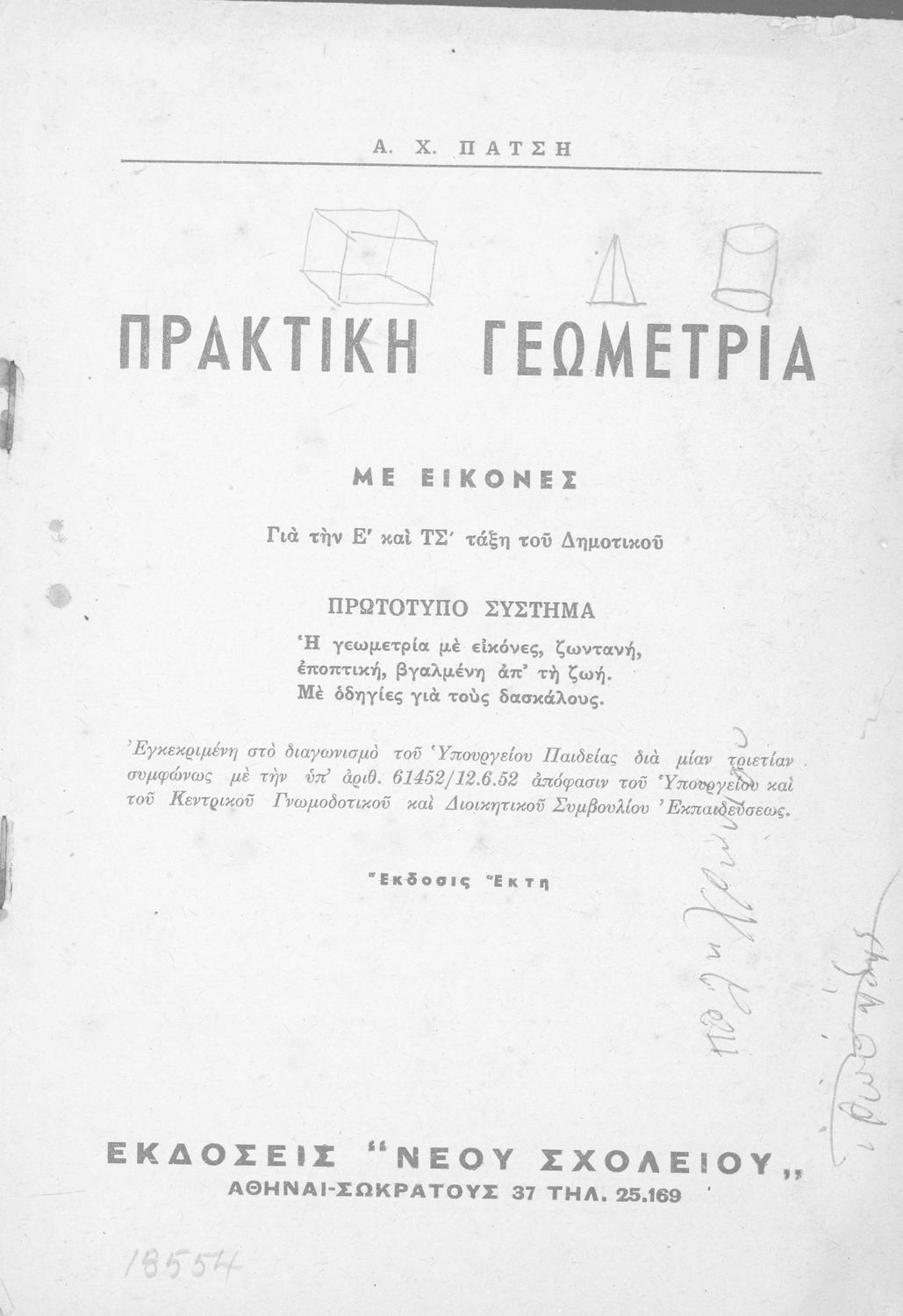 Κωδικός αναγνώρισης: 01-18554 Τίτλος: Πρακτική γεωμετρία δια τους μαθητάς Ε΄ και ΣΤ΄ τάξεως των Δημοτικών Σχολείων Συγγραφέας: Α. Χ. Πάτσης Μέγεθος και υπόστρωμα: Μαθητικό βοήθημα, 24εκ., μαλακό εξώφυλλο, 95 σελίδες. Σκίτσα και εικόνες (ασπρόμαυρα), εξώφυλλο (έγχρωμο). |