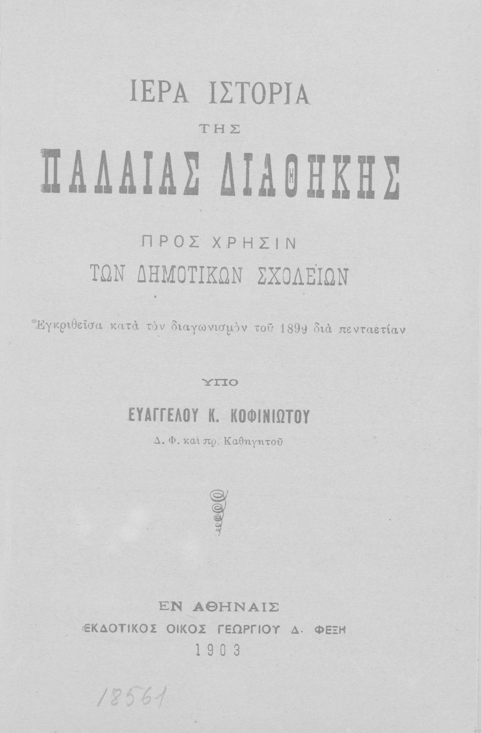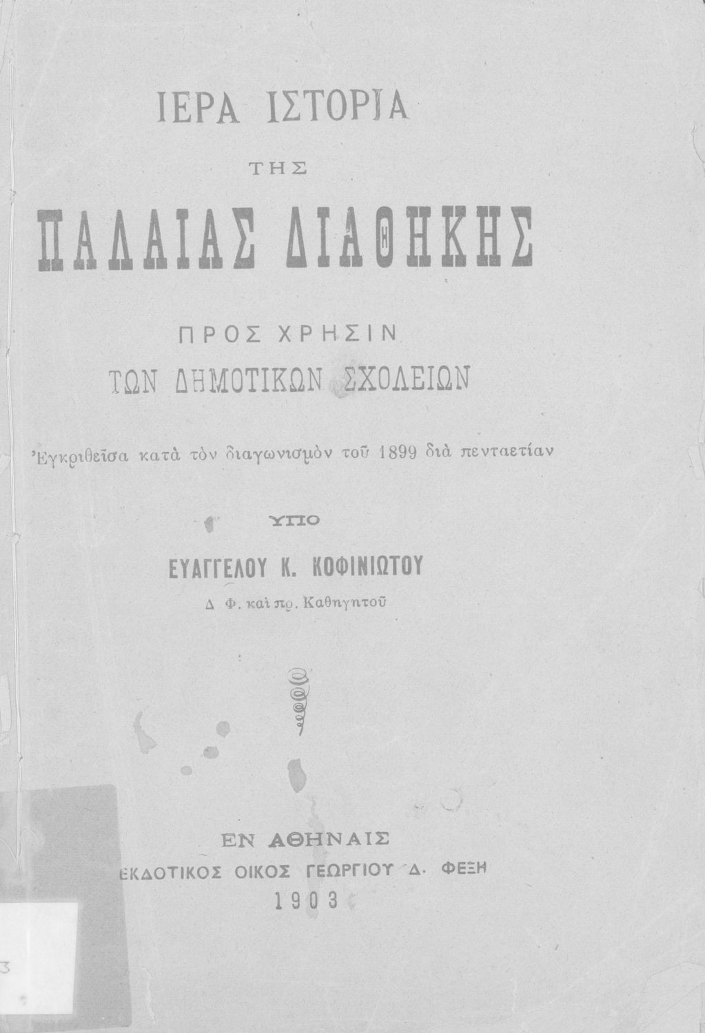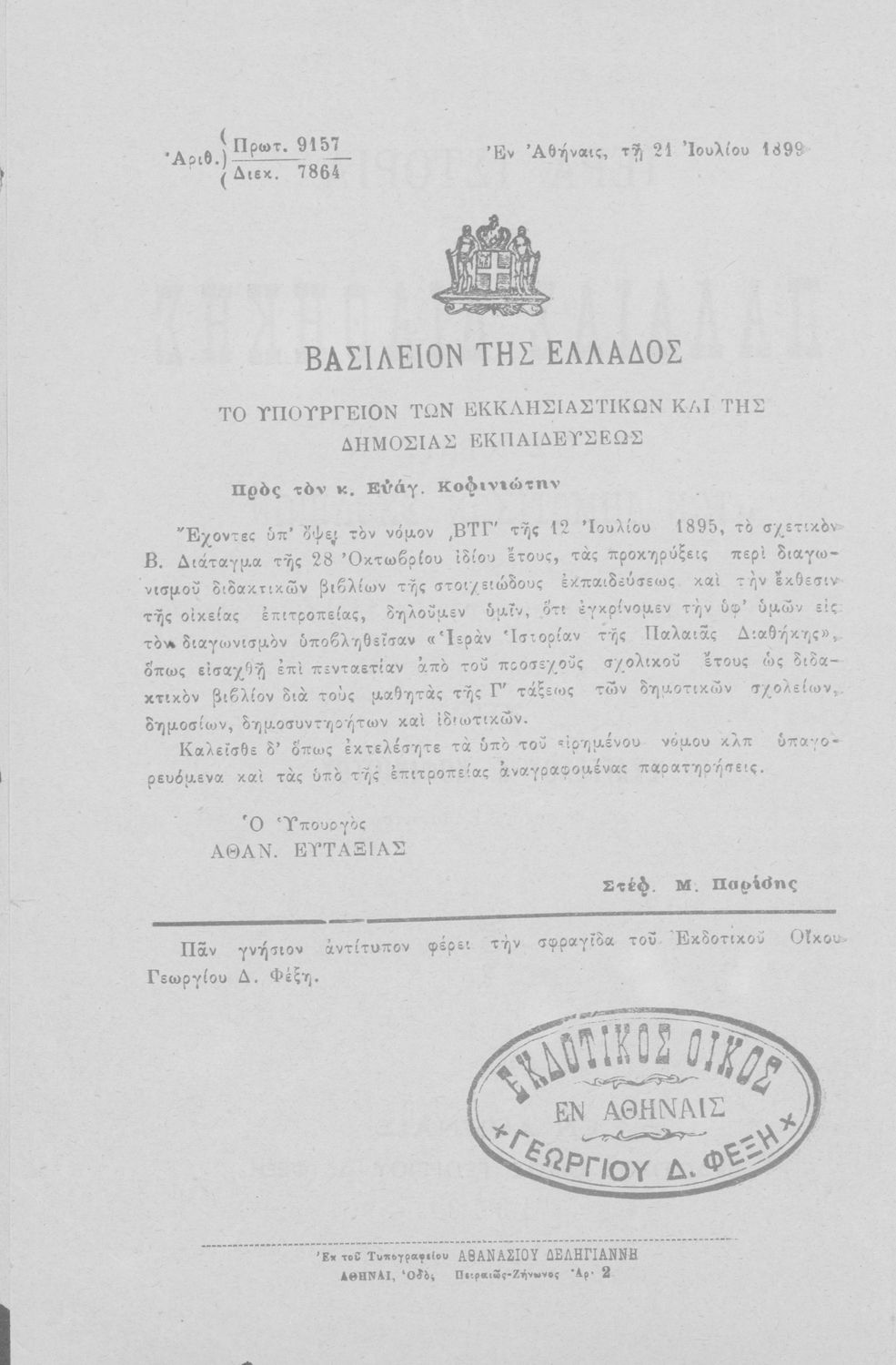 Εκδότης: Γεώργιος Δ. Φέξης Έτος έκδοσης: 1903 Τόπος έκδοσης: Αθήνα Υπουργική απόφαση / Σύμβαση: 9157/21-7-1899 Έτος έγκρισης: 1899 |