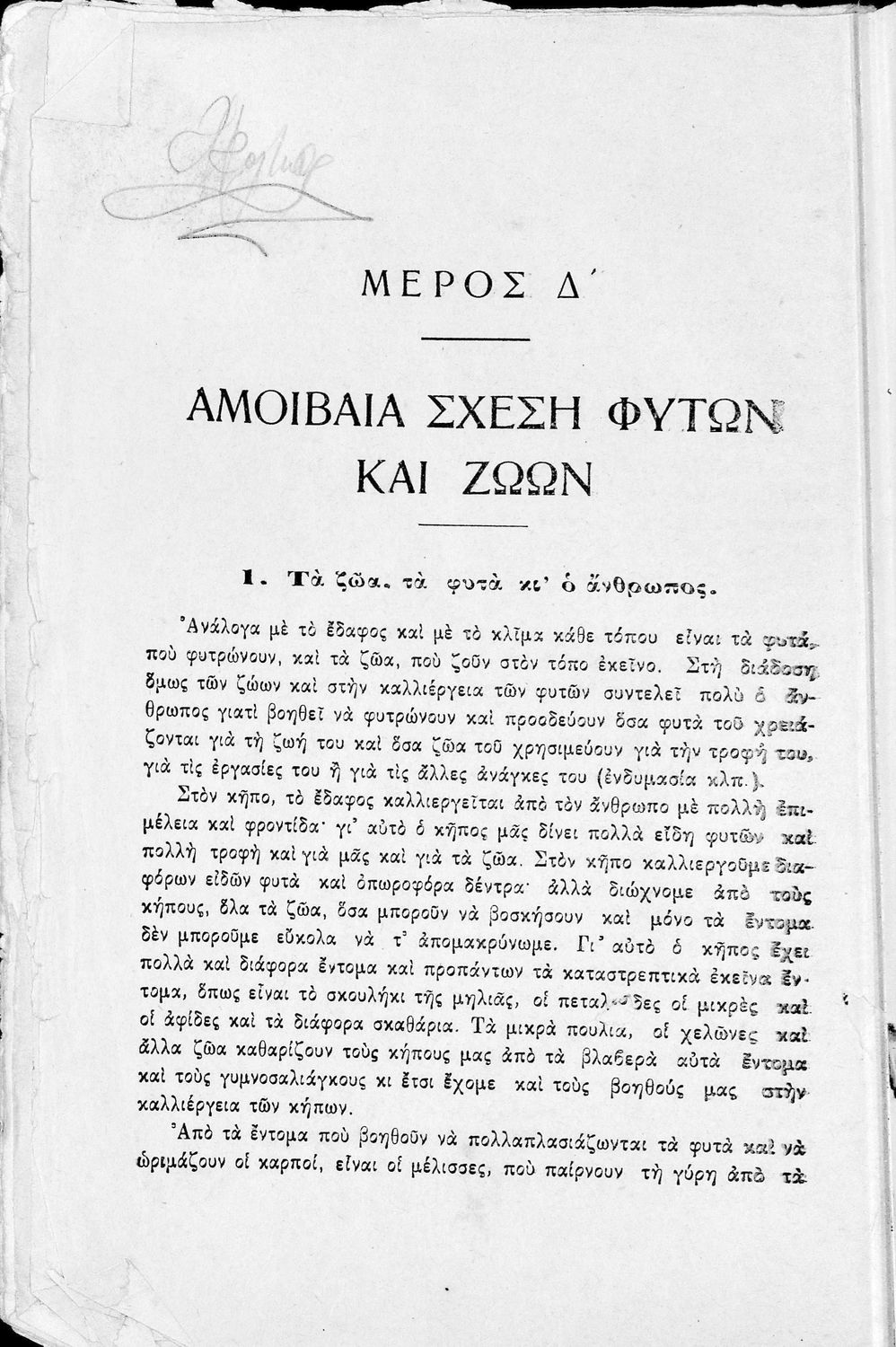 Μαθητικό βοήθημα Φυσικής Ιστορίας Δημοτικού που περιέχει στοιχεία φυτολογίας, ανθρωπολογίας, ζωολογίας και εξετάζει την αλληλεξάρτηση ζώων και φυτών.