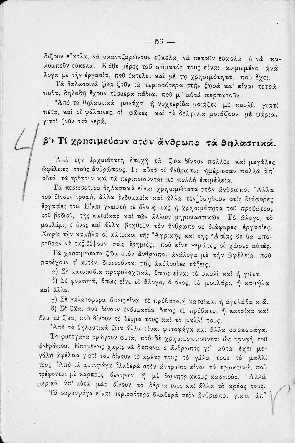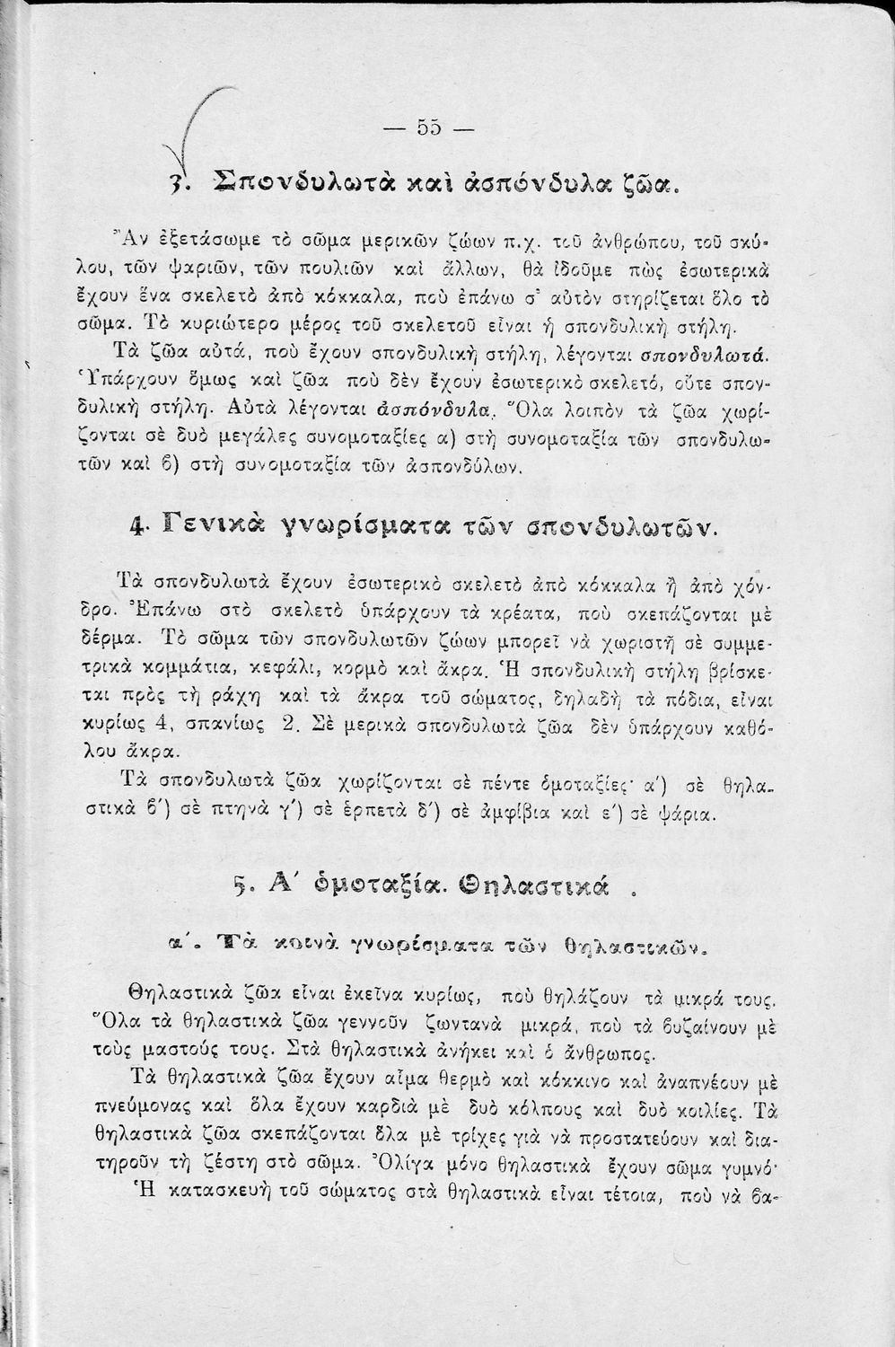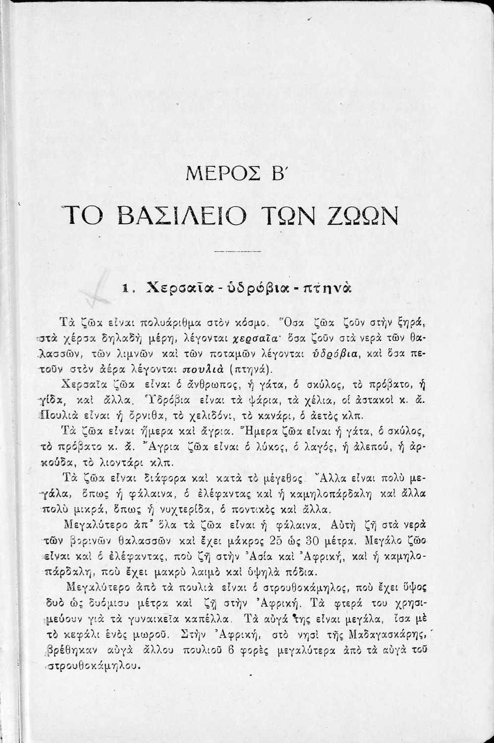 Σχολικό εγχειρίδιο της Α' Ελληνικού Σχολείου για το μάθημα της Φυσικής Ιστορίας. Το εγχειρίδιο περιλαμβάνει τα βασικά ζητήματα της επιστήμης της ζωολογίας (κατηγορίες και διαφορές μεταξύ ζώων, πτηνών και ...