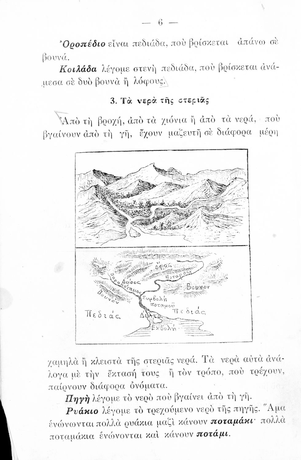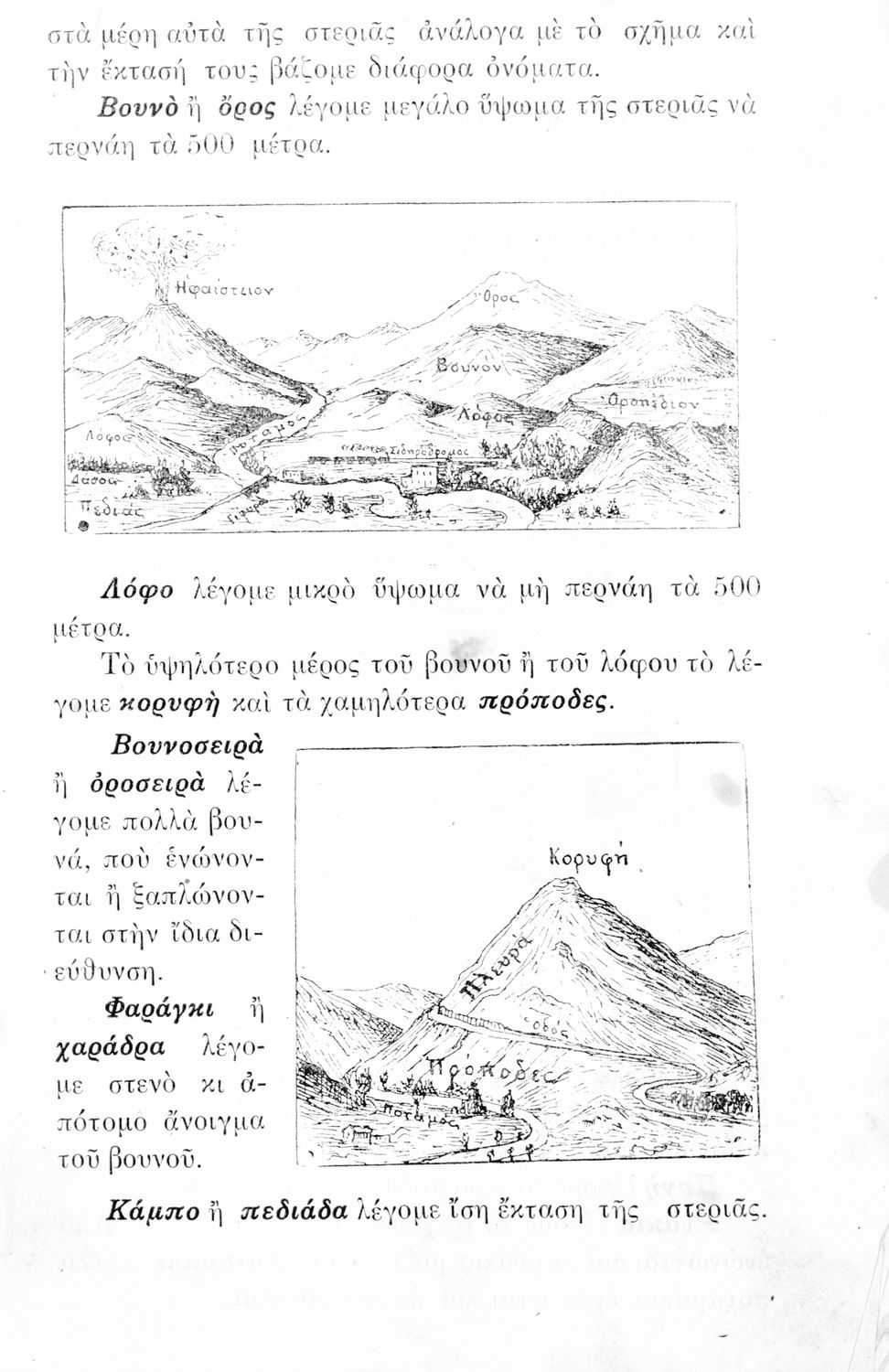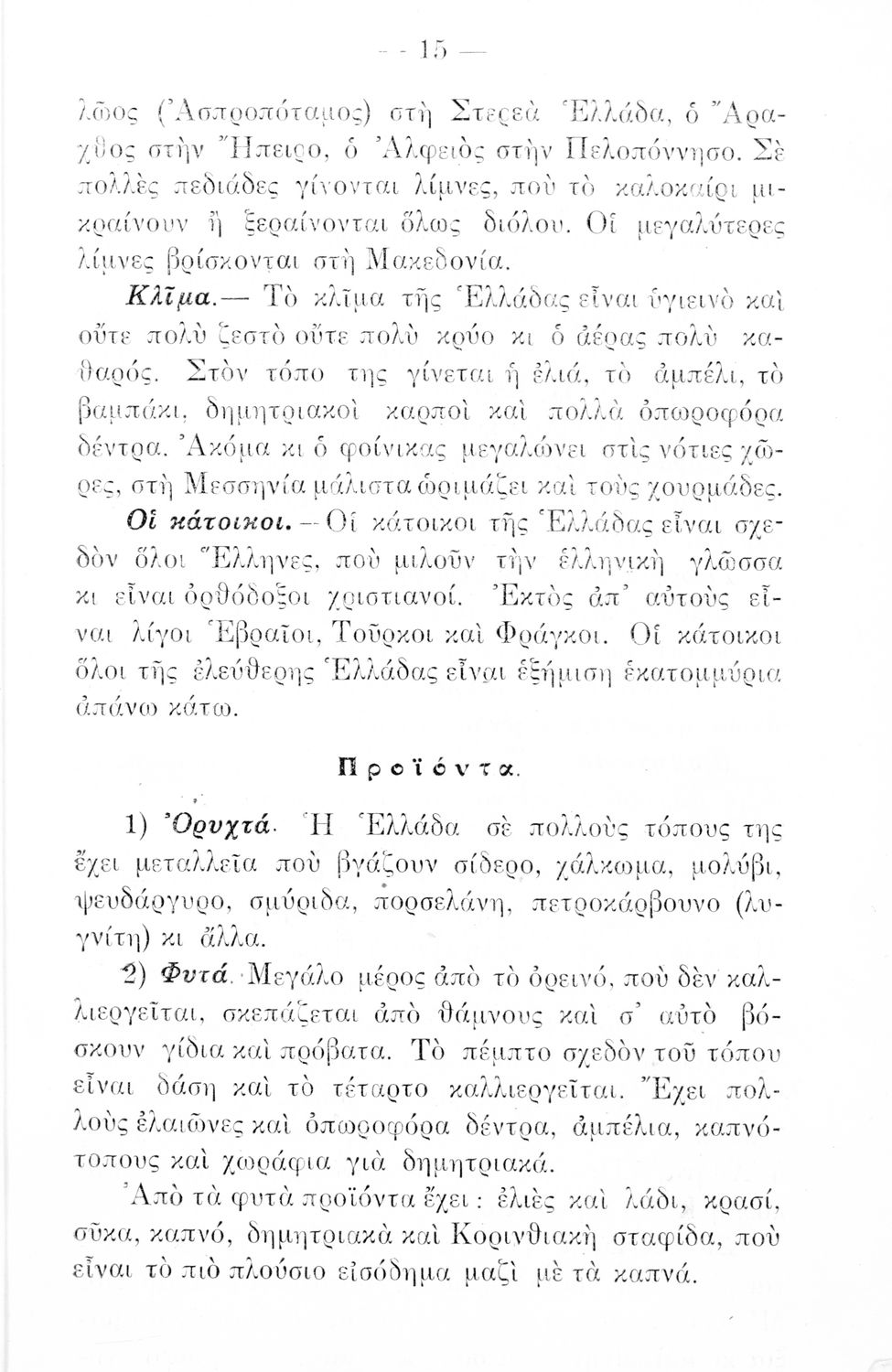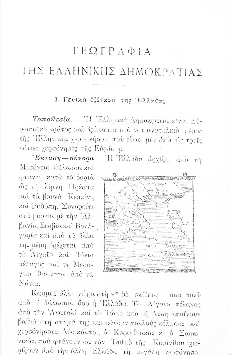 Σχολικό Εγχειρίδιο Γεωγραφίας Δημοτικού που περιέχει στοιχεία φυσικής γεωγραφίας και εξετάζει την Ελλάδα ανά διαμέρισμα και νομό από γεωφυσική και οικονομική άποψη.