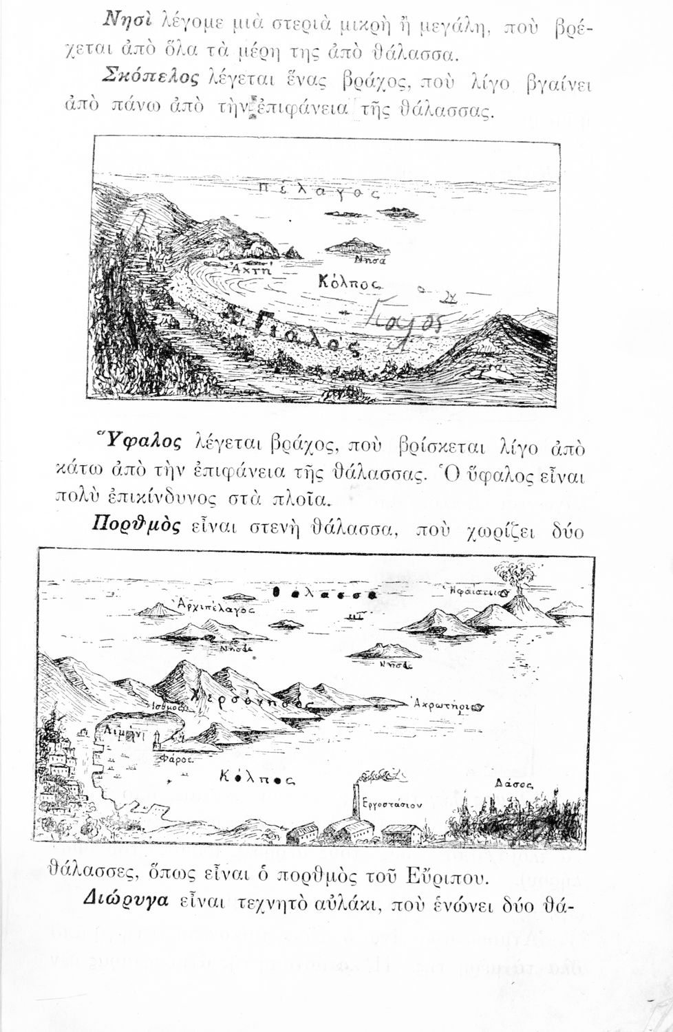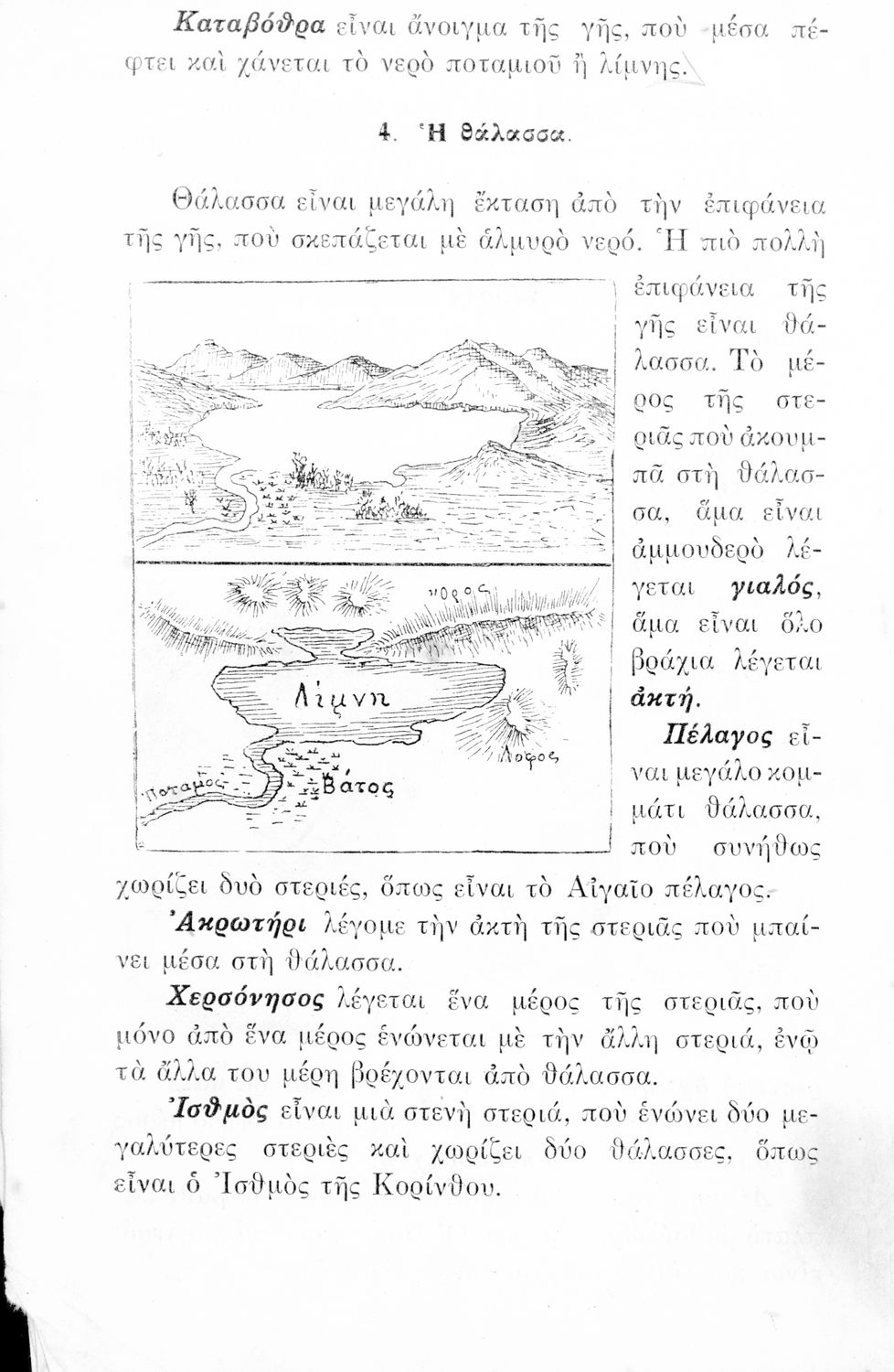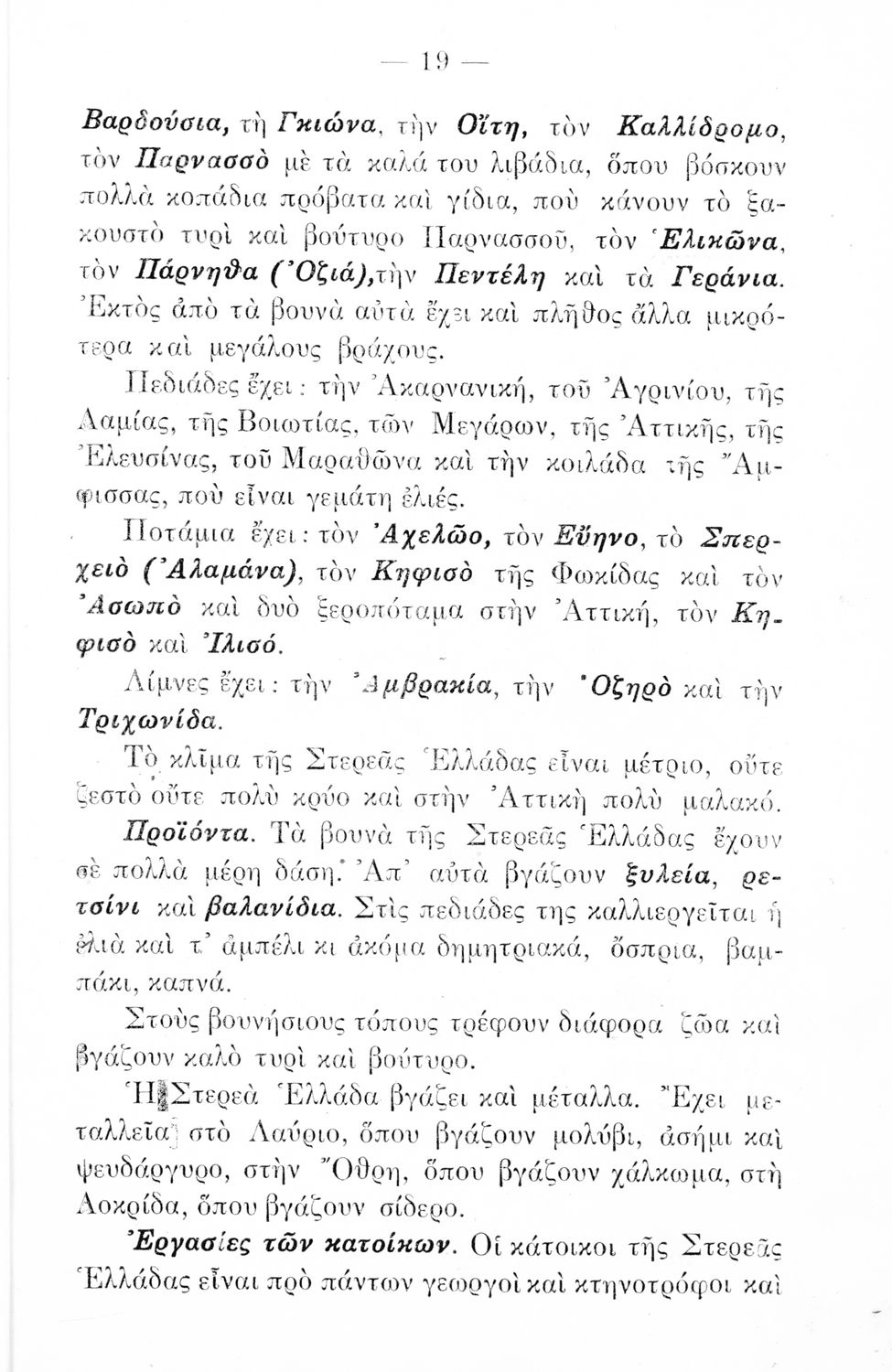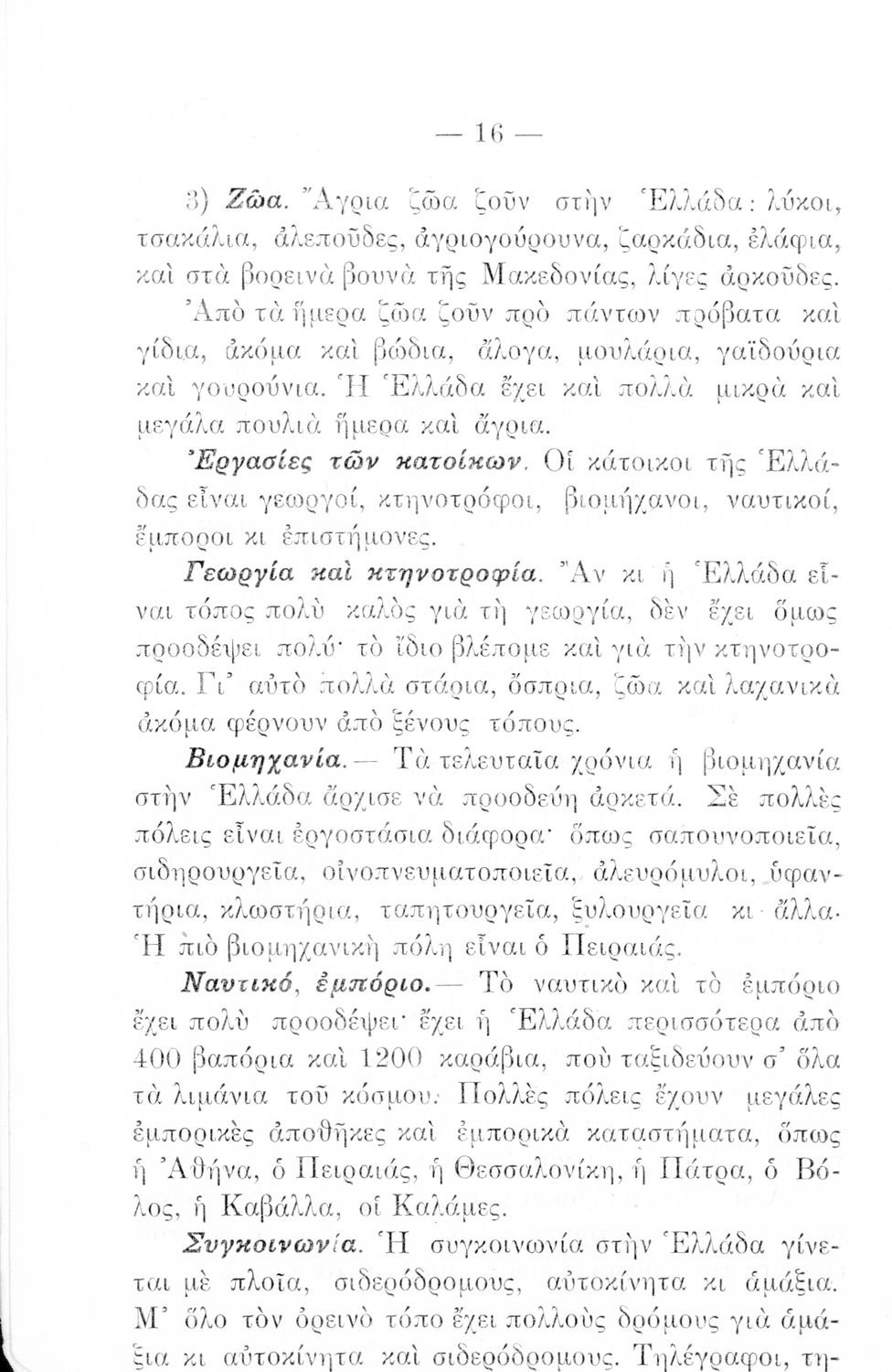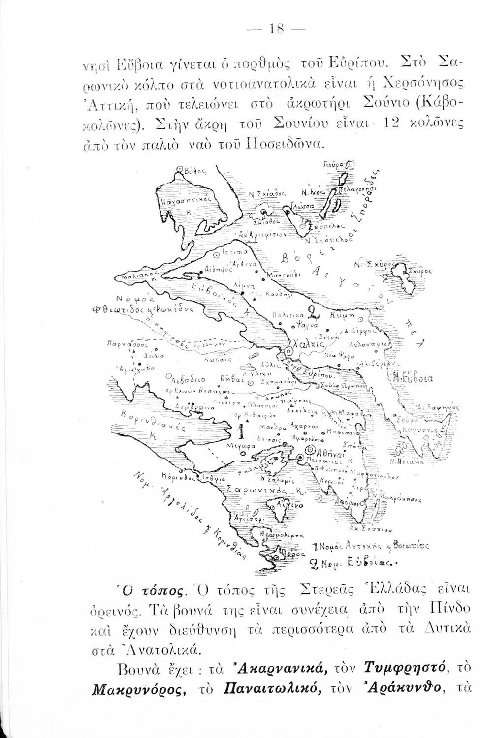 Σχολικό Εγχειρίδιο Γεωγραφίας Δημοτικού που περιέχει στοιχεία φυσικής γεωγραφίας και εξετάζει την Ελλάδα ανά διαμέρισμα και νομό από γεωφυσική και οικονομική άποψη.