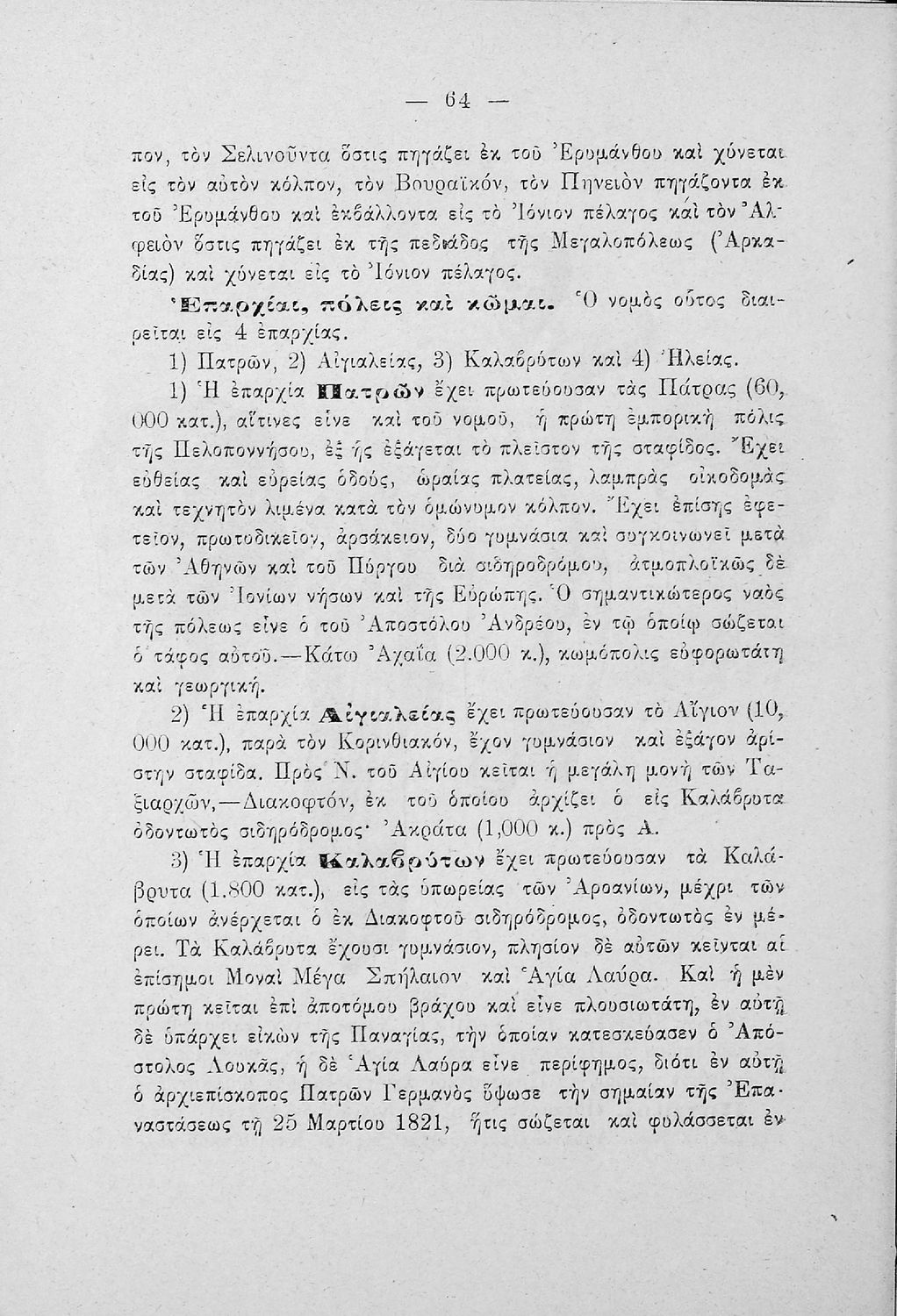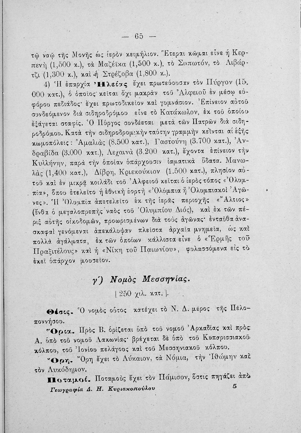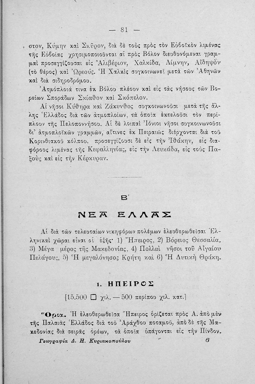 Σχολικό εγχειρίδιο Γεωγραφίας Δημοτικού που εξετάζει την Ελλάδα από γεωφυσική, πολιτική και οικονομική άποψη. Περιλαμβάνει και εκτενή αναφορά στην Τουρκική Θράκη, την Ανατολική Ρωμυλία, την Σερβική και Βουλγαρική Μακεδονία, την Μικρά Ασία, τη Συρία, την Παλαιστίνη, και την Κύπρο.