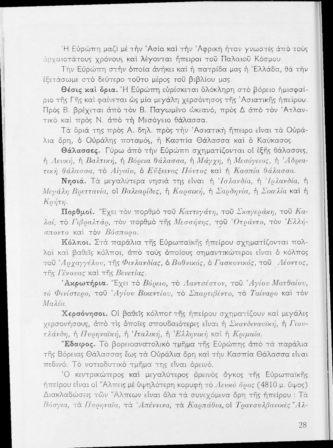 Παρουσίαση περιεχομένου: Μαθητικό βοήθημα Γεωγραφίας ΣΤ΄ Γυμνασίου που περιέχει στοιχεία φυσικής και μαθηματικής γεωγραφίας και εξετάζει τα κράτη της Ευρώπη από γεωφυσική, πολιτική και οικονομική άποψη. Περιλαμβάνει και στοιχεία ανθρωπογεωγραφίας.