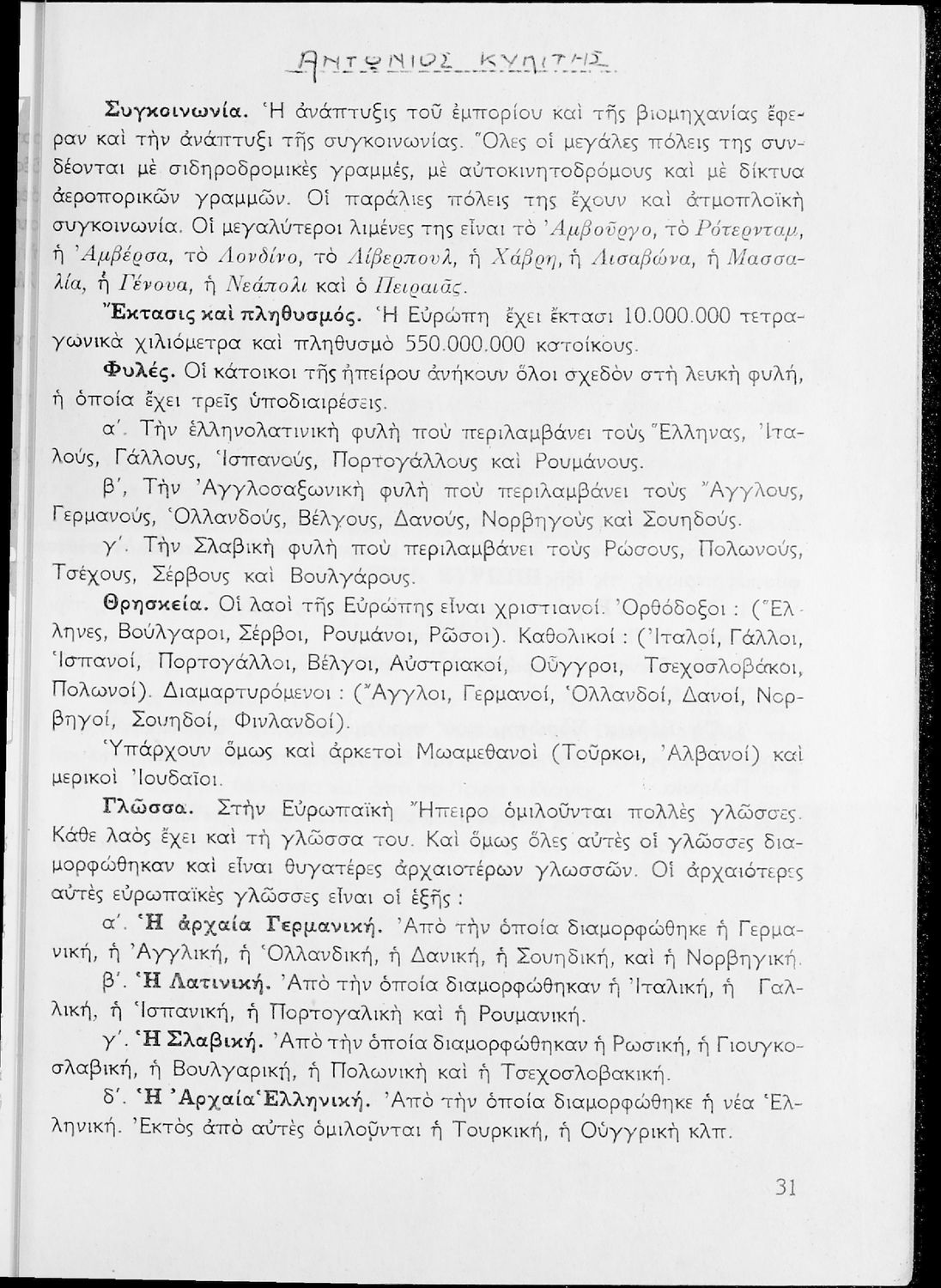 Μαθητικό βοήθημα Γεωγραφίας ΣΤ΄ Γυμνασίου που περιέχει στοιχεία φυσικής και μαθηματικής γεωγραφίας και εξετάζει τα κράτη της Ευρώπη από γεωφυσική, πολιτική και οικονομική άποψη. Περιλαμβάνει και στοιχεία ανθρωπογεωγραφίας.
